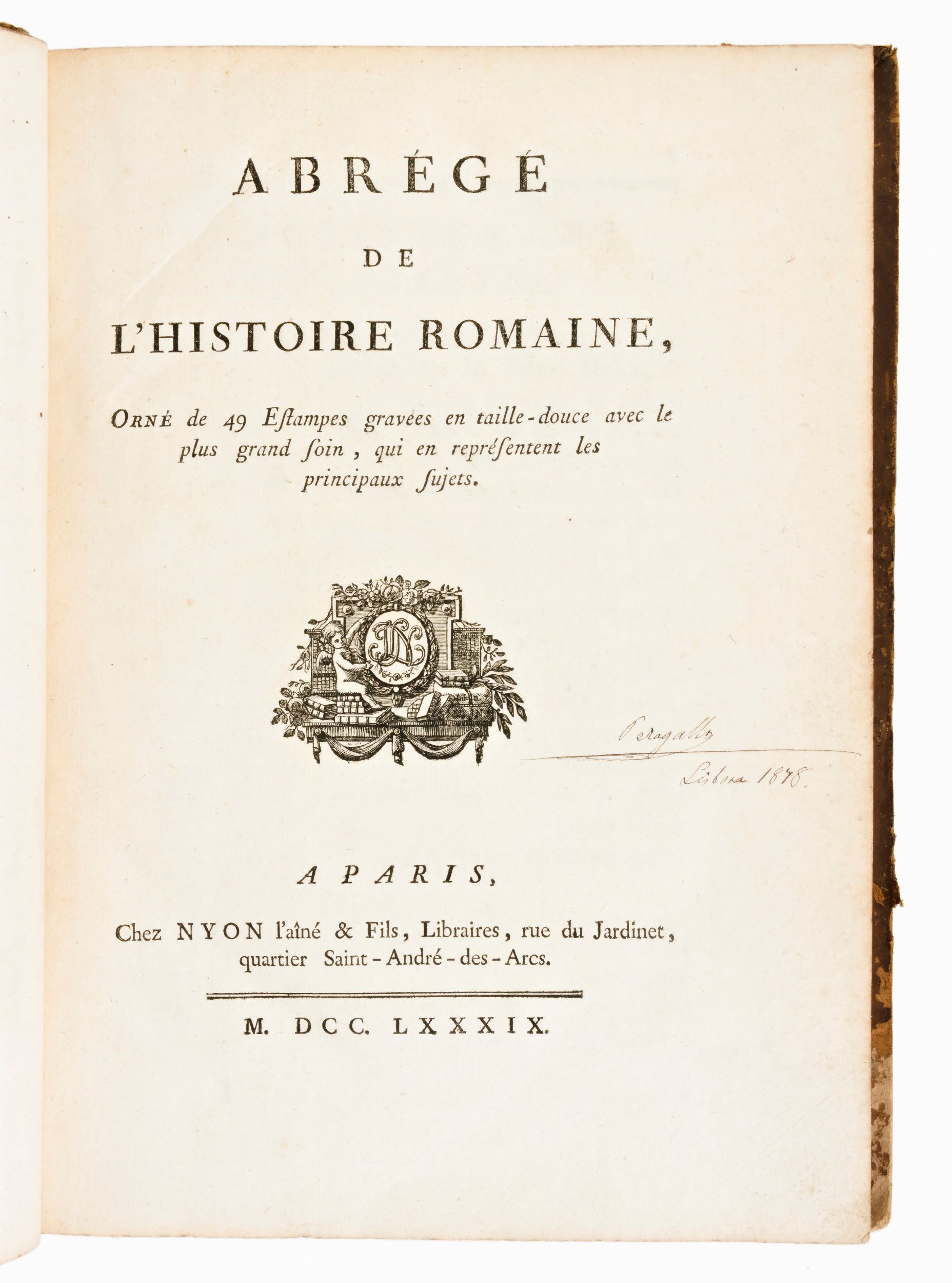 VIII, 192 p., 48 carte di tav. di cui 3 ripieg., 1 antip. : ill. calcogr. ; 4º Rilegatura coeva in piena pelle con titoli e fregi in oro al dorso. Alcune mancanze e leggere spellature ai piatti e al dorso. Carte e tavole in ottime condizioni con lievi fioriture. Antiporta calcografica dell'incisore Nicolas-Henri Tardieu (1674-1749), su disegno di Jean Baptiste Piauger (XVIII sec.). Edizione impressa in Parigi per Jean Luc Nyon il 1789. Con 48 tavole calcografiche fuori testo raffiguranti principalmente gli avvenimenti e i luoghi più memorabili dell'antica Roma. Testo francese. Capilettera e finalini xilografici.