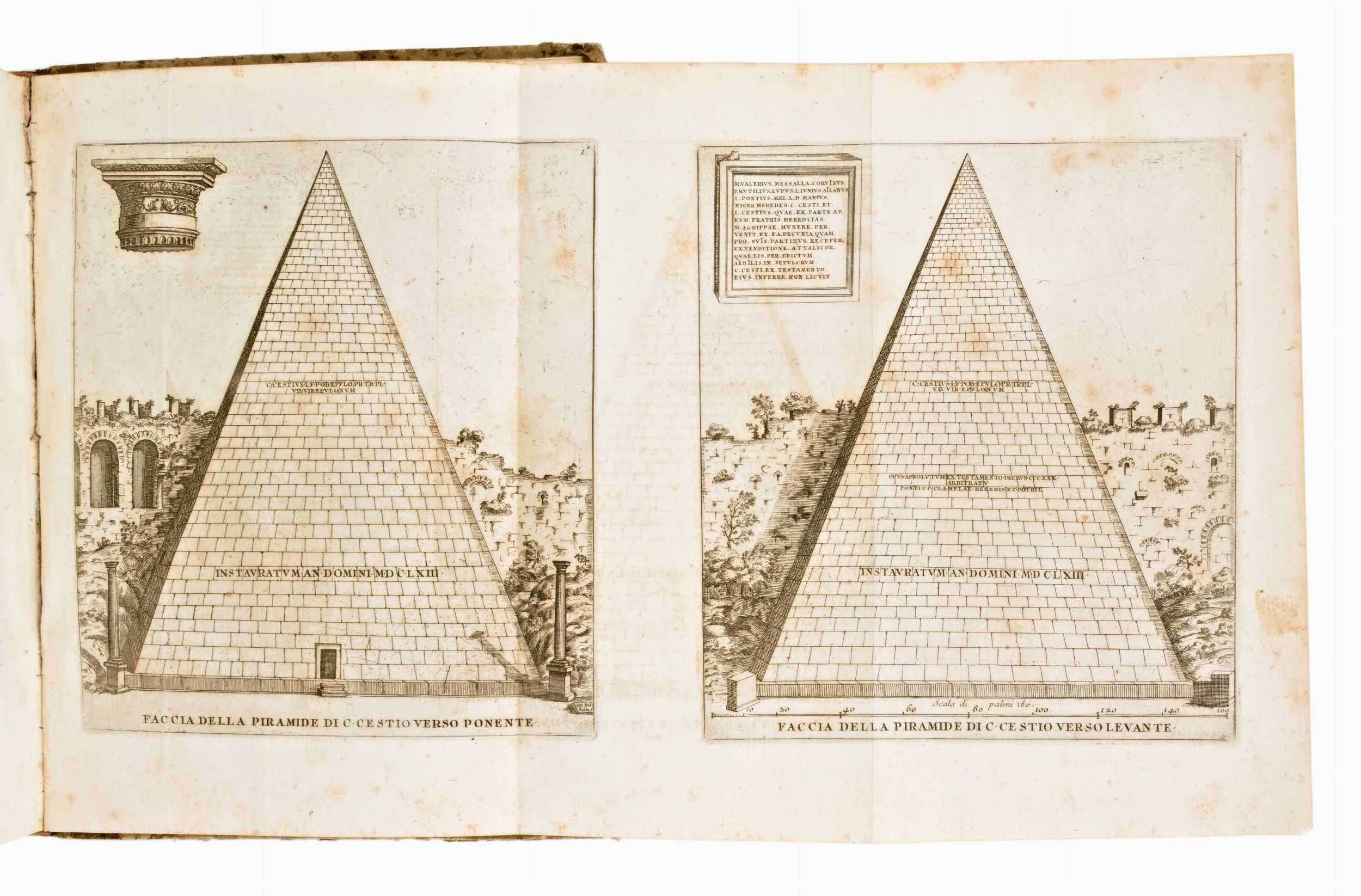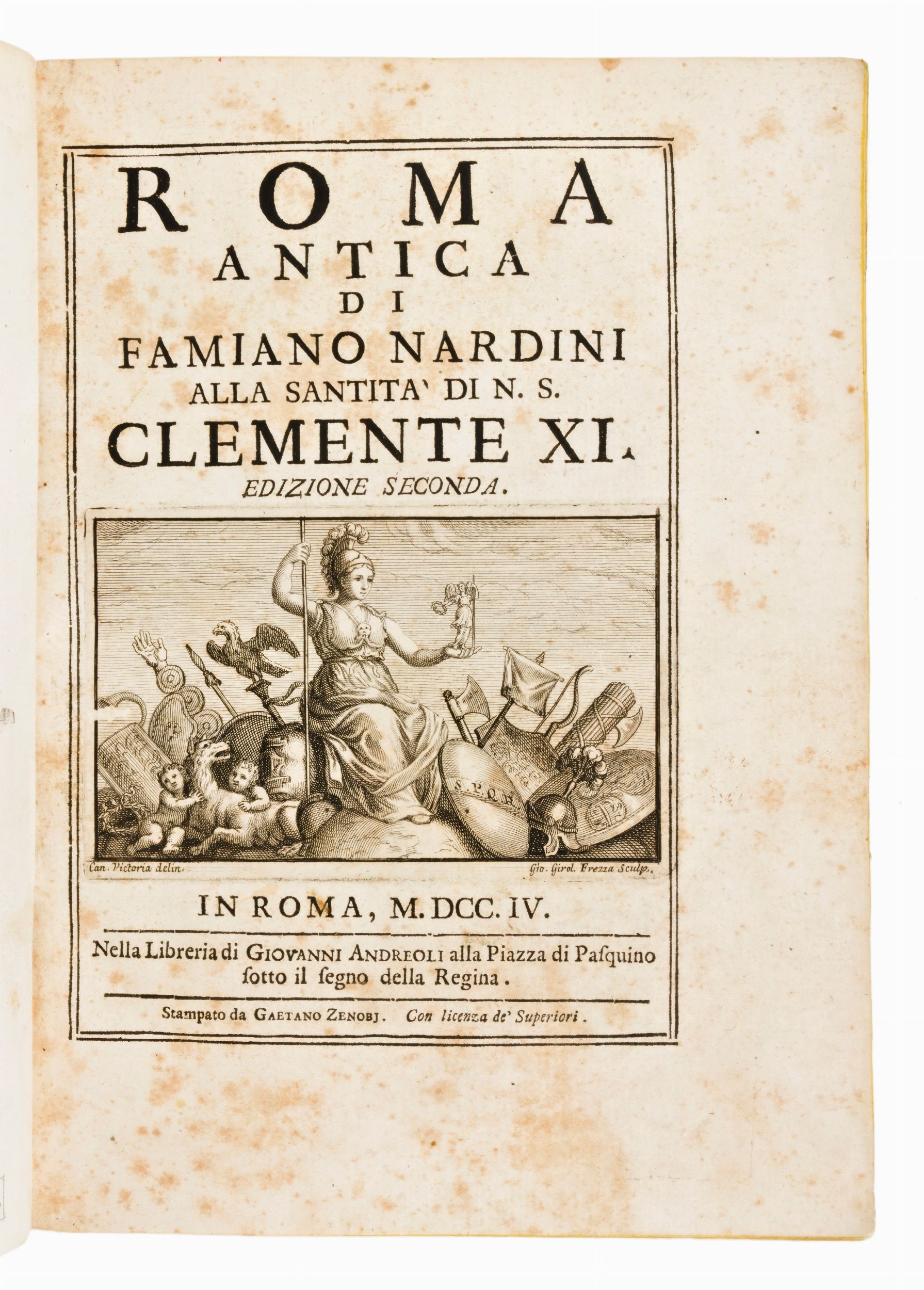 Roma, Andreoli, 1704. Vignetta calcografica al frontespizio incisa G. Girolamo Frezza, 6 tavole incise in rame ripiegate e numerose tavole a piena pagina, nel testo figure ed illustrazioni xilografiche, capilettera e fregi, fioriture e bruniture, lacuna al margine inferiore di M2, foro che interessa il testo a Hh5, alcune macchie e aloni, legatura coeva in mezza pergamena con titolo entro tassello rosso al dorso, lievi difetti. In-4°, mm. 245x195, pp. (18), 583, 24.