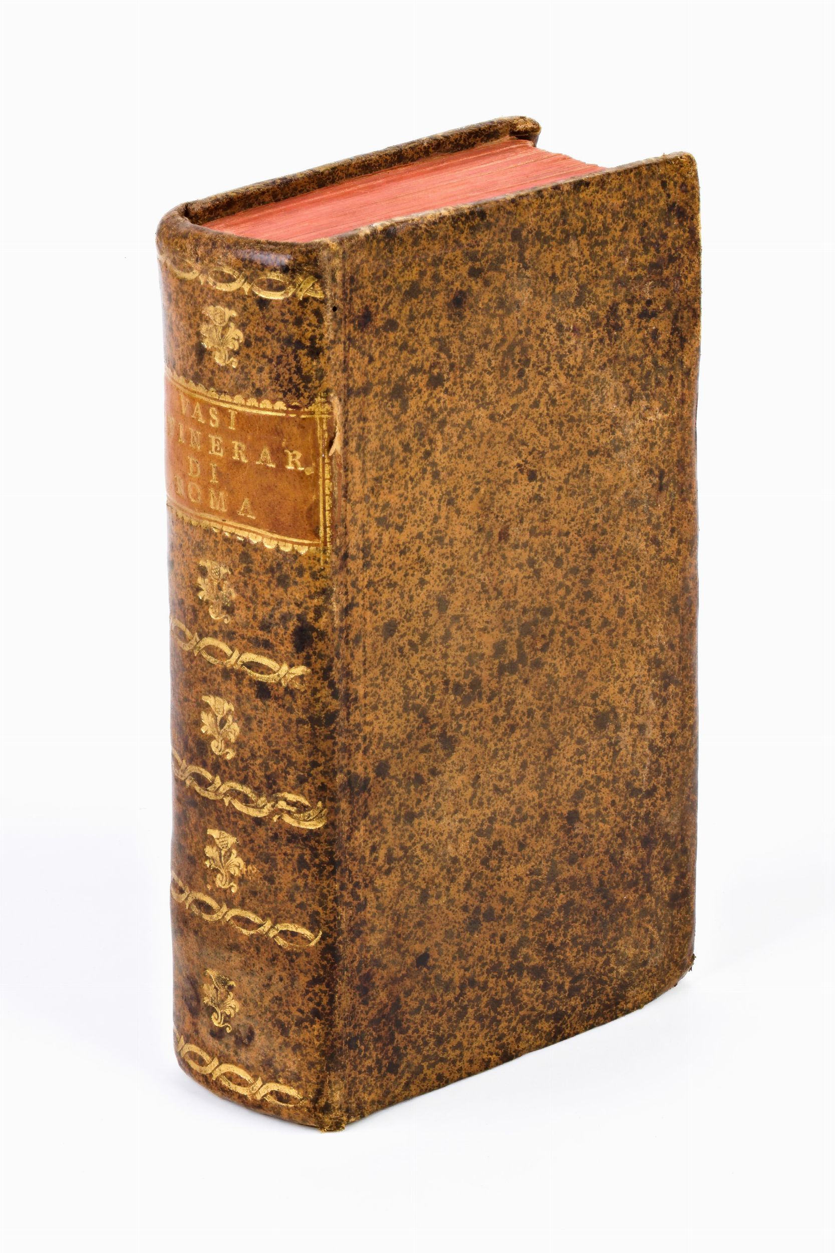 In-12°, mm. 155x95, pp. (8), 584, 14 carte di tav. Completo. Rilegatura Elegante rilegatura post. (XIX sec.) in piena pelle con titoli e fregi in oro al dorso. Tagli delle carte in rosso. Risguardi in carta decorativa antica. Ottimo stato di conservazione, con lievi fioriture e minimi segni del tempo alle carte/tavole. Terza edizione (corretta & accresciuta) impressa in Roma il 1777 per Arcangelo Casaletti, della celebre guida di Roma con le illustrazioni del noto incisore italiano Giuseppe Vasi (1710-1782), con itinerario di otto giorni dove descrive e illustra i vari monumenti più conosciuti di Roma. Riccamente illustrato con numerose figure in calcografia nel testo, 12 tavole e 2 mappe ripiegabili di Roma. ,