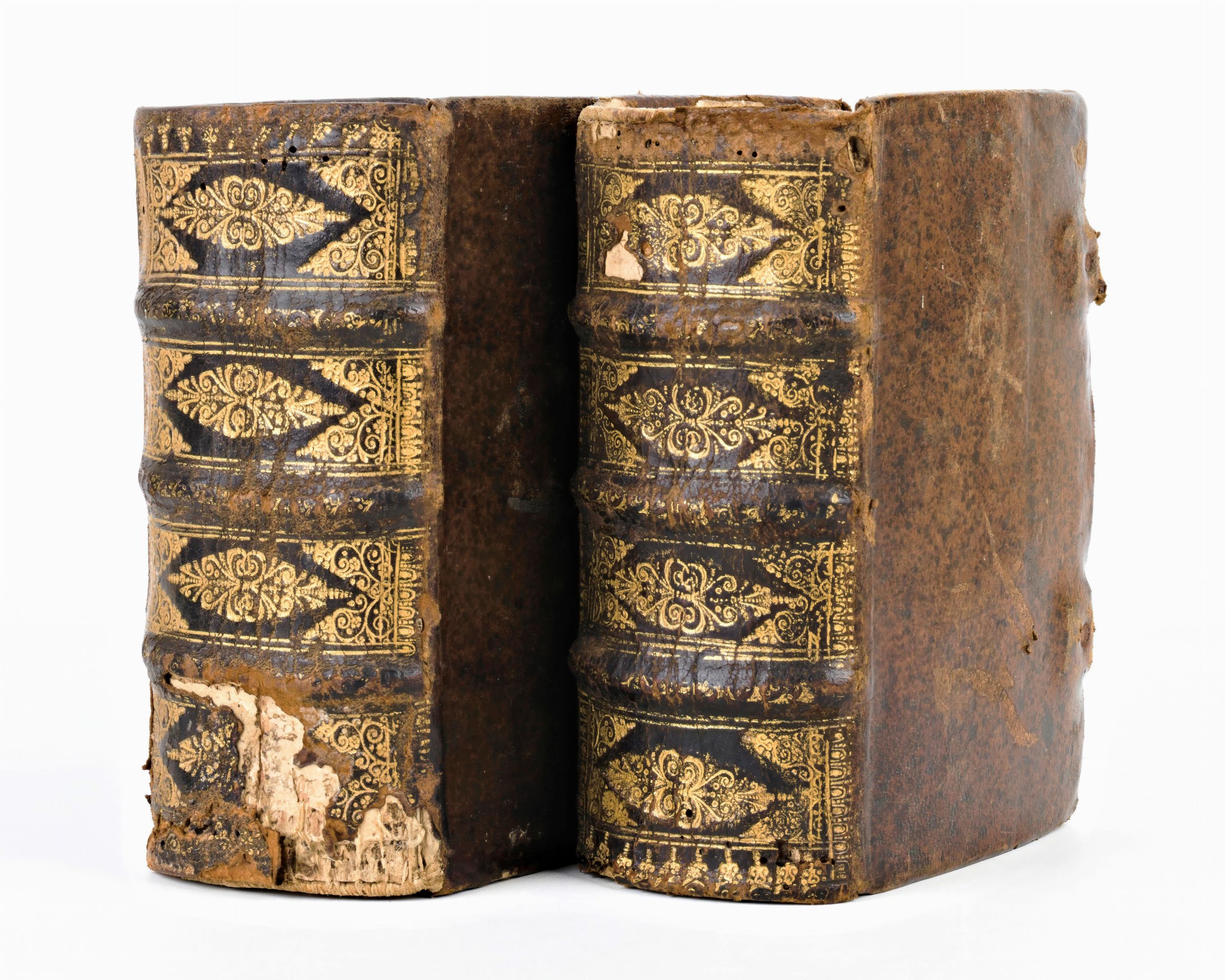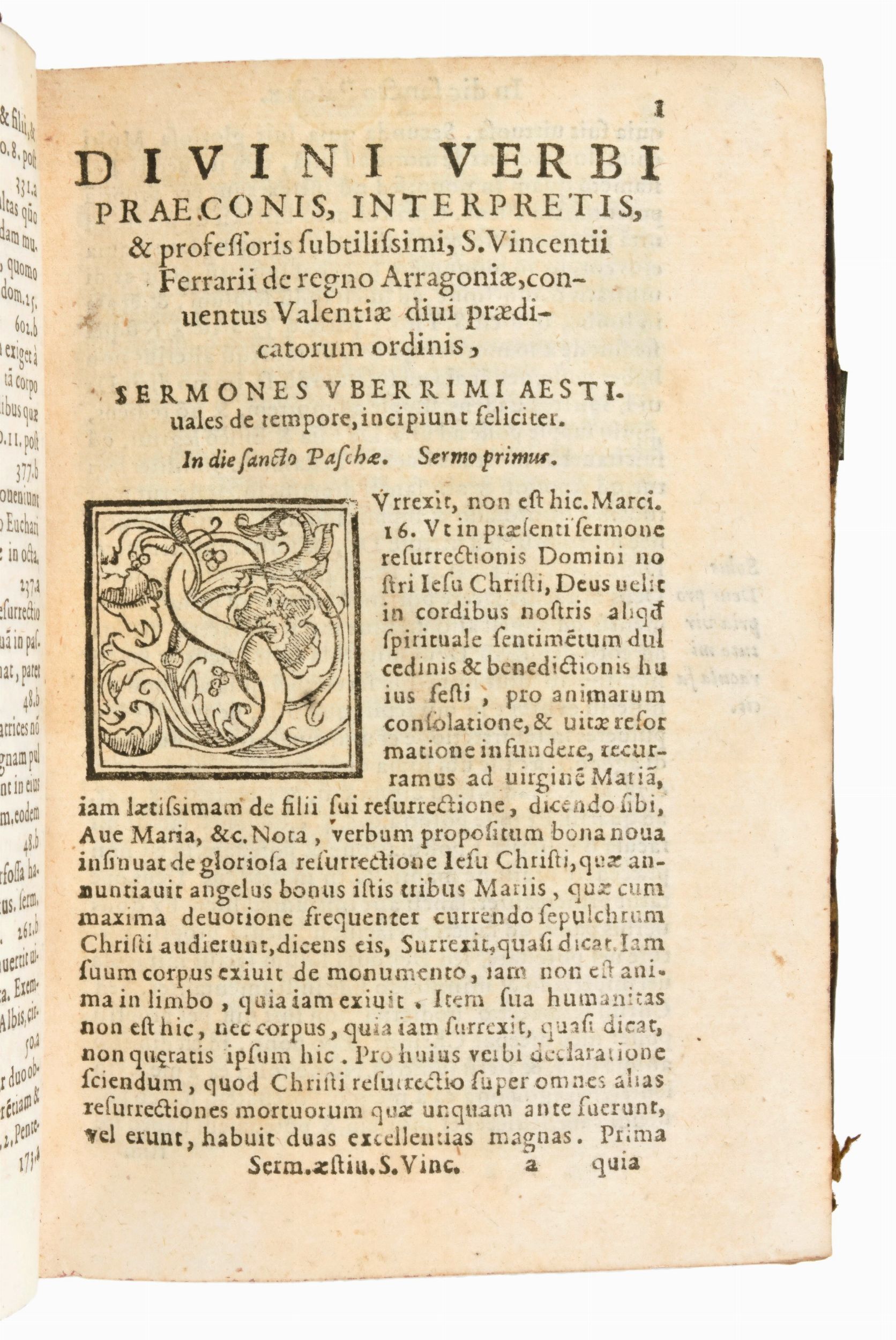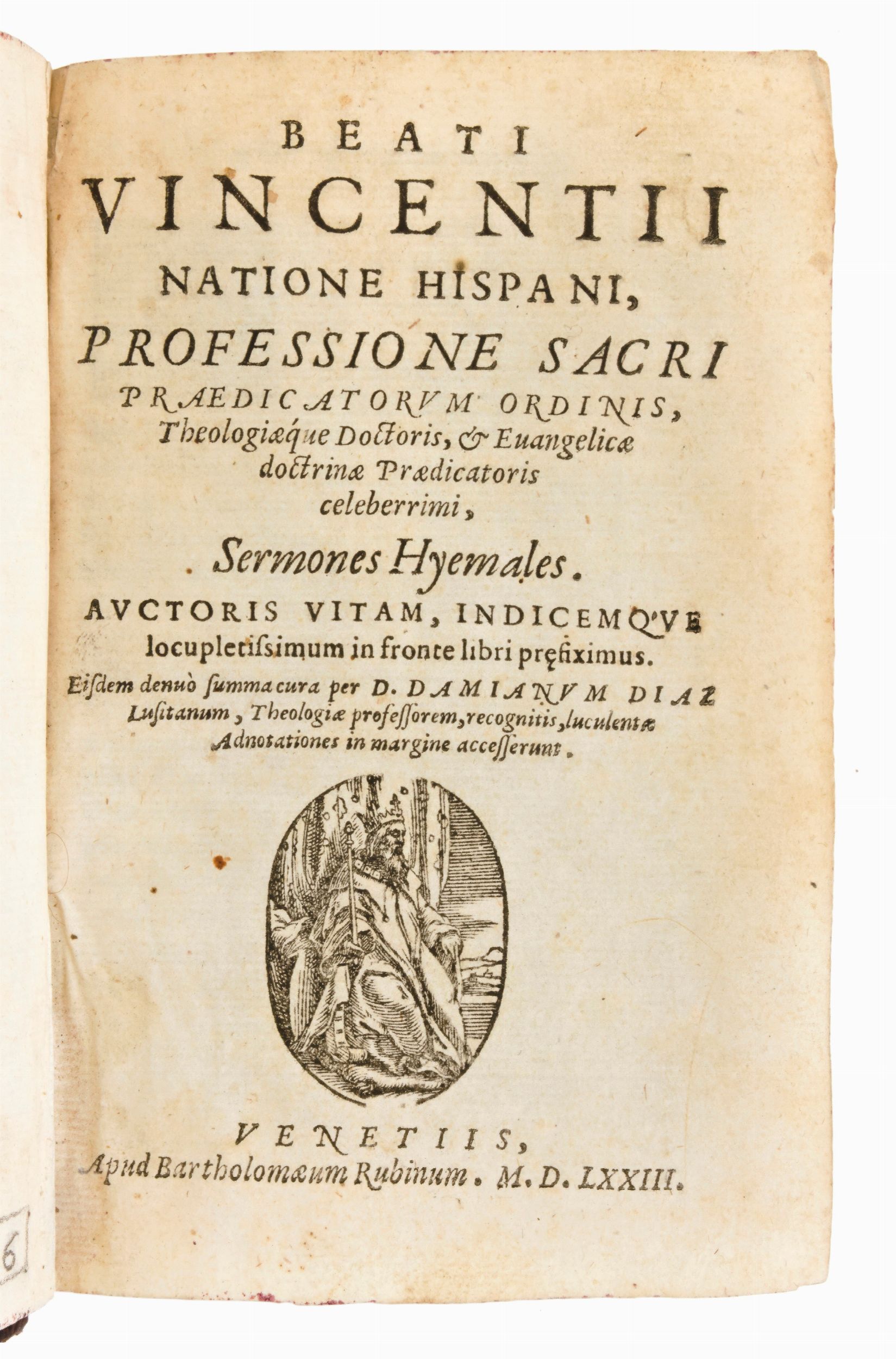 2 volumi. In-8°, mm. 150x110, cc. (20), 552 / cc. (16), 614. Rilegatura post. (XVII o XVIII sec.) in piena pelle con titoli in oro al dorso. Minimi difetti, mancanze e leggere spellature (ganci in pelle mancanti). Tagli rifilati, a toccare alcune numerazioni del testo. Sporadiche fioriture. Marca tipografica in xilografia ai frontespizi ( Re con scettro e corona assiso in trono). Sermoni Hyemales-Aestivales (Invernali & Estivi) del Santo Vincenzo Ferreri (1350-1419), canonizzato l'anno 1455 da papa Callisto III. Cinquecentine imprese per Bartolomeo Rubini in Venezia il 1573, a cura del teologo Damian Diaz. Testo latino. Numerosi capilettera xilografici.