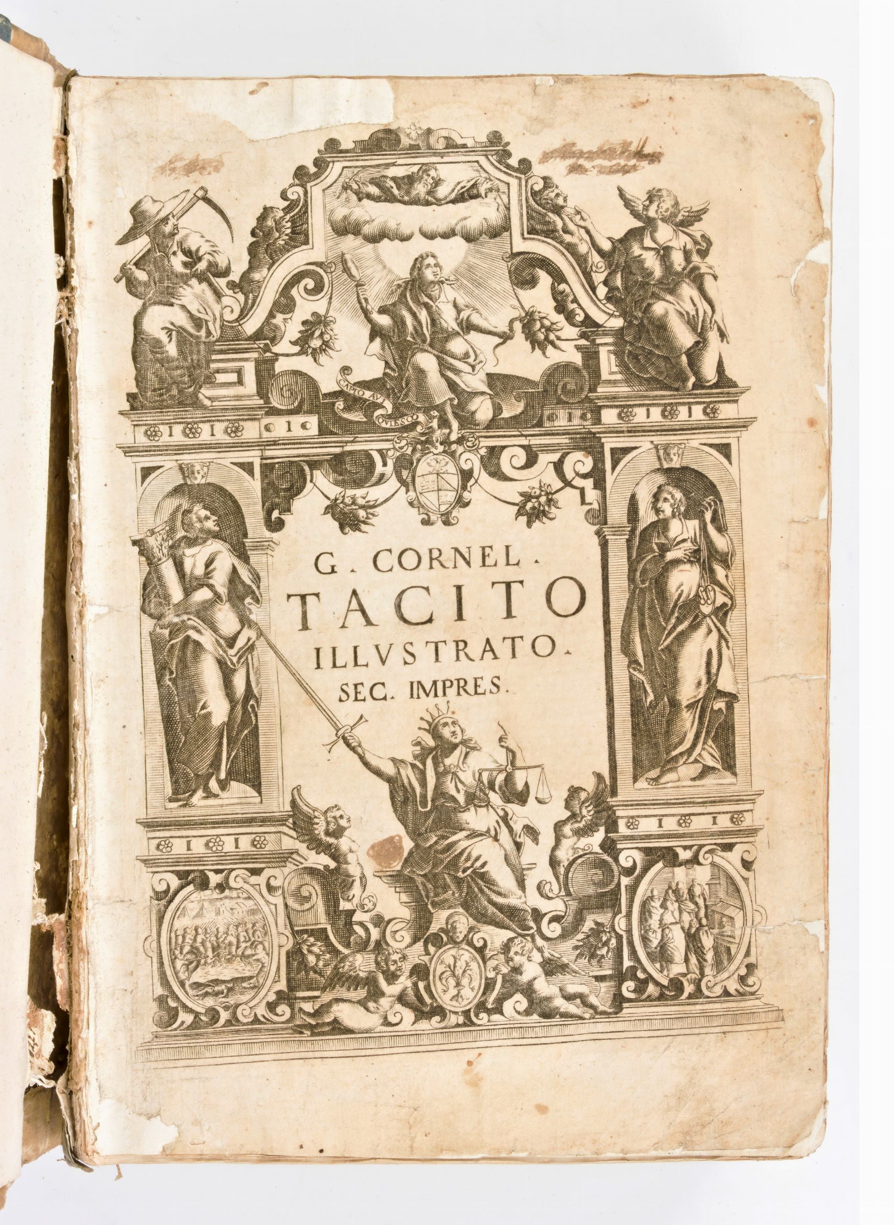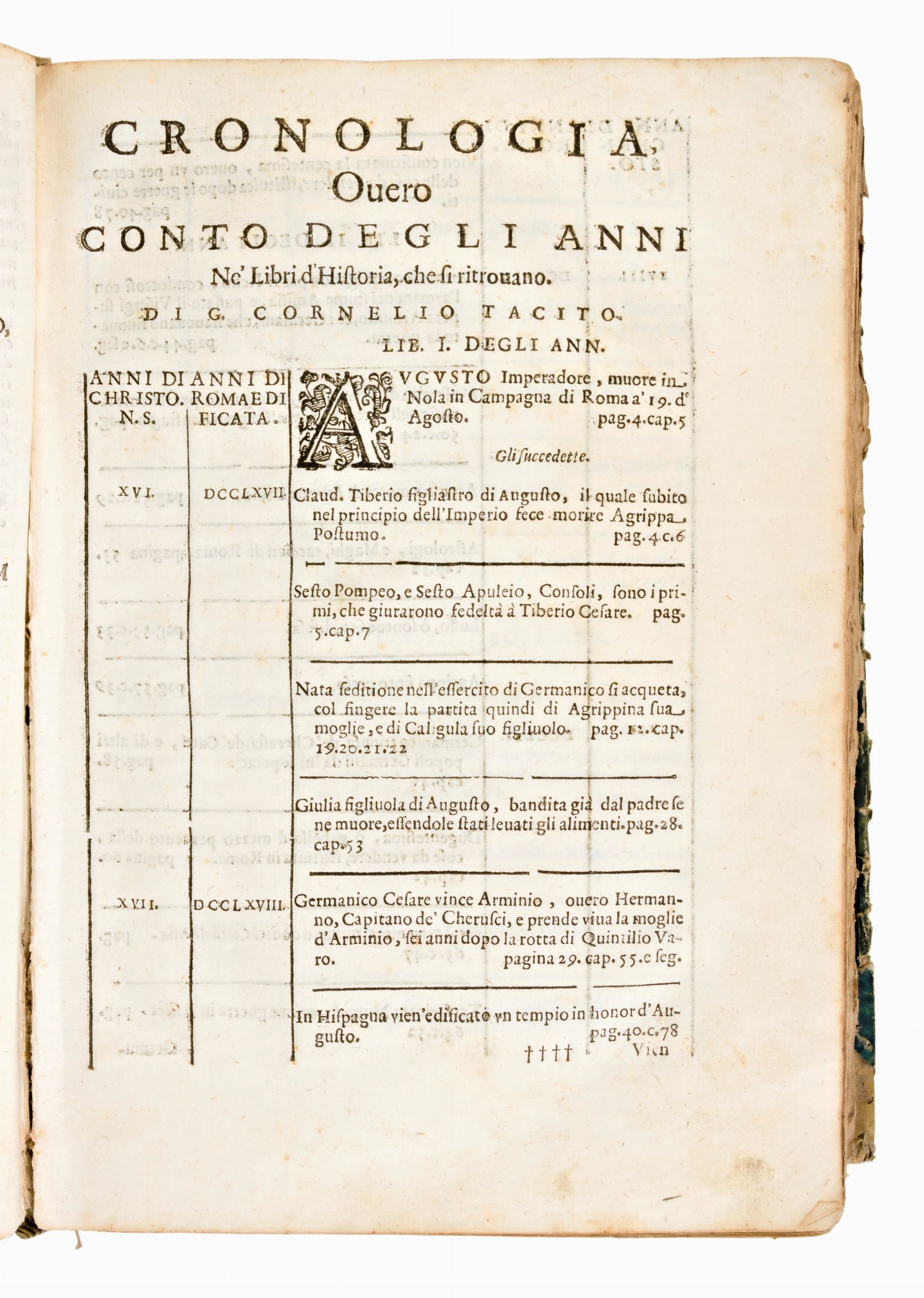 Opere di Tacito con gli aforismi dello spagnolo Baltasar Alamos de Barrientos (1555-1640), testo tradotto interamente in italiano dal linguista Girolamo Canini (1551-1631). Impresso in Venezia il 1628, per i Giunti. Antiporta xilografica restaurata (riapplicata su carta antica), frontespizio in rosso e nero con giglio in rosso. Presente mappa geografica a doppia pagina dell'Impero Romano. Capilettere e finalini xilogr. Rilegatura coeva in mezza pergamena con piatti rivestiti in carta marmorizzata. Titolo manoscritto al dorso. Formato in-4°, cm. 26x18, pp. (72), 544, (50), 83, (301).