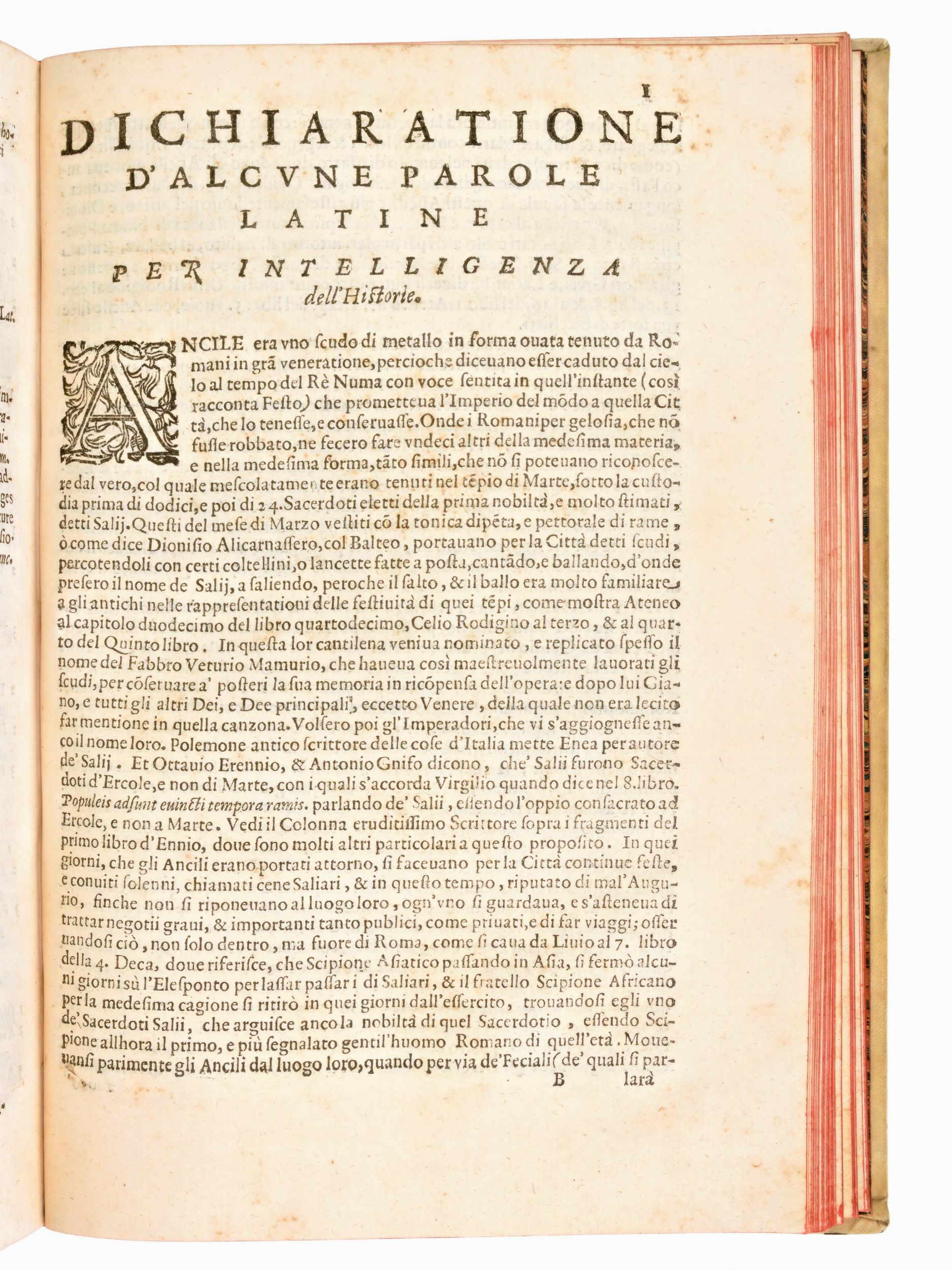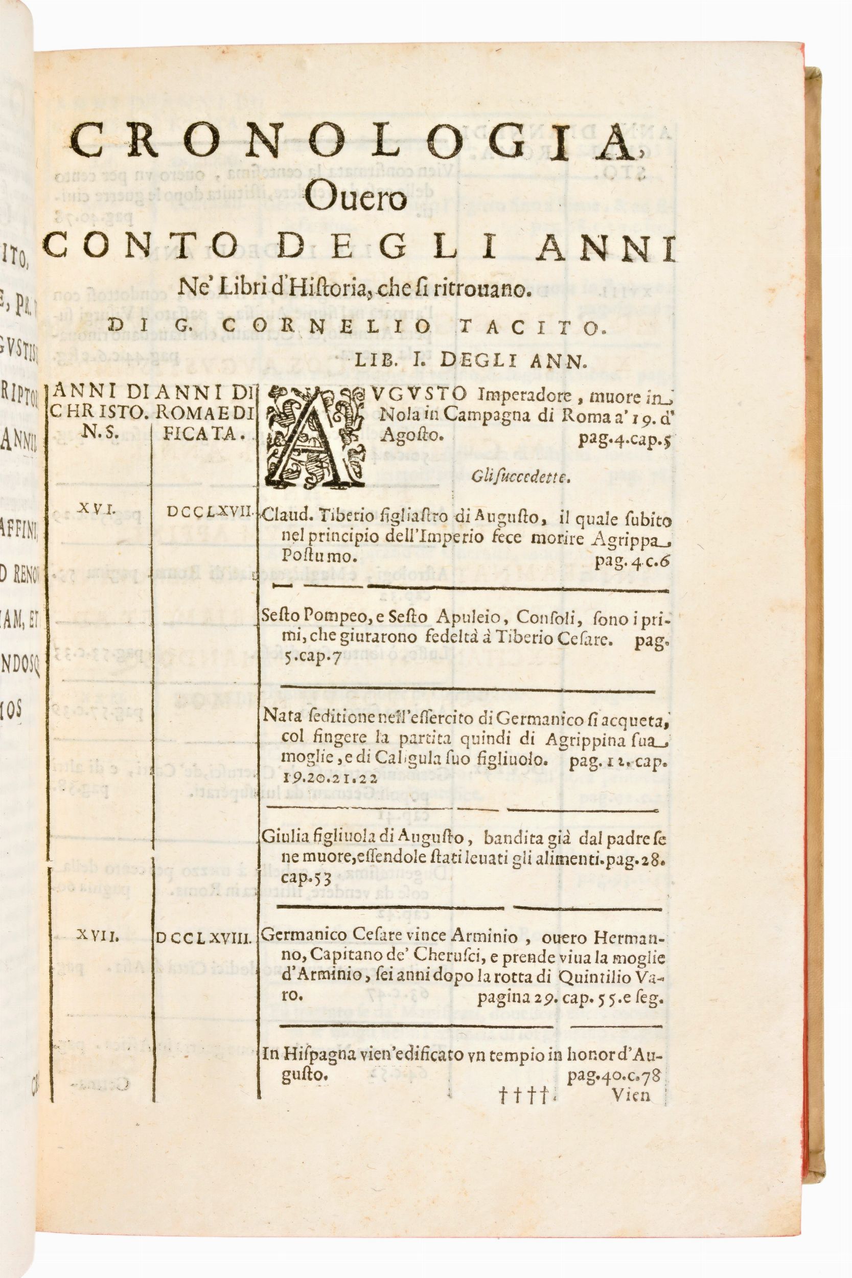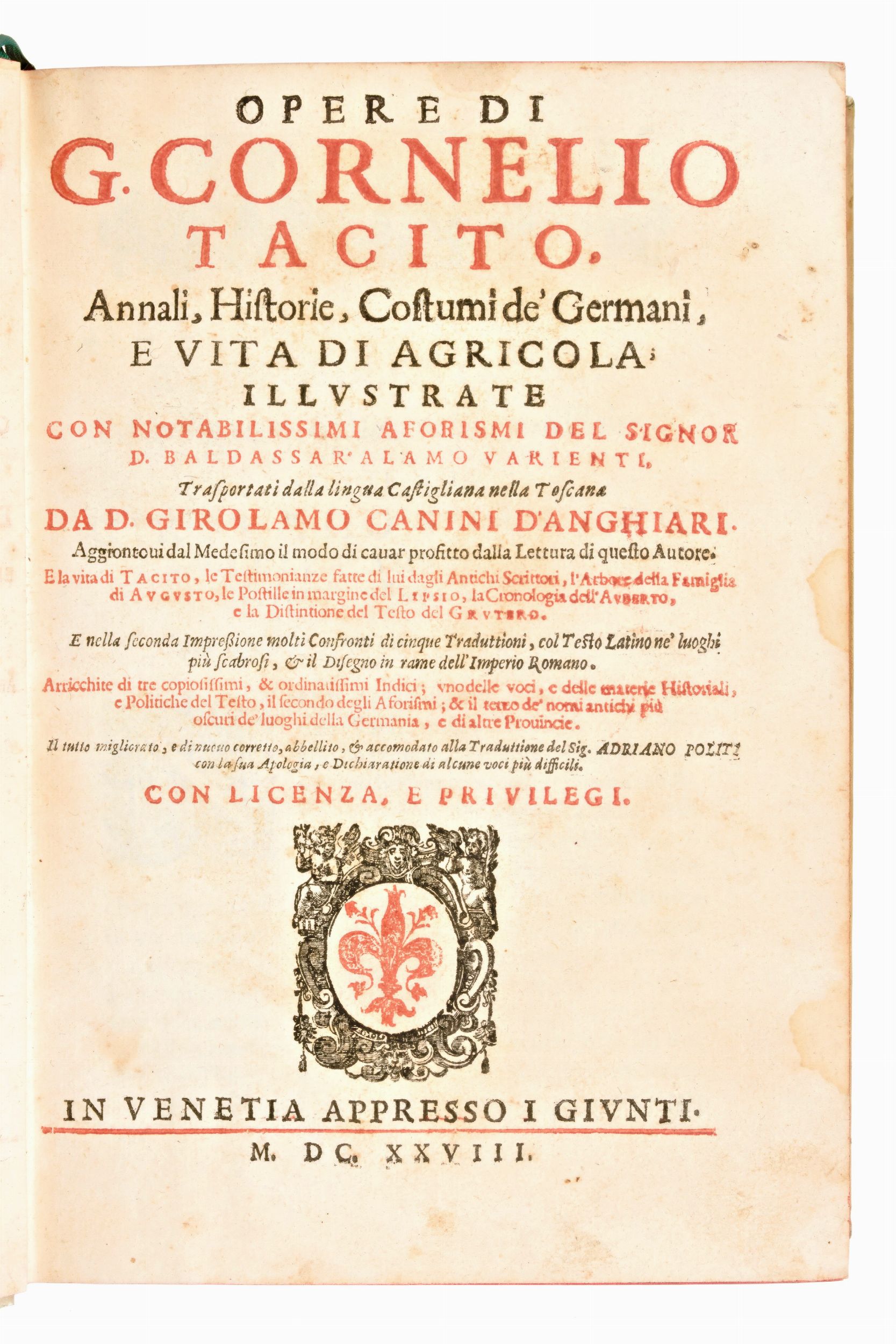 Formato in-8°, mm. 255x180, pp. (72), 544, (132), (168), (48), 83. Completo. Piccola macchia d'inchiostro alla carta cc7 con perdita di testo, lavoro di tarlo al margine inferiore dalla p. 61 alla p. 154 e al margine superiore dalla p. 195 alla p. 260. Piccoli fori all'antiporta xilografica con piccole mancanze. Frontespizio stampato in rosso e nero con il giglio in rosso. Carta geografica dell'Impero Romano a doppia pagina (Incisione). Capilettere e finalini xilografici nel testo. Presente ex libris Caroli Ceriana Mayneri su stemma applicato alla prima carta bianca. Elegante rilegatura post. in piena pergamena liscia con 5 nervature, titolo manoscritto al dorso, margini rifilati, tagli in rosso. Antica edizione seicentesca (in Venezia il 1628, per i Giunti) delle Opere di Tacito (Annali, Historia, Usi e Costumi Germanici e Vita di Agricola) con gli aforismi dello spagnolo Baltasar Alamos de Barrientos (1555-1640) tradotti in italiano dal linguista Girolamo Canini (1551-1631) e dal traduttore Andriano Politi (1542-1625). Con la tavola degli aforismi, tavola de luoghi comuni, confronti di alcuni luoghi e in fine la Dichiaratione d'alcune parole latine per intelligenzia dell'historie di Adriano Politi.