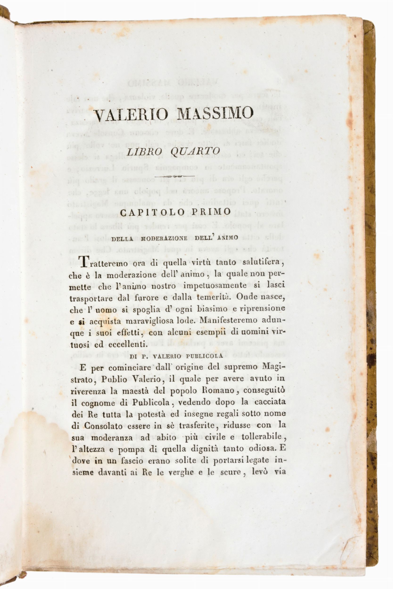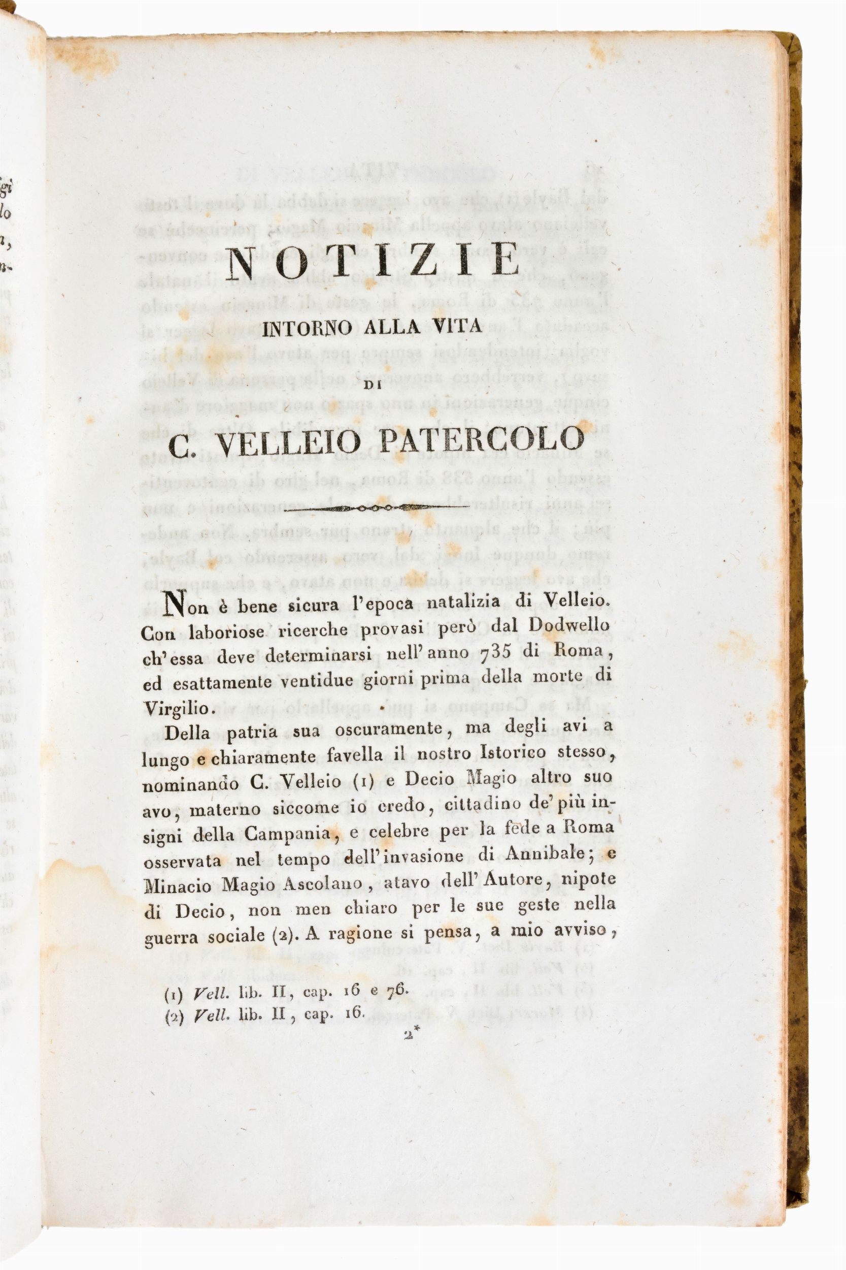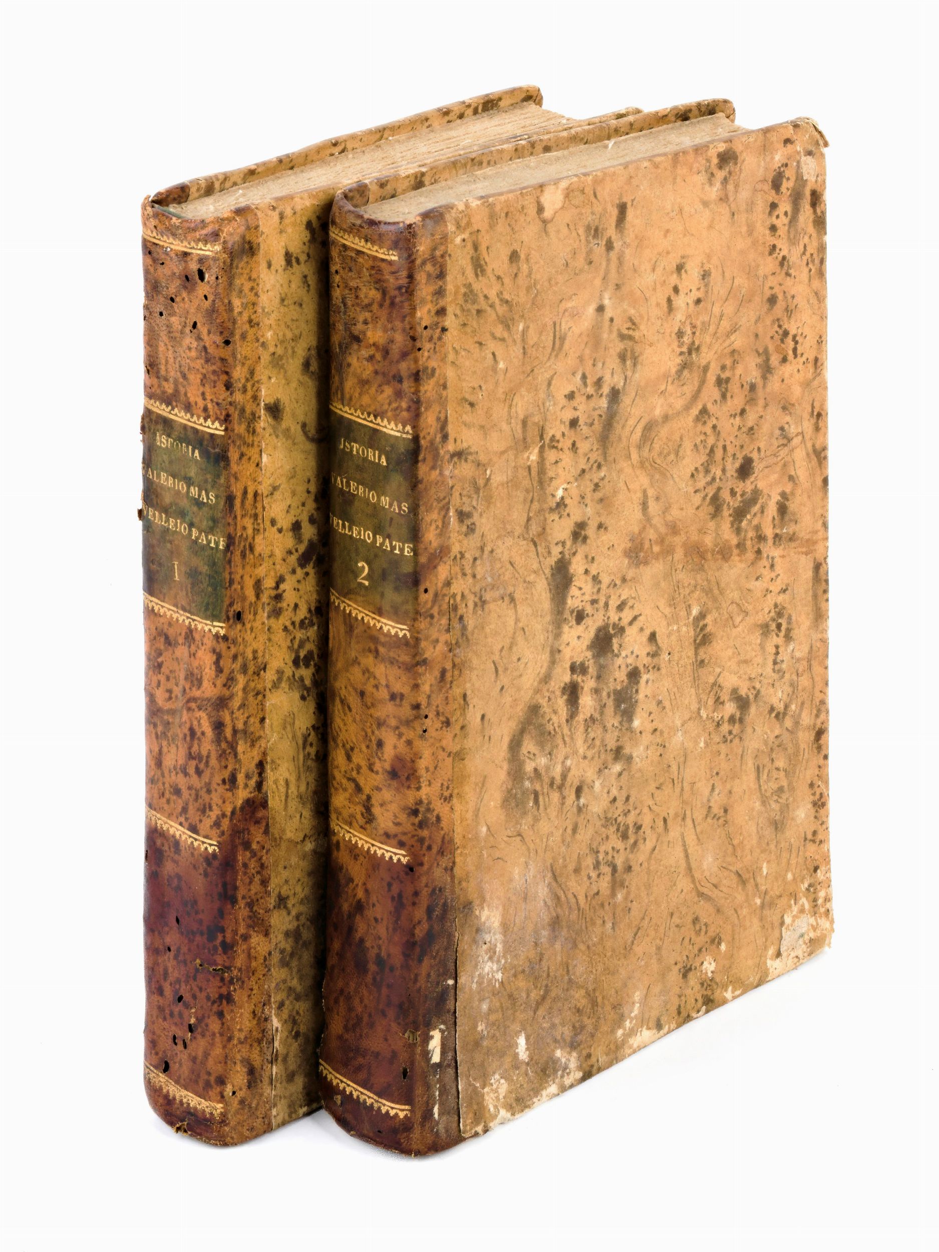 Formato in-8°, mm. 215x145, pp. XII, 404 / 443, (1). Completo. Rilegatura coeva in mezza pelle con piatti in carta antica decorata. Titoli in oro su tassello al dorso. Lieve gora al margine inferiore ad entrambi volumi. Sporadiche fioriture e minimi segni del tempo. Piccoli lavori di tarlo ai dorsi. Primo volume con errore di impaginazione del fascicolo 1 (pagine 1-8 invertite con le pagine 9-16). Terza edizione impressa in Milano il 1828 per Nicolò Bettoni, completa in 2 volumi. Traduzione in italiano dell'istoria romana libri due dello storico romano Gaio Velleio Patercolo (c. 19 a.C. - 30 d.C.) a cura di Spiridione Petrettini (1777-1833). Traduzione dei detti e fatti memorabili (Libri Nove) di Valerio Massimo (c. 1 sec. d.C.) a cura di Giorgio Dati (1506-1557).