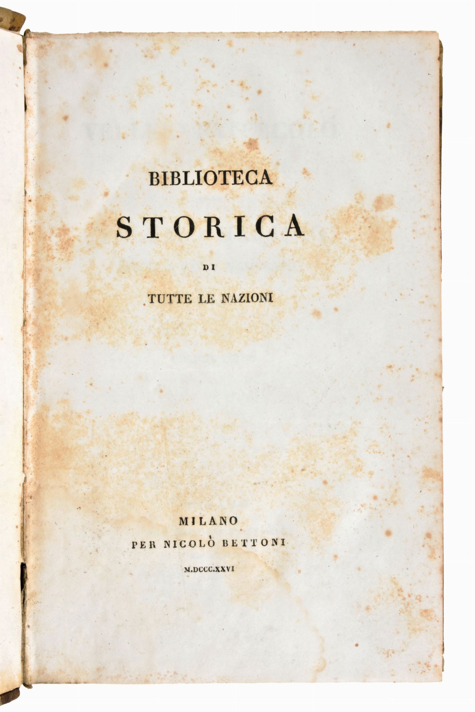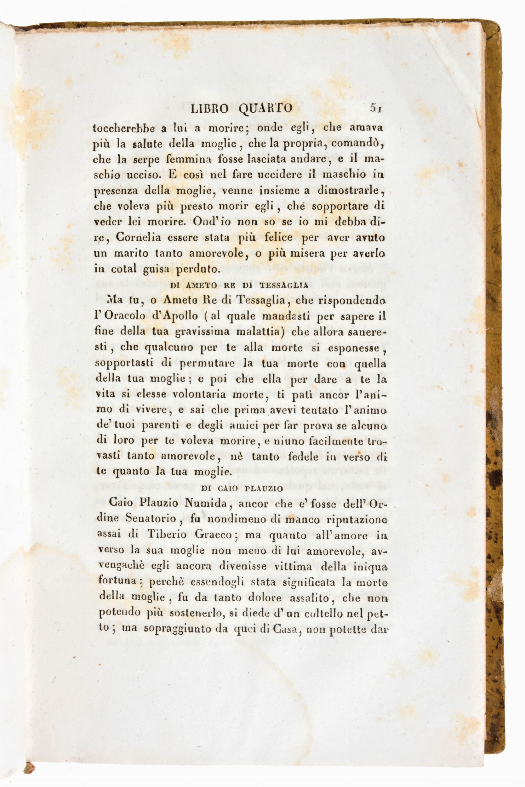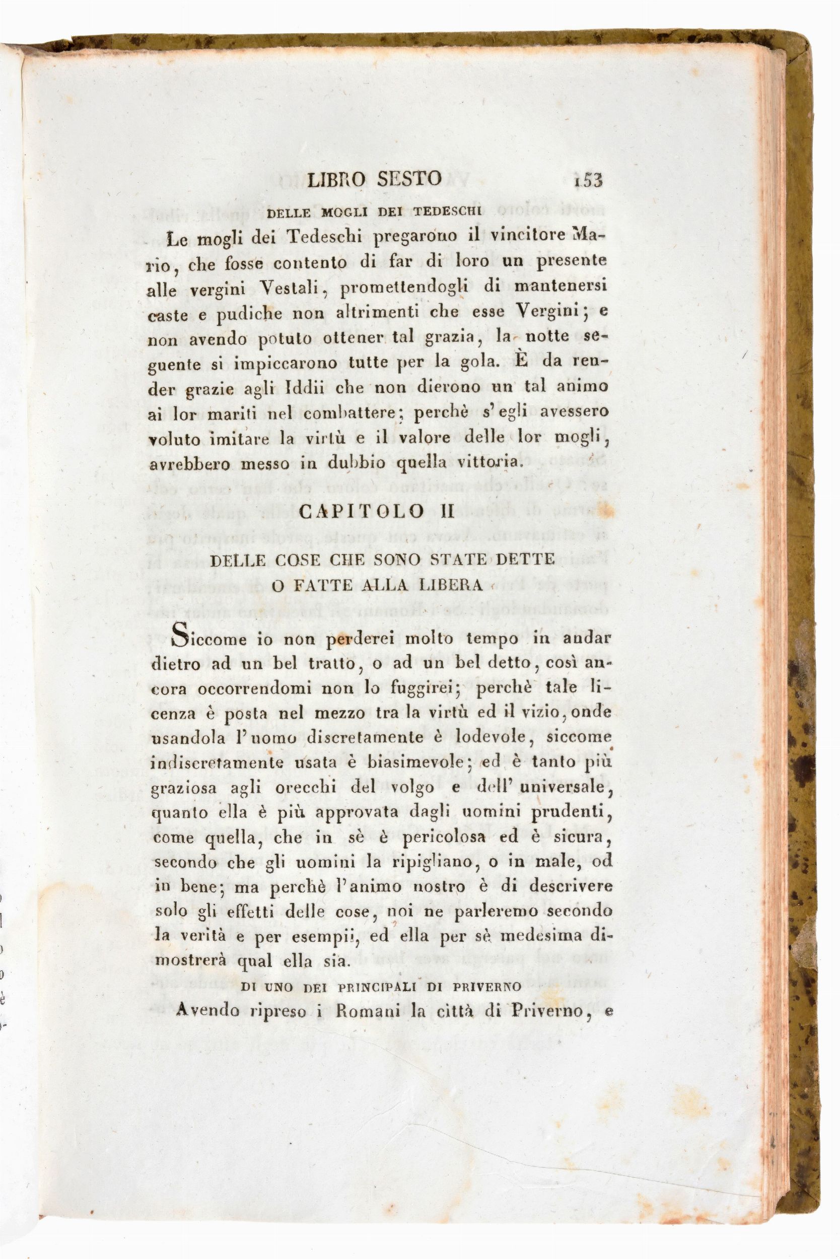 Formato in-8°, mm. 215x145, pp. XII, 404 / 443, (1). Completo. Rilegatura coeva in mezza pelle con piatti in carta antica decorata. Titoli in oro su tassello al dorso. Lieve gora al margine inferiore ad entrambi volumi. Sporadiche fioriture e minimi segni del tempo. Piccoli lavori di tarlo ai dorsi. Primo volume con errore di impaginazione del fascicolo 1 (pagine 1-8 invertite con le pagine 9-16). Terza edizione impressa in Milano il 1828 per Nicolò Bettoni, completa in 2 volumi. Traduzione in italiano dell'istoria romana libri due dello storico romano Gaio Velleio Patercolo (c. 19 a.C. - 30 d.C.) a cura di Spiridione Petrettini (1777-1833). Traduzione dei detti e fatti memorabili (Libri Nove) di Valerio Massimo (c. 1 sec. d.C.) a cura di Giorgio Dati (1506-1557).