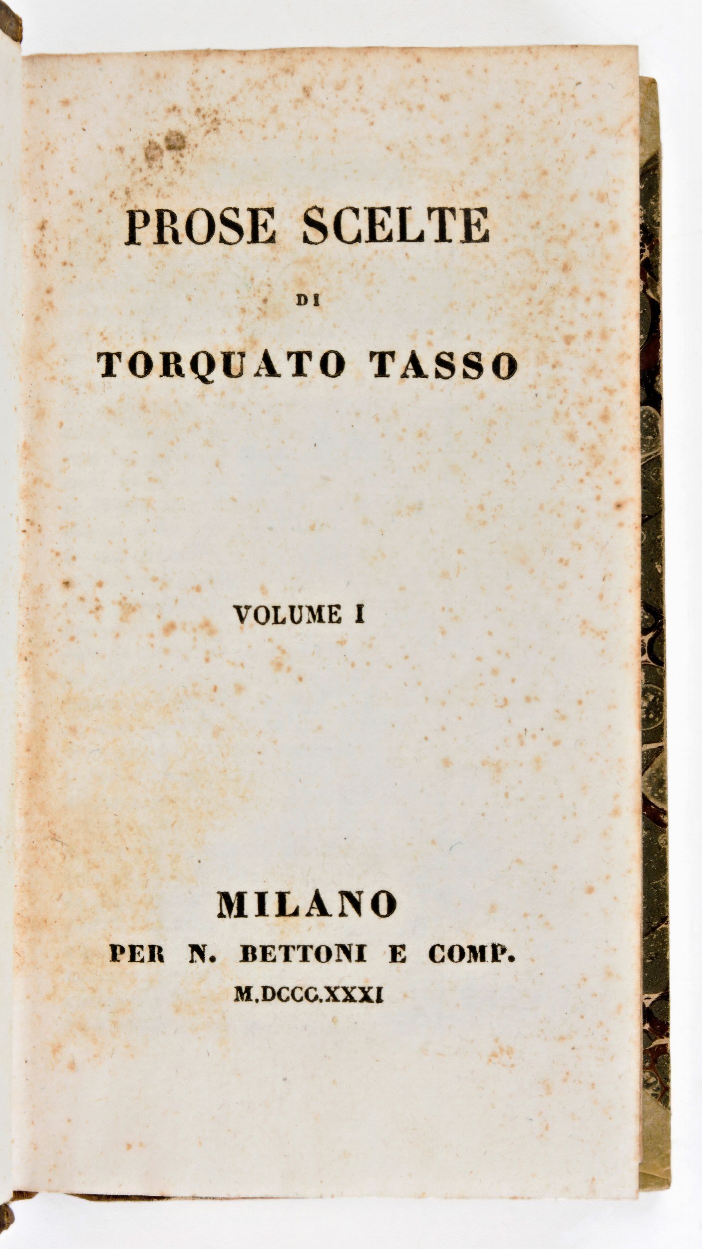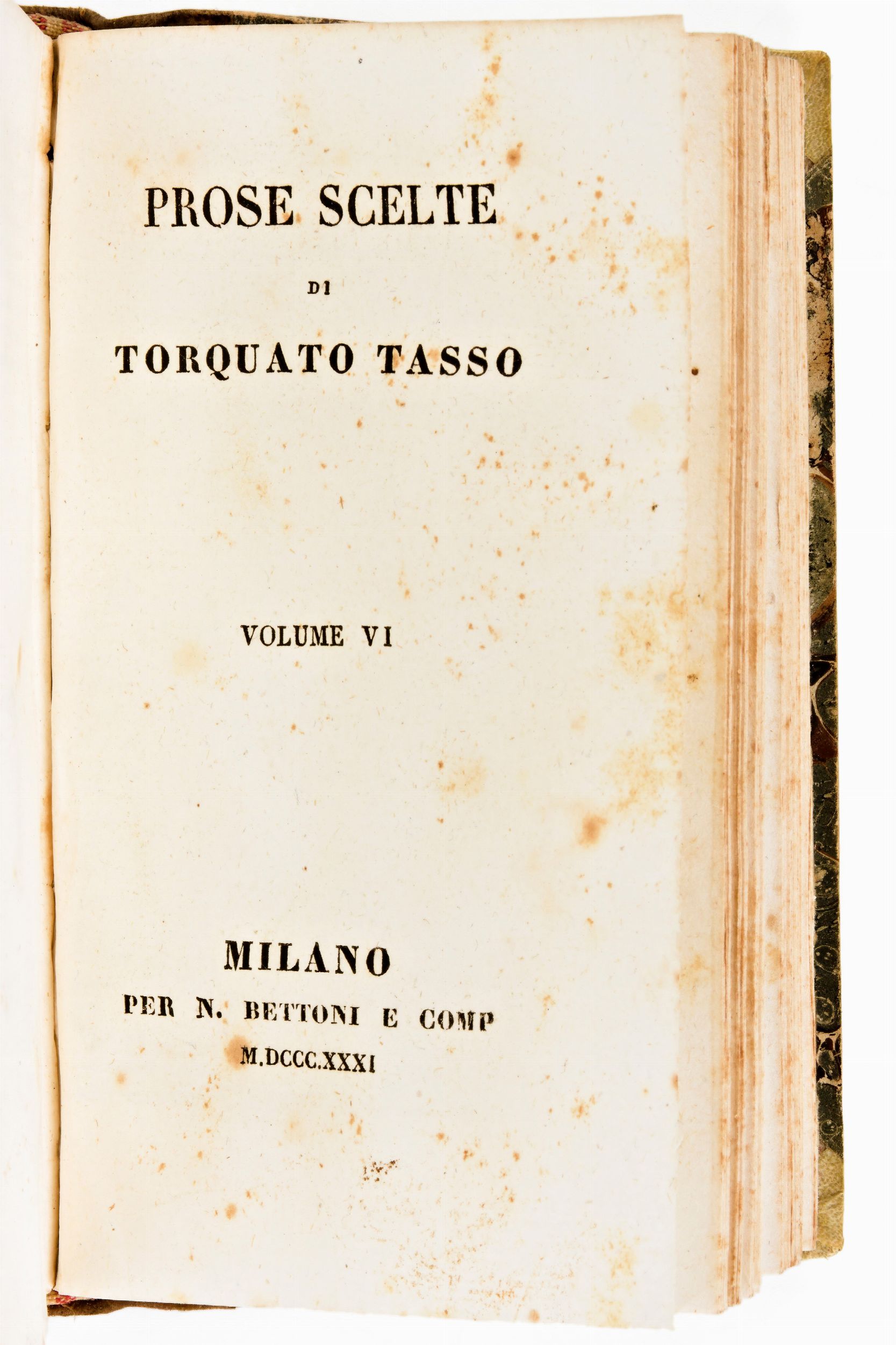 Formato in-8°, mm. 140x85, pp. 165, (3), 120, 206, (2) / 162, (2), 178, (2), 128. Opera completa in 6 tomi rilegati in 2 volumi con frontespizi conservati. Rilegatura coeva in mezza pelle con titoli in oro su tasselli di pelle al dorso. Piatti rivestiti in carta marmorizzata. Alcune carte sono intonse. Ottimo esemplare con lievi fioriture alle carte. Testo nitido. Antica edizione impressa in Milano il 1831 per N. Bettoni in 6 volumi. Raccolta degli scritti del celebre scrittore italiano Torquato Tasso (1544-1595), contiene : Discorso sul poema eroico libri VI, Allegoria della Gerusalemme liberata, Lettere poetiche, Risposta di Roma a Plutarco, Discorsi e Dialoghi.
