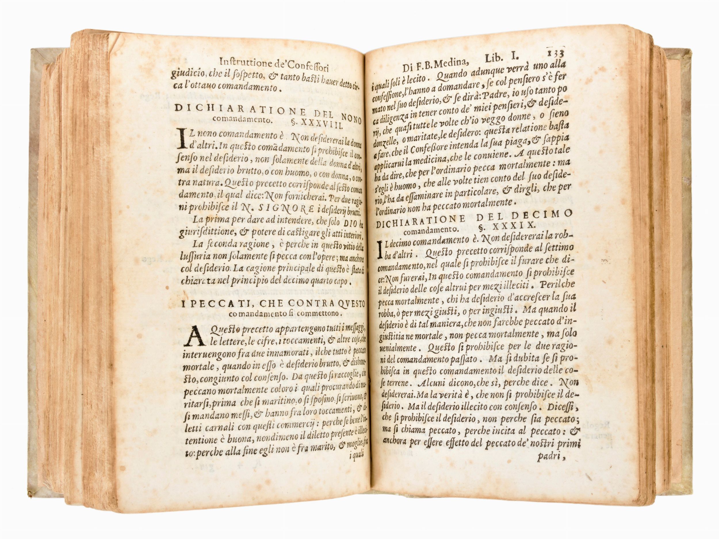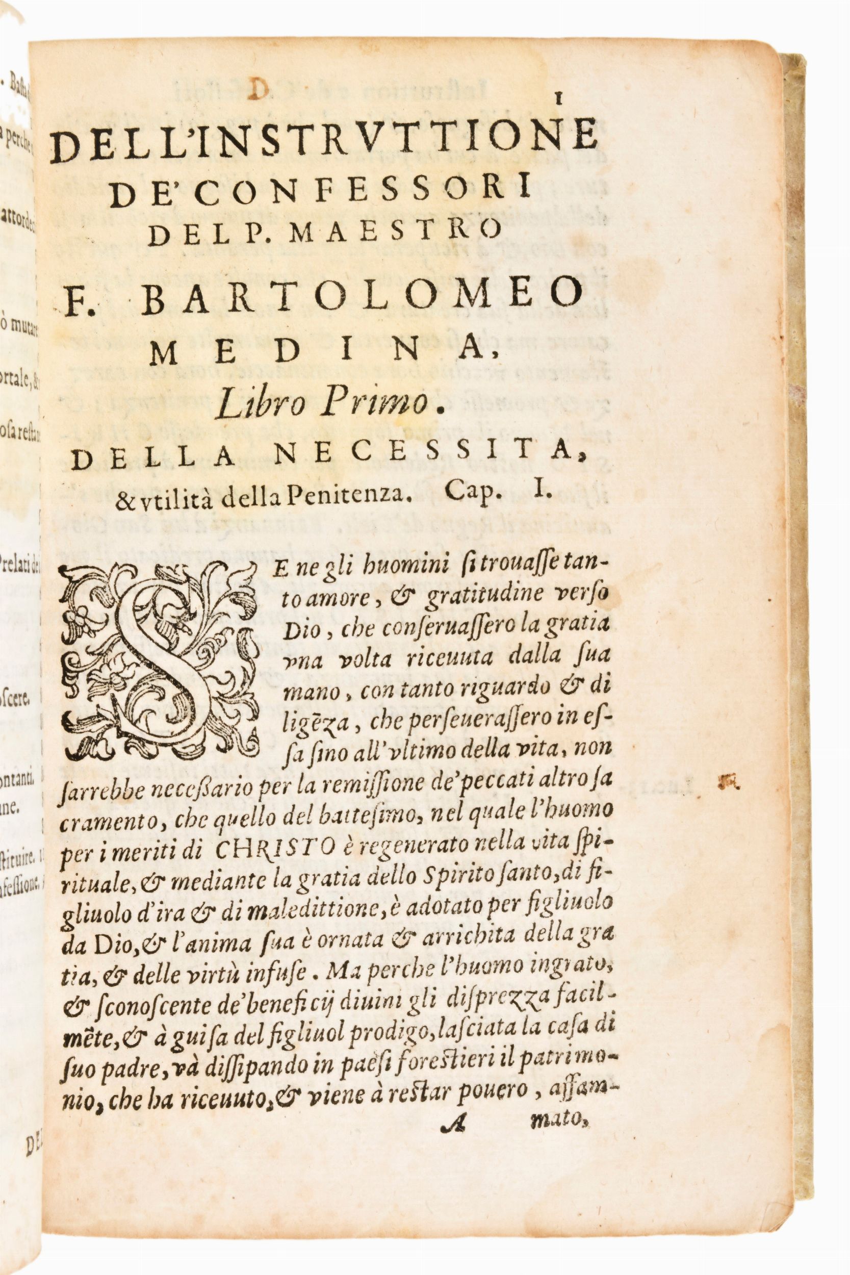 Formato in-8°, mm. 170x110, cc. (24), 239, (1). Completo. Rilegatura post. (XX sec.) in piena pergamena con titoli e lineature impresse a secco al dorso. Restauro agli angoli delle ultime 7 carte, lieve alone alle prime carte e leggera gora ai margini. Minimi difetti e sporadiche fioriture. Breue instruttione de' confessori, come si debba amministrare il sacramento della Penitentia. Divisa in due libri, del M.R.P.F. Bartolomeo de Medina, ... Nella qual si contiene tutto quello, che deve sapere, & fare il savio confessore per salvar l'anime, et tutto quello che debba haver il Penitente per conseguir il frutto di cosi mirabil Medicina. Nuovamente tradotta dalla lingua spagnuola nella italiana. Con due tavole copiosissime, & utilissime. Cinquecentina impressa in Roma il 1588 per Alessandro Gardano & Francesco Coattini Compagni, opera del teologo spagnolo Bartolomé de Medina (1527-1580). Traduzione in italiano di Petrus Gonzales (16 sec.). Marca tipografica al frontespizio e al colophon. Capilettera xilografici nel testo.