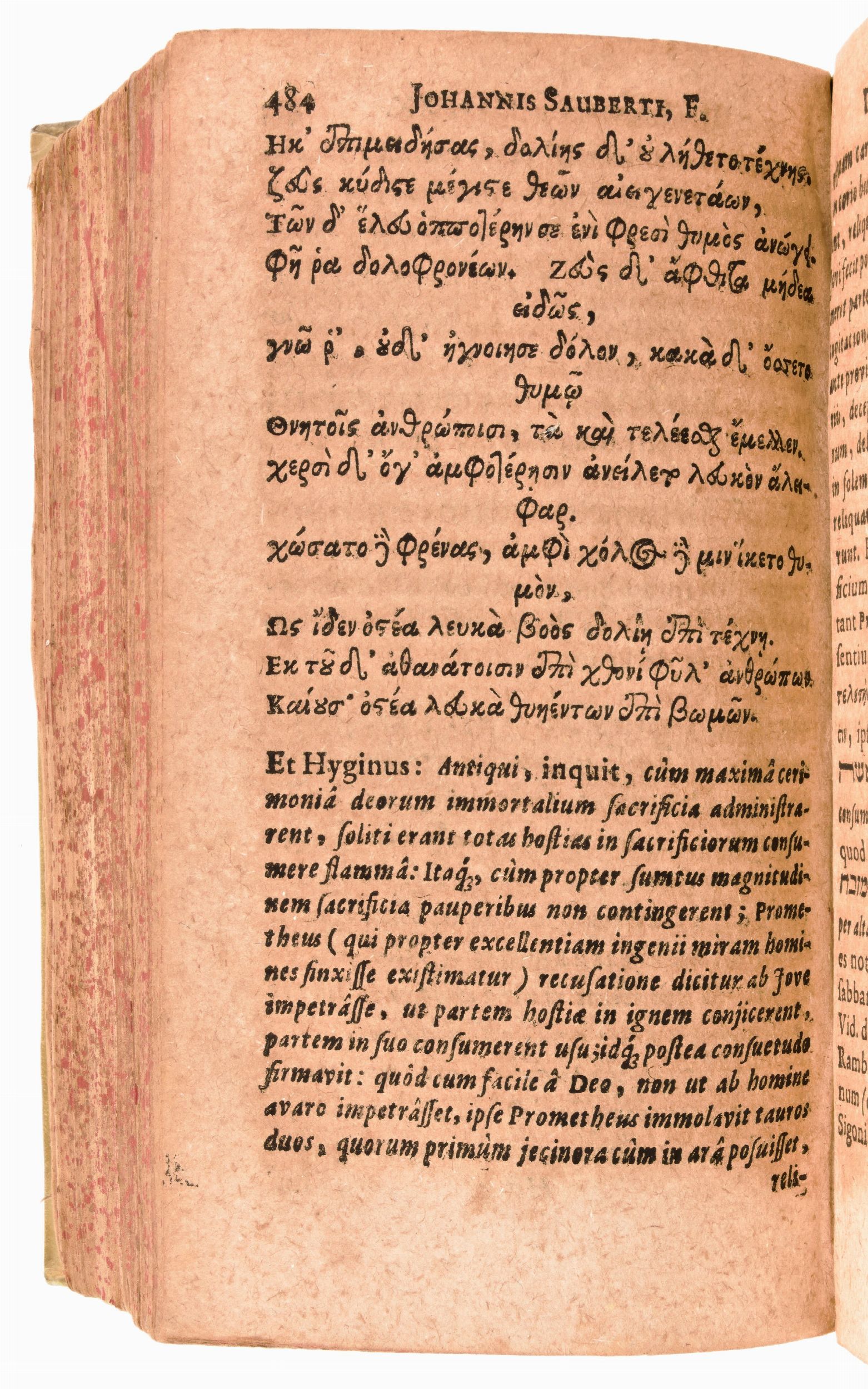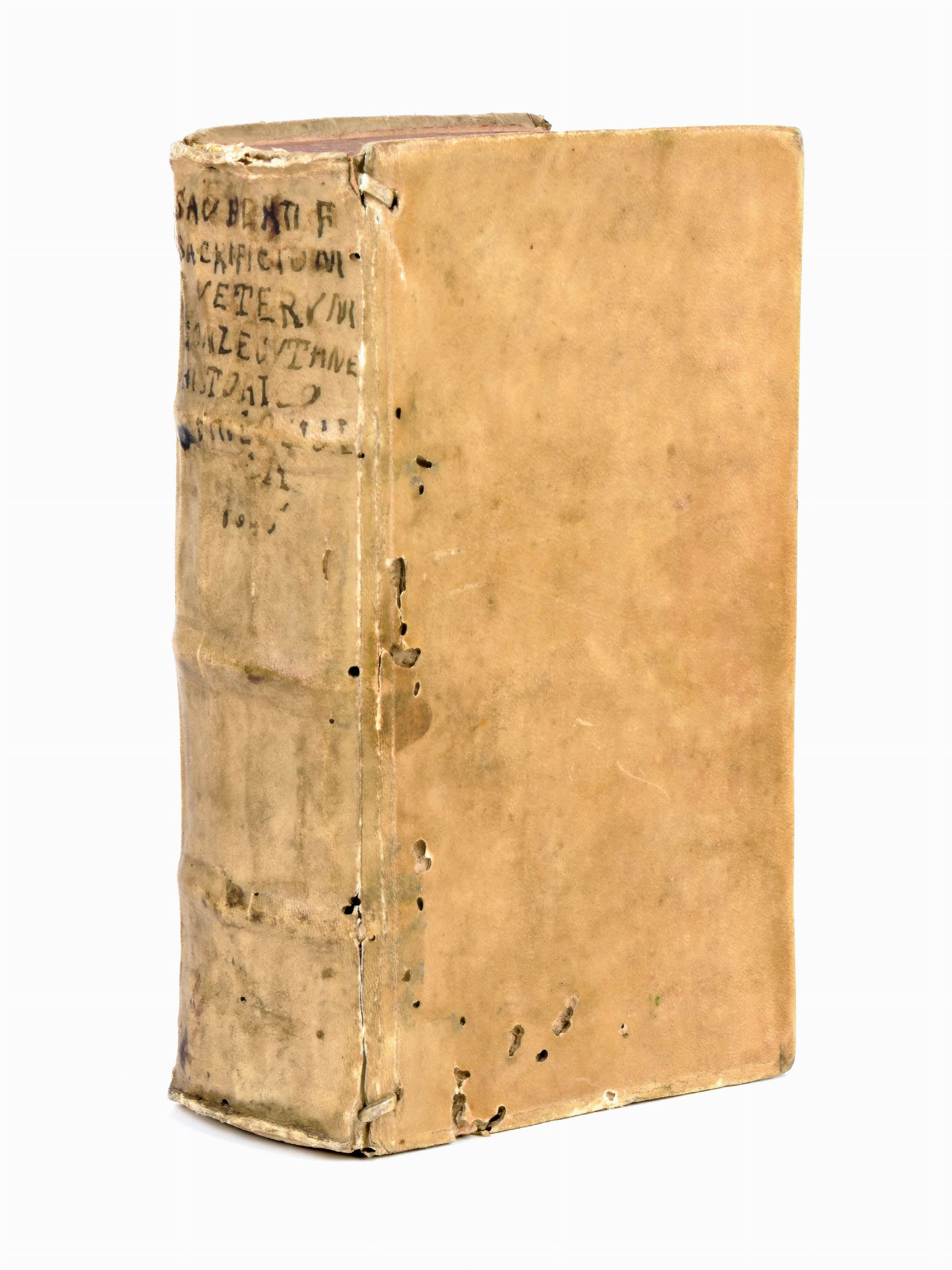 Formato in-8°, mm. 162x95, pp. (40), 721, (13). Completo. Rilegatura coeva in piena pergamena con titoli manoscritti al dorso. Tagli delle carte a spruzzo. Brunitura intensa. Piccoli lavori di tarlo esterni e ai risguardi. Presente ex libris applicato al frontespizio. Johannis Sauberti F. De sacrificiis veterum conlectanea historico-philologica, et miscella critica. Jenae, impensis Matthaei Birckneri, excudit Samuel Krabsius, 1659. Testo latino. Con 4 tavole incise in calcografia fuori testo. Capilettera xilografici. Teologo luterano (Altdorf 1592 - Norimberga 1646). Catechista ad Altdorf, divenne (1618) diacono e professore al ginnasio della sua città ; a Norimberga fu diacono di S. Egidio (1622), primo predicatore di S. Tebaldo (1637) e bibliotecario municipale. Luterano ortodosso, il suo Zuchtbüchlein der evangelischen Kirche (1633) fu una delle più efficaci opere testuali del movimento di riforma del suo tempo. Molto importante il suo carteggio con i maggiori esponenti del mondo teologico.