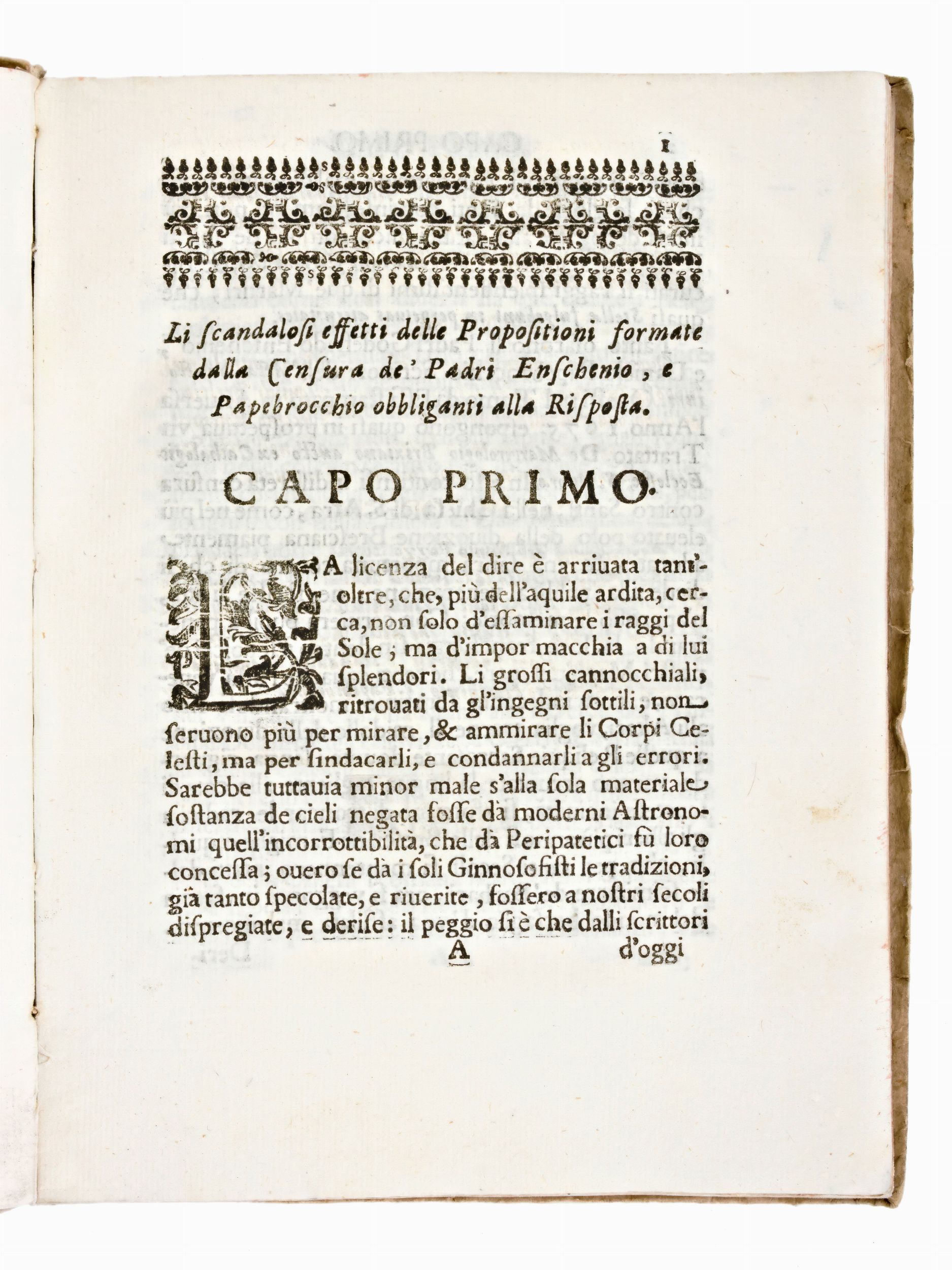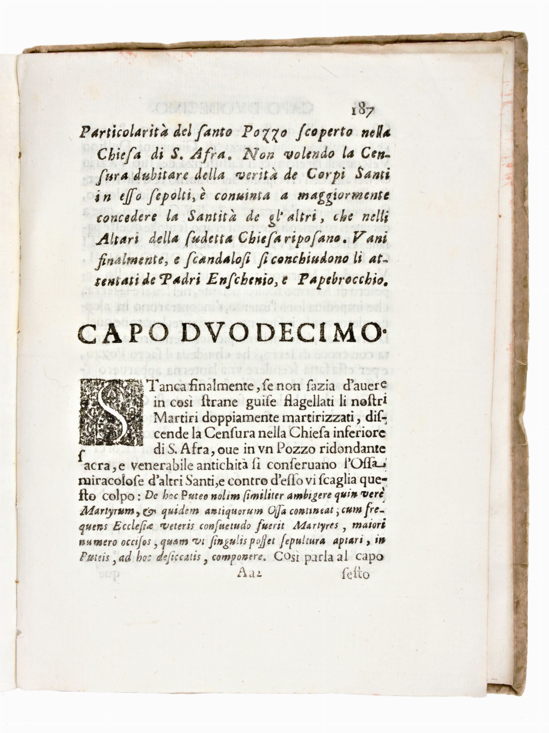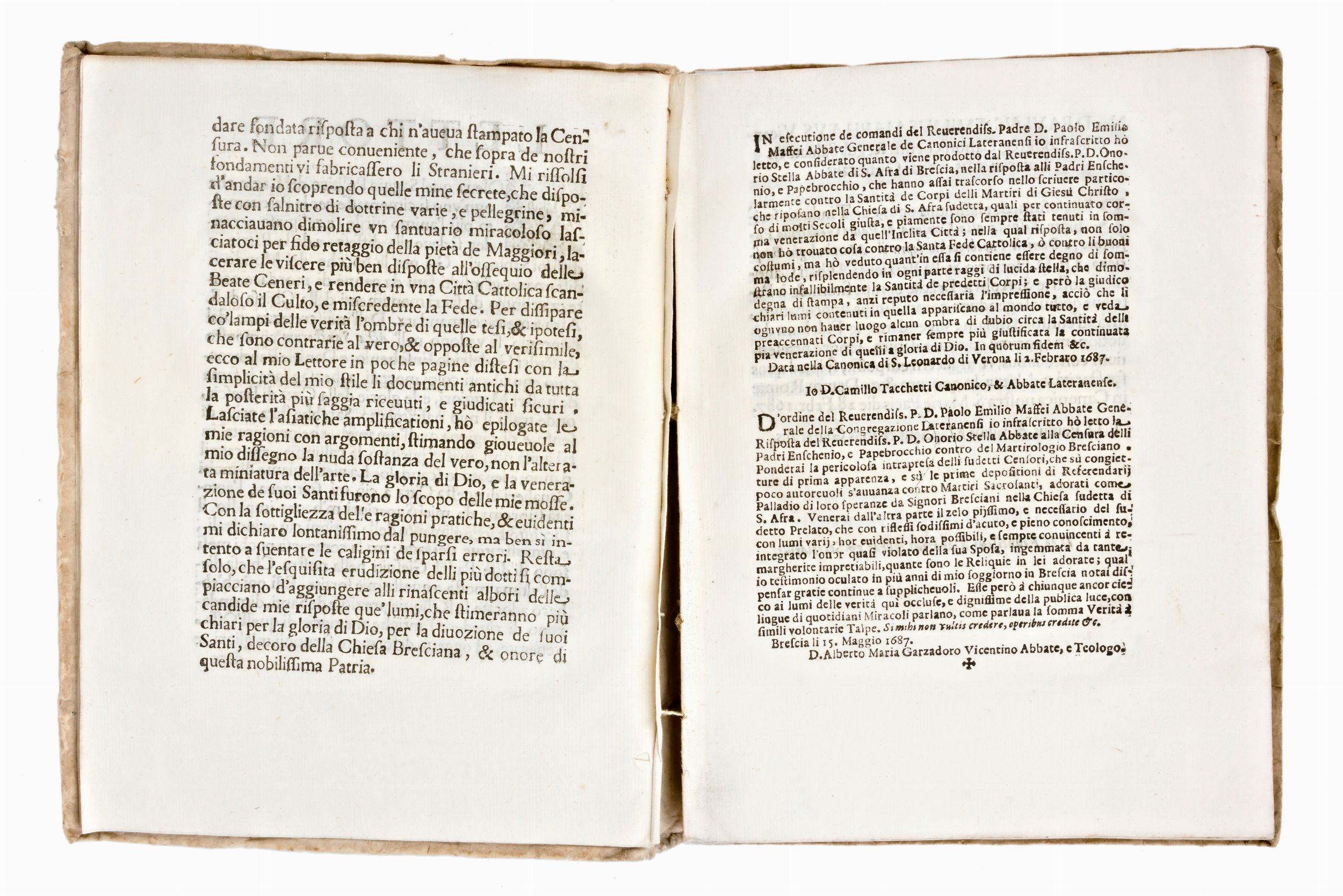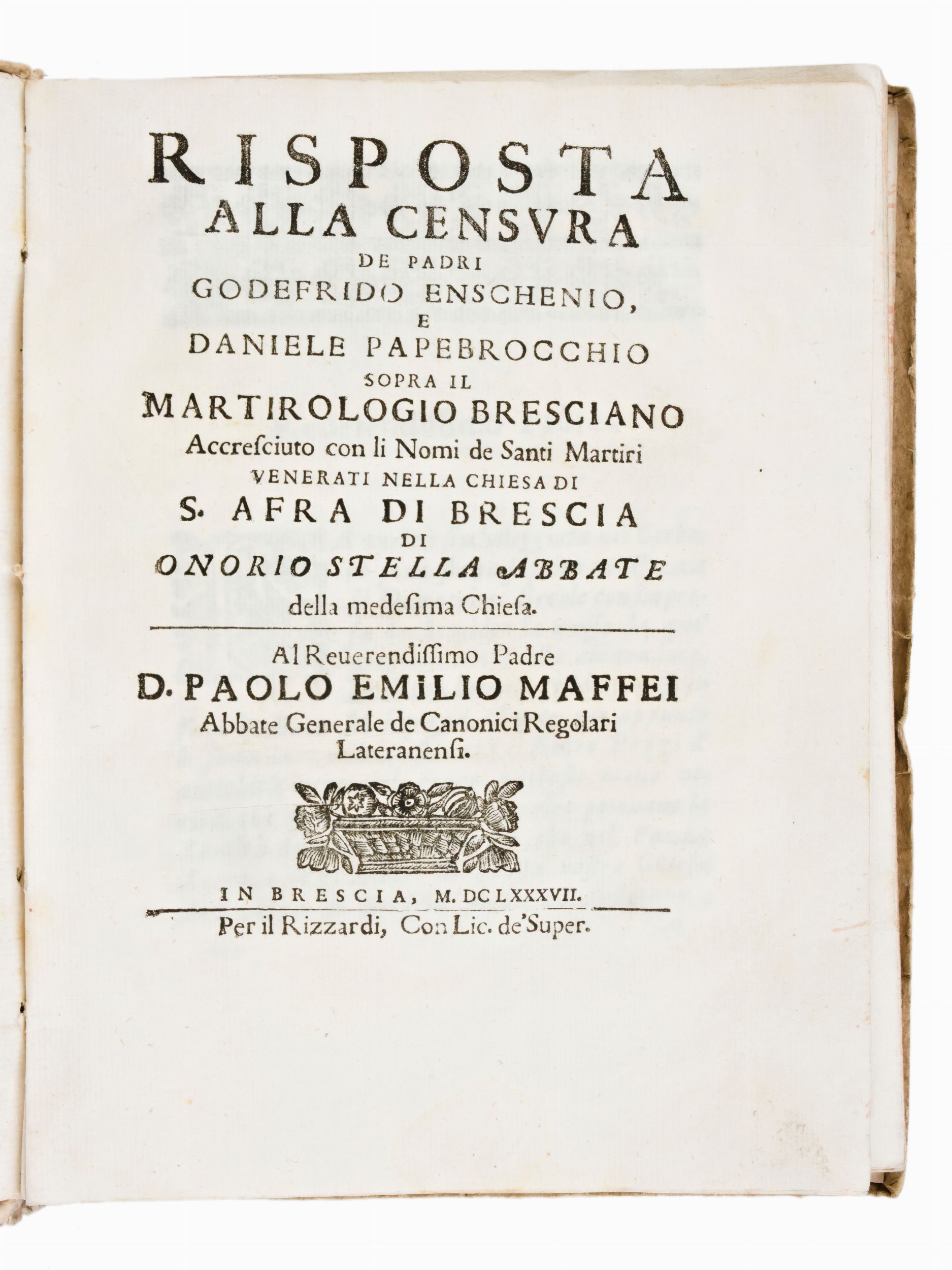 Titolo : Risposta alla censura de padri Godefrido Enschenio, e Daniele Papebrocchio sopra il martirologio bresciano accresciuto con li nomi de santi martiri venerati nella chiesa di S. Afra di Brescia di Onorio Stella abbate della medesima chiesa. Impresso in Brescia il 1687. Cartonato coevo muto. Legatura allentata. Fregio xilografico al frontespizio. Testatine, capilettera e finalini xilografici. Testo nitido. In-4°, mm. 245x180, Pp. (16), 195.