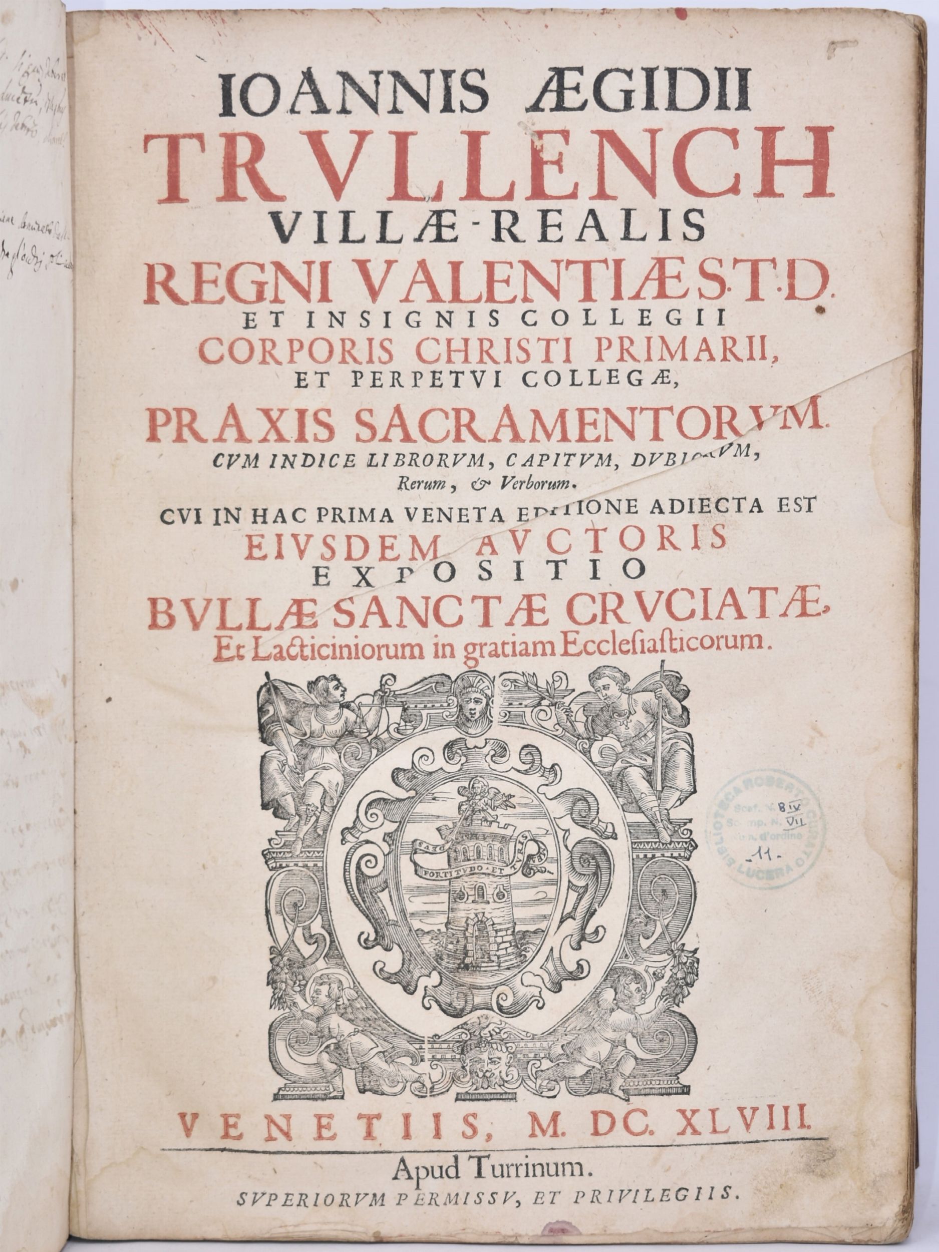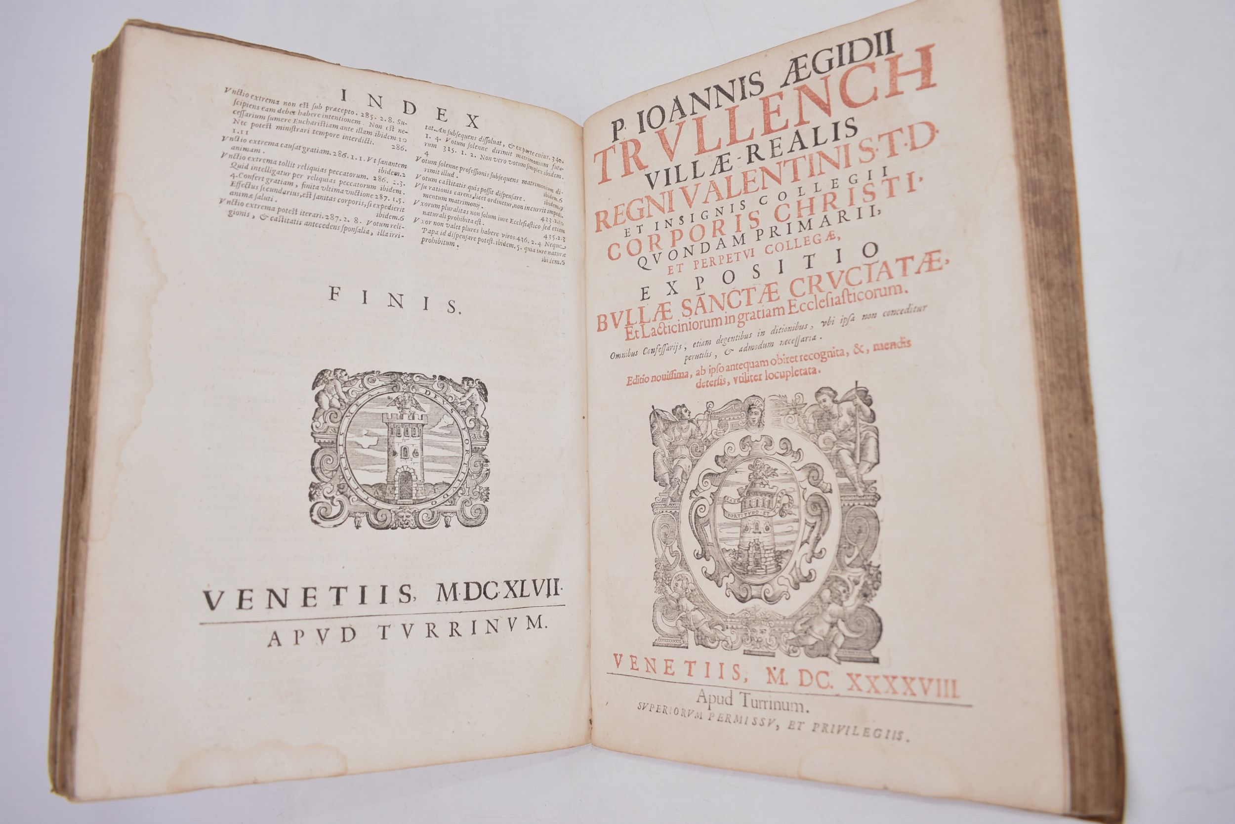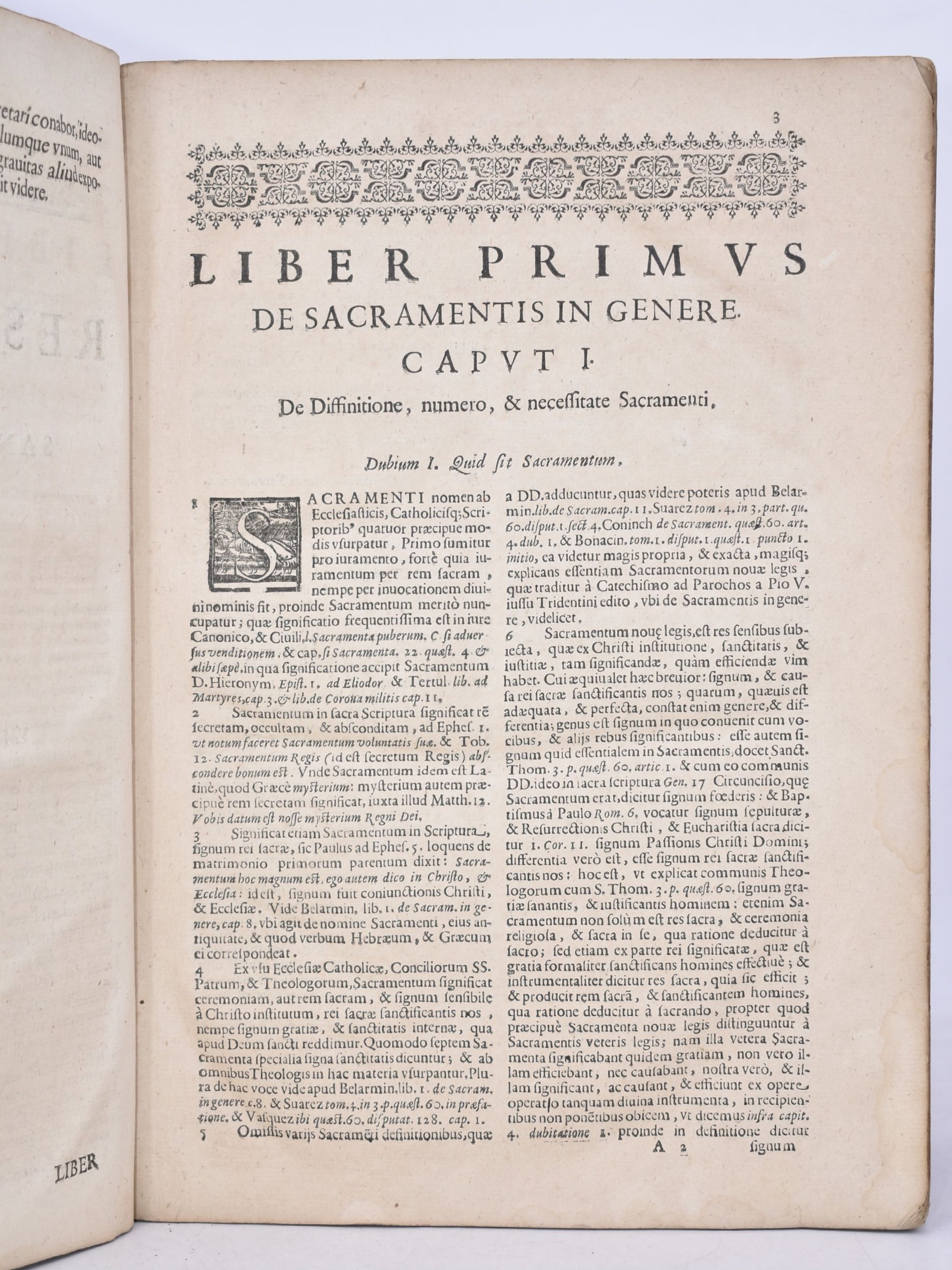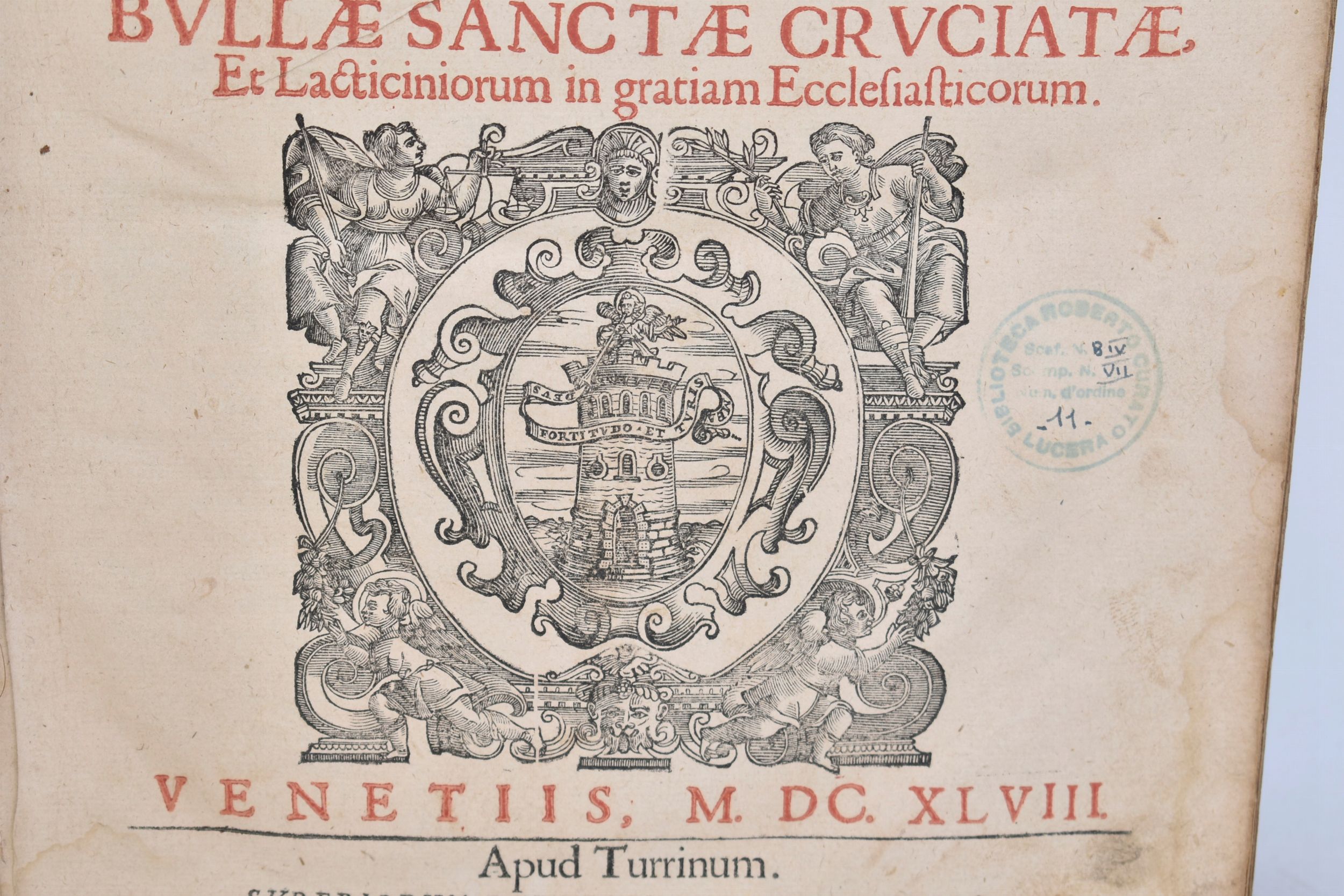 Trattato teologico Seicentesco, due parti rilegate in un volume; i 2 front. stampati a col. con una grande marca tip. (Una torre, sulla sommità un angelo con Motto: Deus fortitudo et turris mea. In cornice figurata), impressa anche al verso dell'ultima carta alla prima parte dell'opera; testo latino stampato su 2 colonne. Non comune.