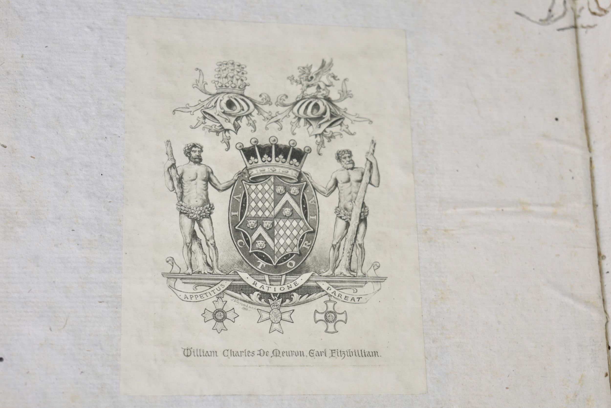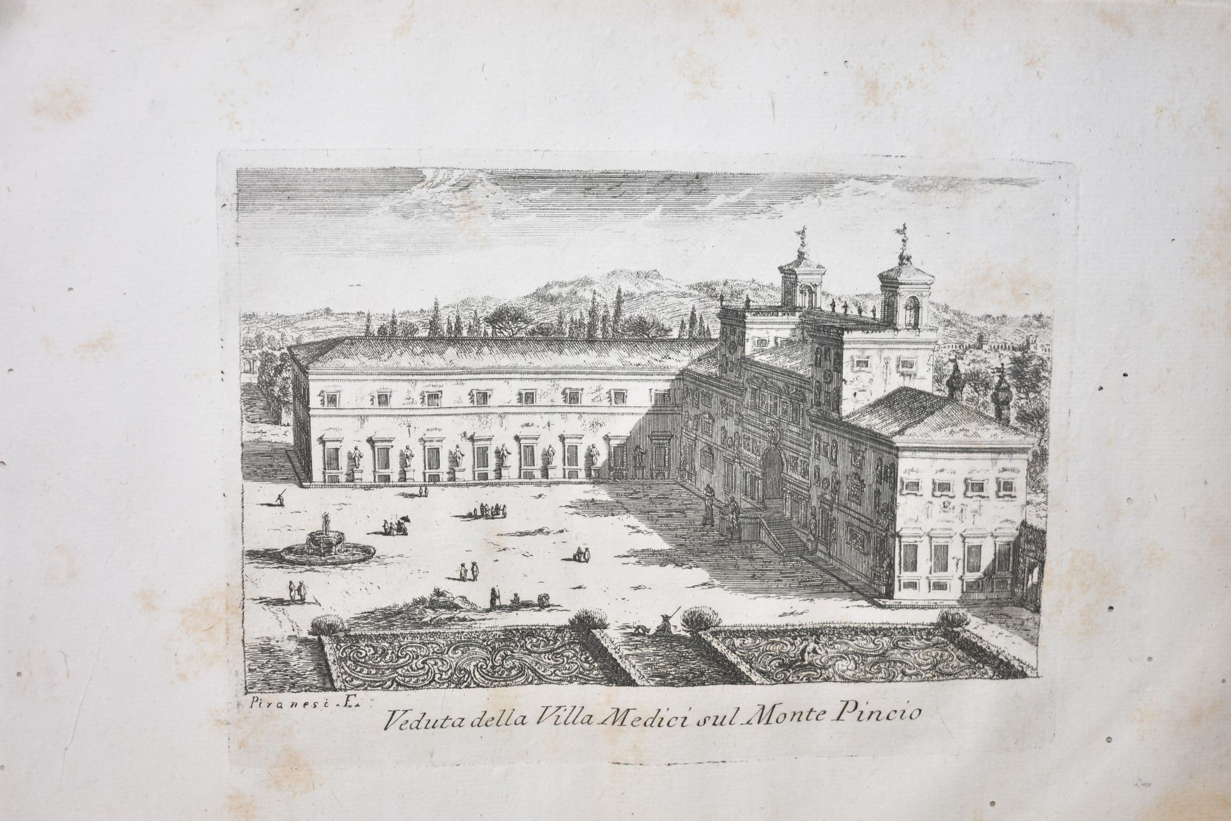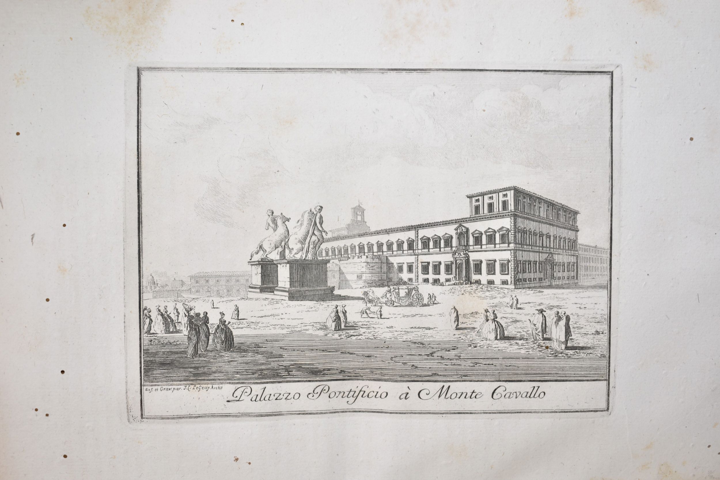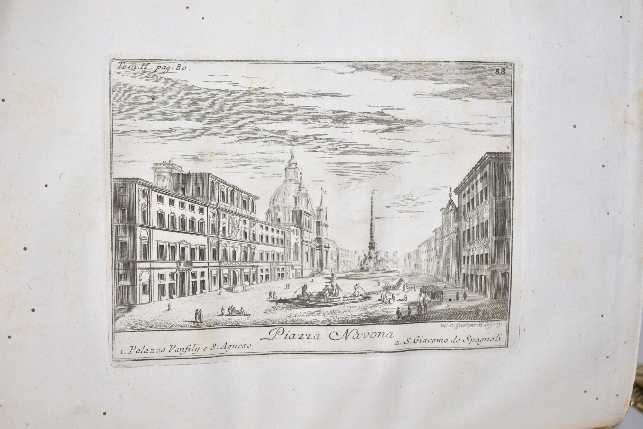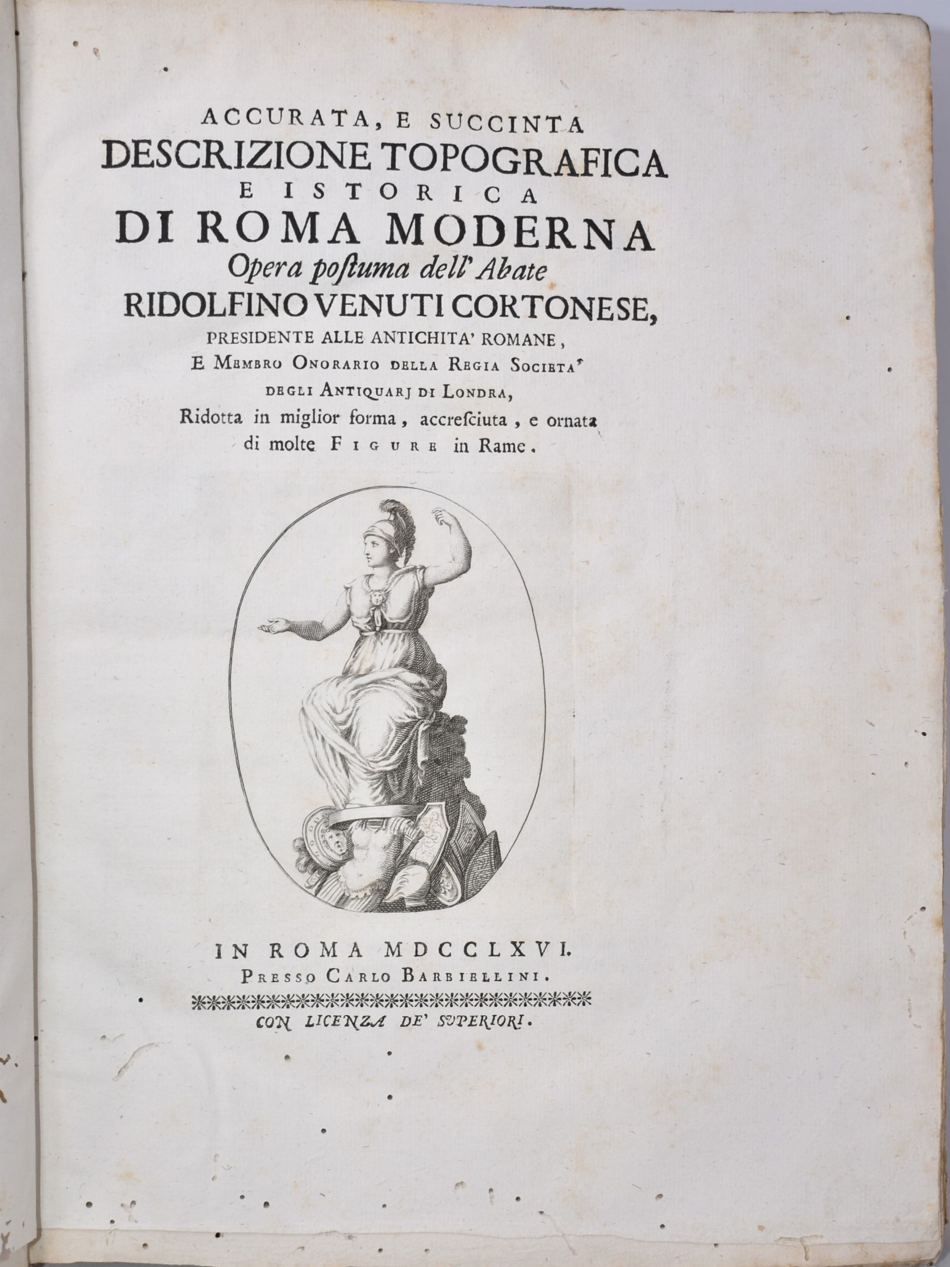 Una delle principali e più esaustive opere sulla topografia di Roma antica, raro esemplare dalla tiratura completa delle 54 tavole di apparato iconografico, con monumenti e vedute di Roma finemente incise su disegni realizzati anche da Giovanni Battista PIRANESI (1720-1778). Include la tavola raffigurante Villa Borghese. Esemplare marginoso, con legature genuine in mezza pergamena e piatti rivestiti in pregevole carta decorata a fiori e colorata a mano; ex libris araldico di William Charles de Meuron Earl Fitzwilliam ai contropiatti; ambedue i volumi presentano piccoli fori di tarlo per lo più marginali, con lievi perdite di testo limitatamente alle prime carte.