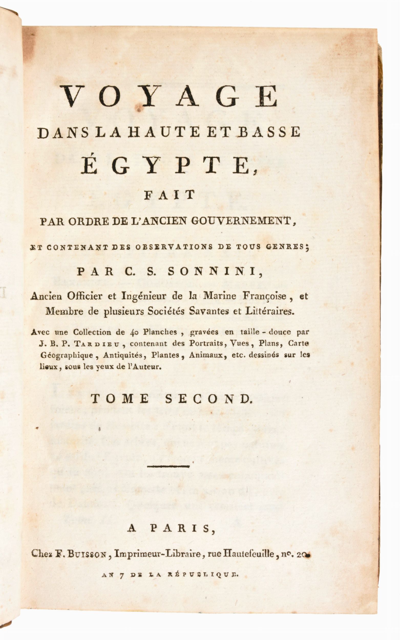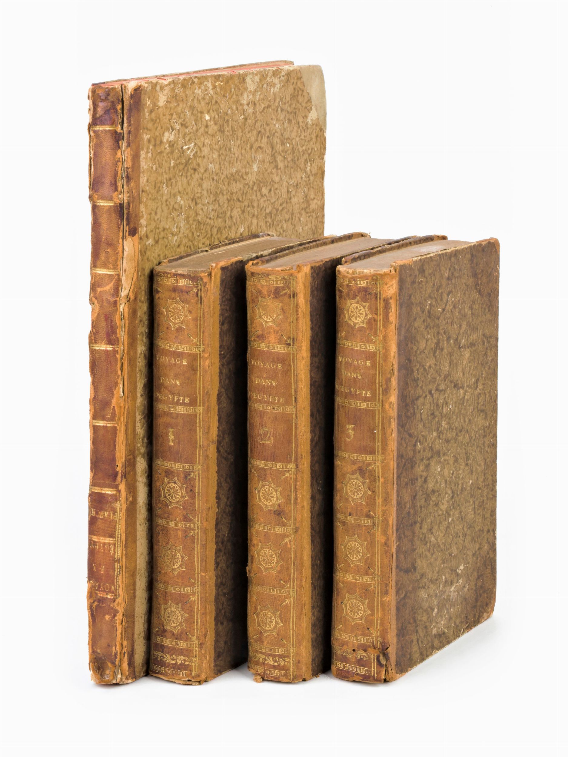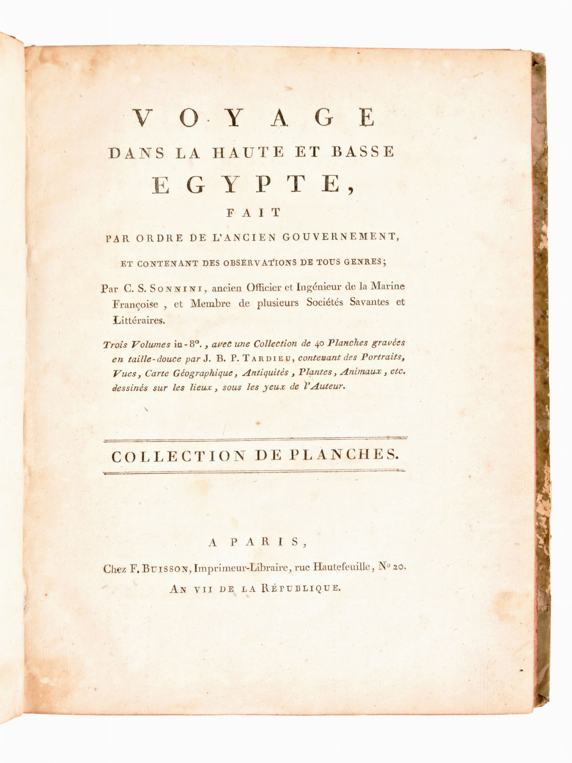 Formato in-8°, mm. 200x130, dimensioni atlante mm. 285x225. Pp. (4), 1 c. di tav. con il ritratto + 40 c. di tav. fuori testo / pp. (4), vii, 425, (3) / pp. (4), 417, (1) / pp. (4), 424. Completo. Rilegatura coeva in mezza pelle con angoli, titoli e fregi in oro al dorso, piatti rivestiti in antica carta decorata. Tagli delle carte a spruzzo. Ottimo esemplare con sporadiche fioriture e lieve brunitura alle carte. Atlante con cerniere parzialmente usurate, piccole spellature e mancanze ai dorsi. Antica edizione settecentesca, impressa in Parigi tra il 1798-1799 per l'editore François Buisson, completa in 3 volumi e l'Atlante. Spedizione in Egitto del naturalista e viaggiatore francese Charles N. C. Sonnini de Manoncourt (1751-1812), rapporti sulla geografia e sulle scienze naturali, informazioni e commenti su argomenti come la medicina, l'alimentazione, l'agricoltura, il comportamento sessuale, le sette religiose, l'architettura e la storia naturale. Atlante di 40 Tavole incise ad intaglio da J. B. P. Tardieu (1746-1816), contenenti Ritratti, Vedute, Carte Geografiche, Antichità , Piante, Animali, disegnati sul posto sotto gli occhi dell'Autore.