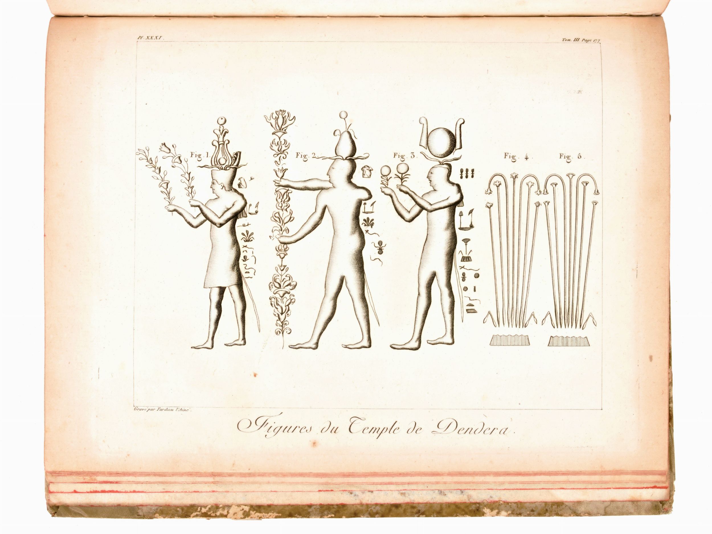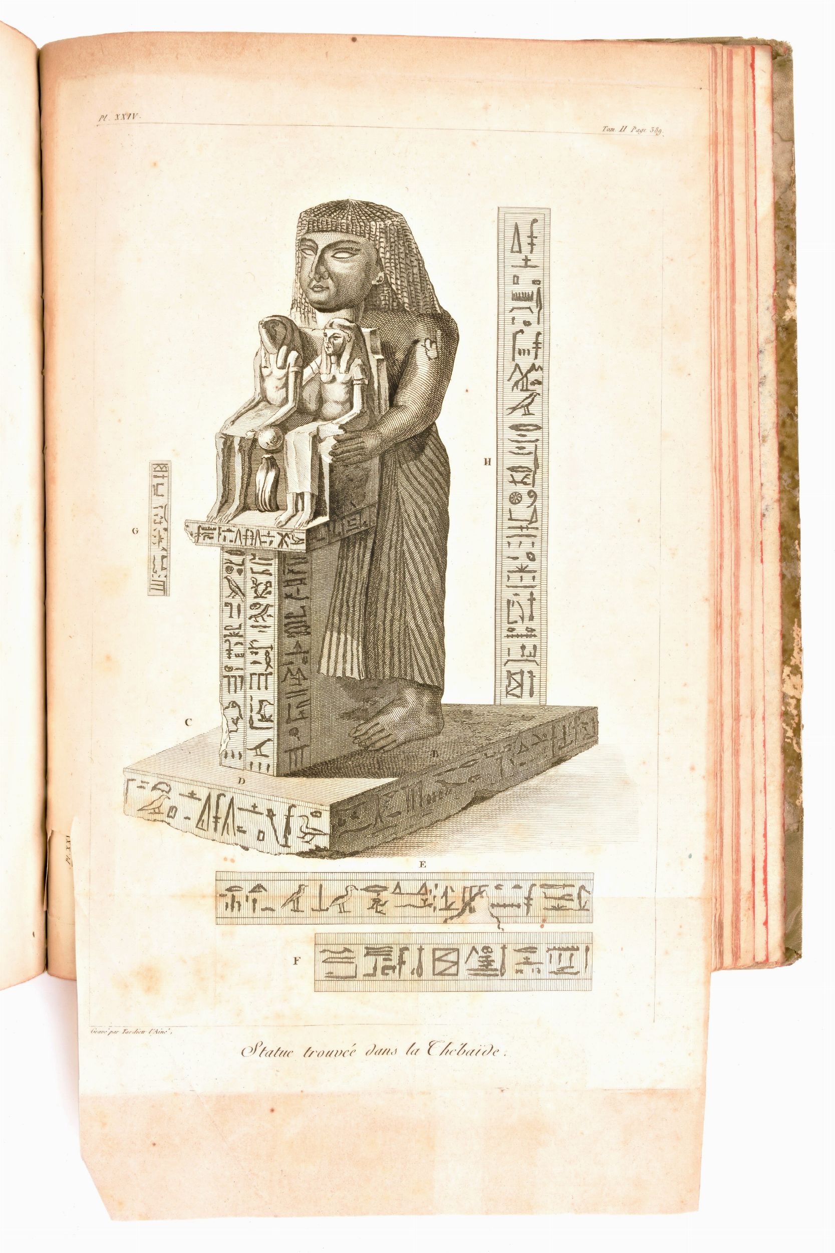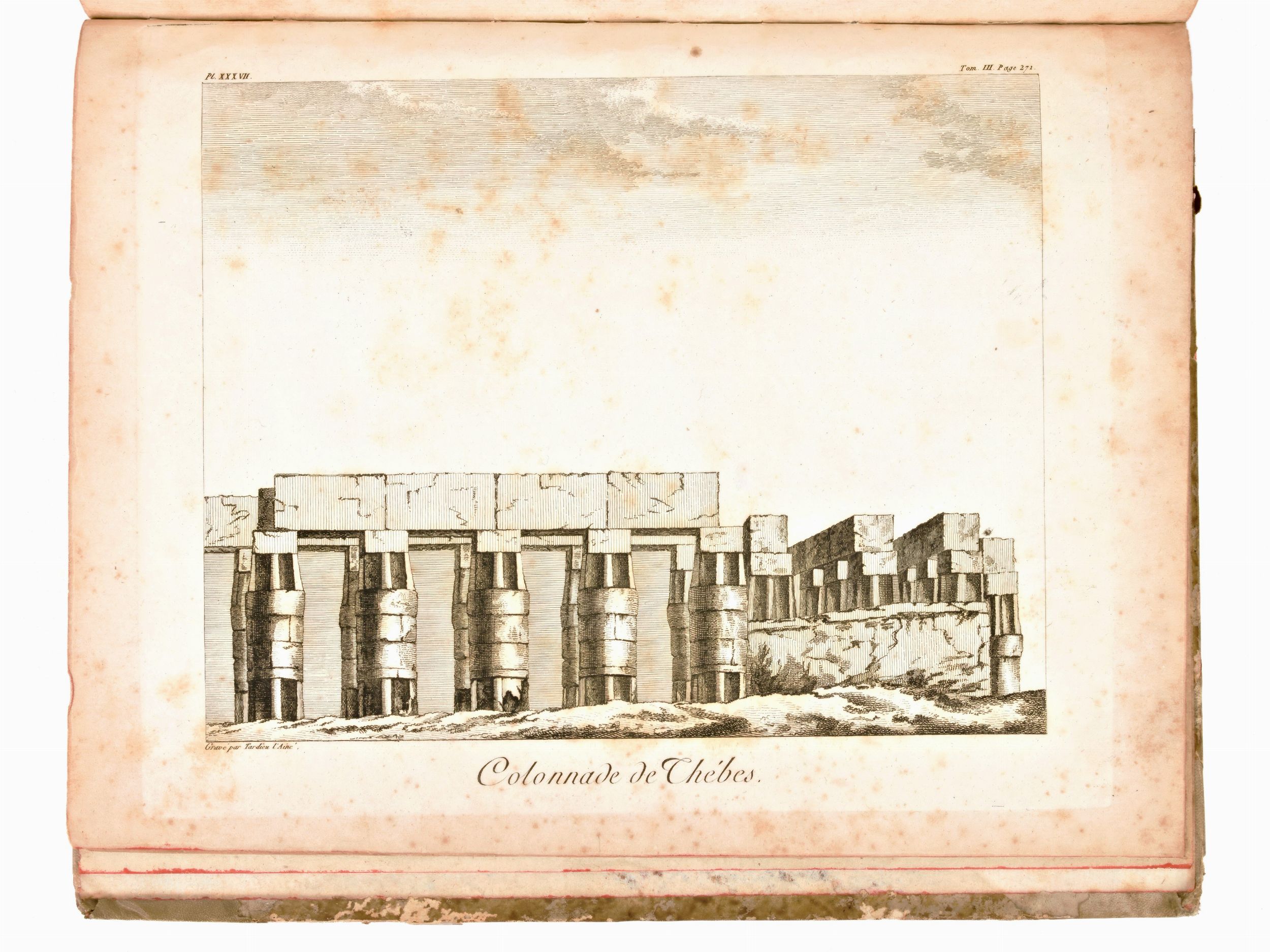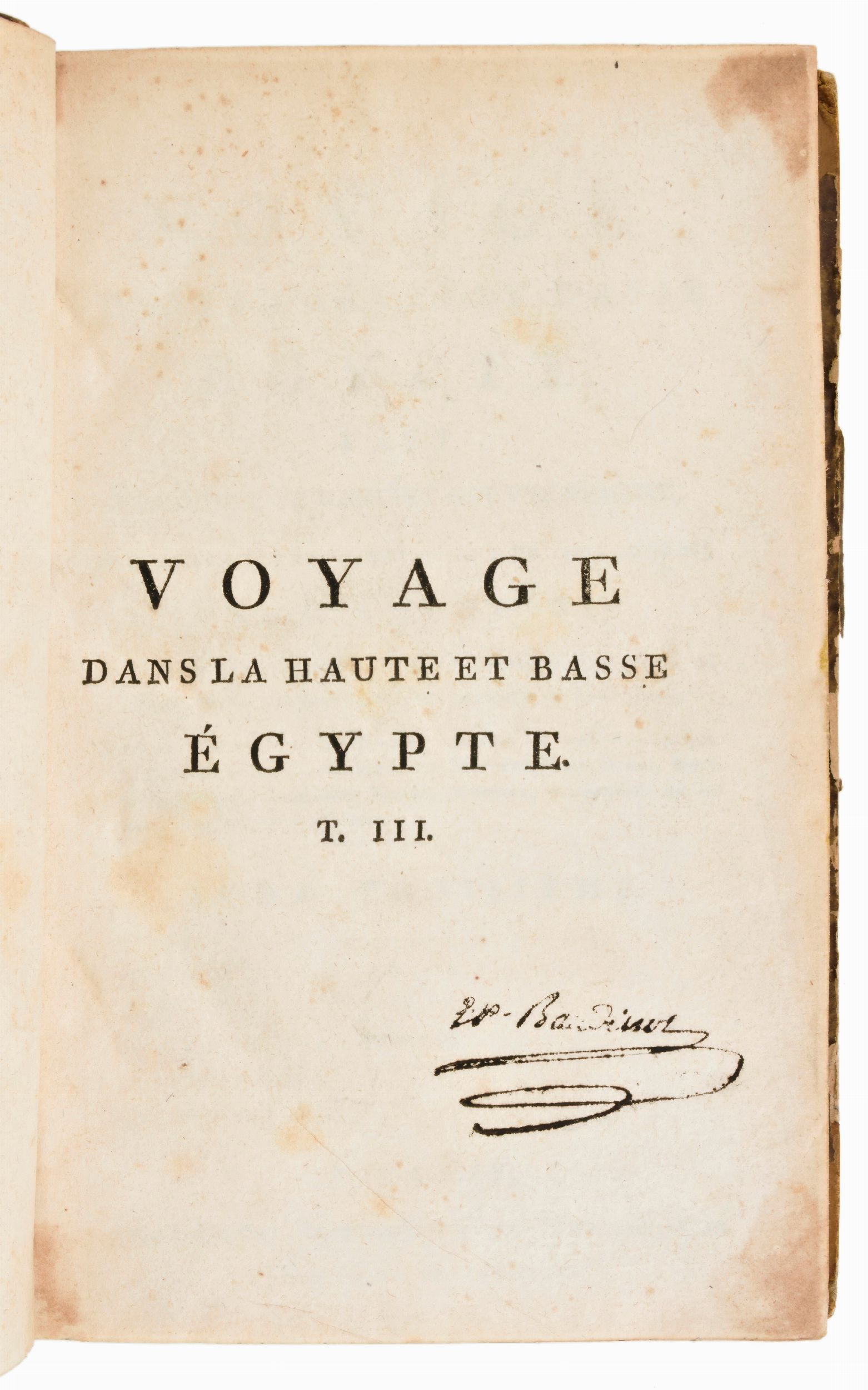 Formato in-8°, mm. 200x130, dimensioni atlante mm. 285x225. Pp. (4), 1 c. di tav. con il ritratto + 40 c. di tav. fuori testo / pp. (4), vii, 425, (3) / pp. (4), 417, (1) / pp. (4), 424. Completo. Rilegatura coeva in mezza pelle con angoli, titoli e fregi in oro al dorso, piatti rivestiti in antica carta decorata. Tagli delle carte a spruzzo. Ottimo esemplare con sporadiche fioriture e lieve brunitura alle carte. Atlante con cerniere parzialmente usurate, piccole spellature e mancanze ai dorsi. Antica edizione settecentesca, impressa in Parigi tra il 1798-1799 per l'editore François Buisson, completa in 3 volumi e l'Atlante. Spedizione in Egitto del naturalista e viaggiatore francese Charles N. C. Sonnini de Manoncourt (1751-1812), rapporti sulla geografia e sulle scienze naturali, informazioni e commenti su argomenti come la medicina, l'alimentazione, l'agricoltura, il comportamento sessuale, le sette religiose, l'architettura e la storia naturale. Atlante di 40 Tavole incise ad intaglio da J. B. P. Tardieu (1746-1816), contenenti Ritratti, Vedute, Carte Geografiche, Antichità , Piante, Animali, disegnati sul posto sotto gli occhi dell'Autore.
