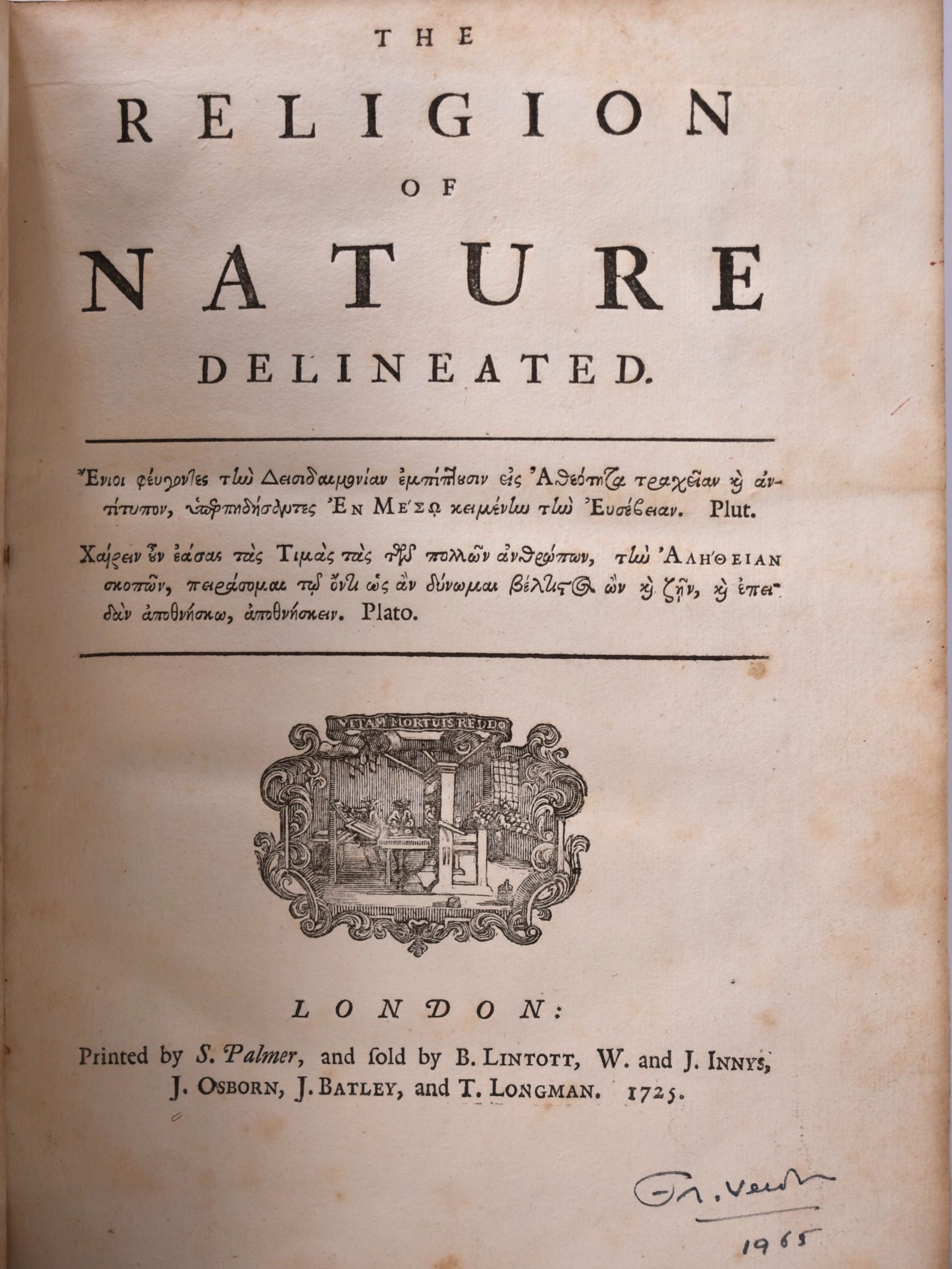 Wollaston, William: THE RELIGION OF NATURE ILLUSTRATED. London, 1725, S. Palmer.