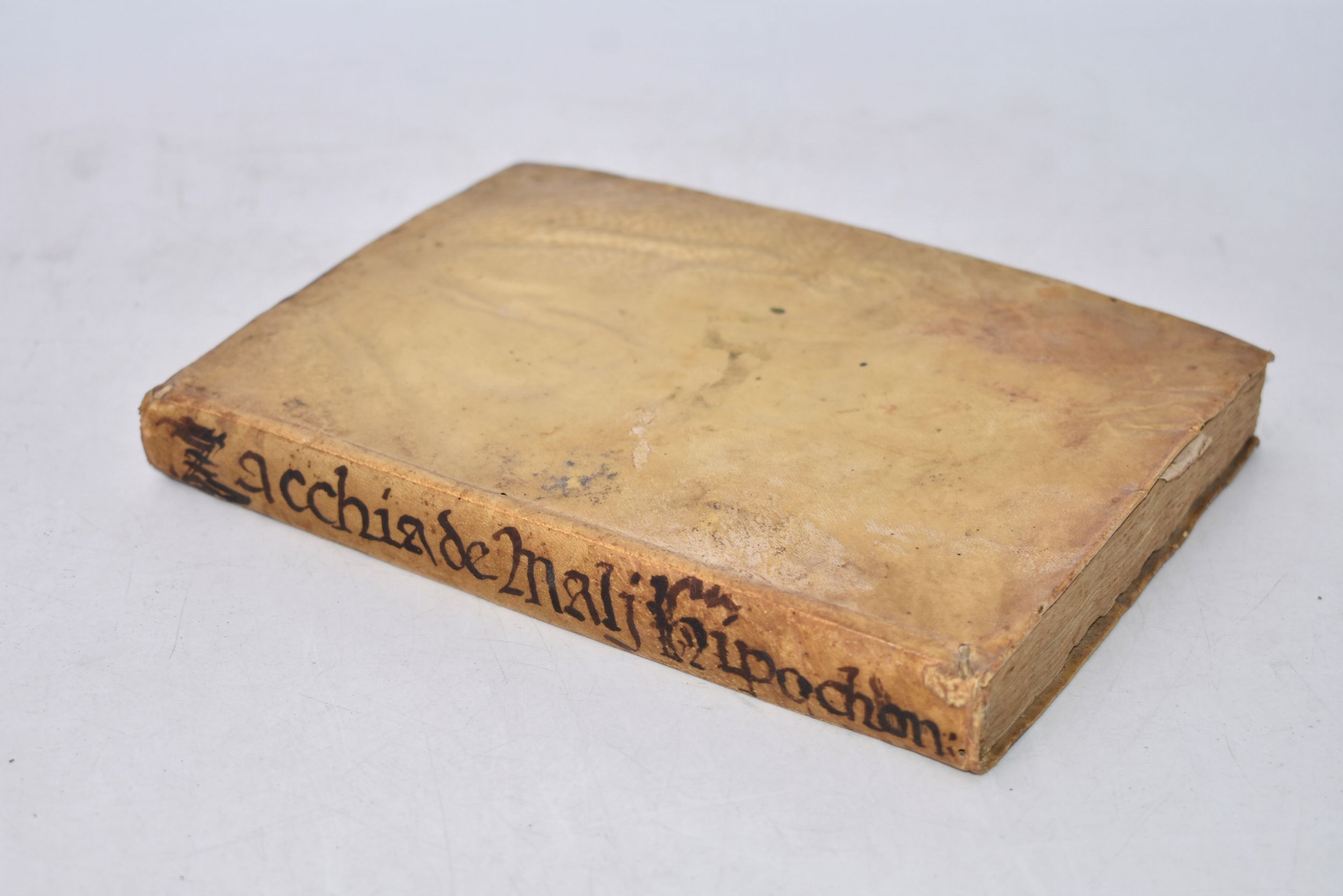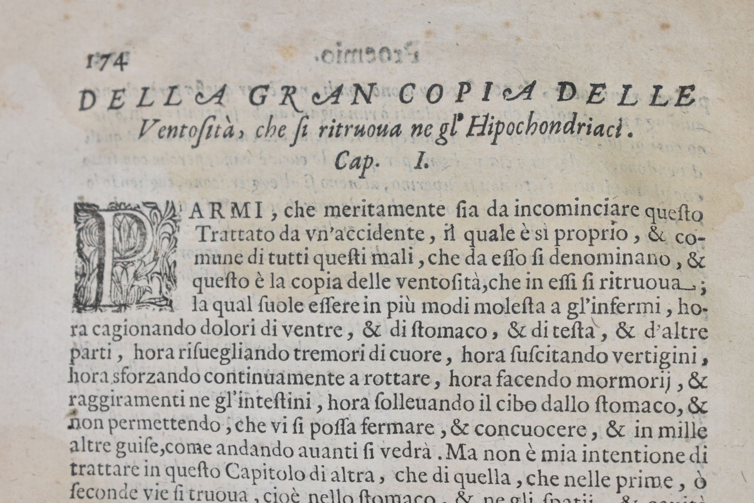 Seconda edizione del celebre trattato medico di P. Zacchia (1584-1659). Frontespizio stampato in rosso e nero con marca tip. (aquila bicipite coronata entro cornice), con raffinate iniziali xil. incise nel testo. Con tracce di gore, foxing e aloni diffusi, tarlatura marginale da p. 273 a 318.
