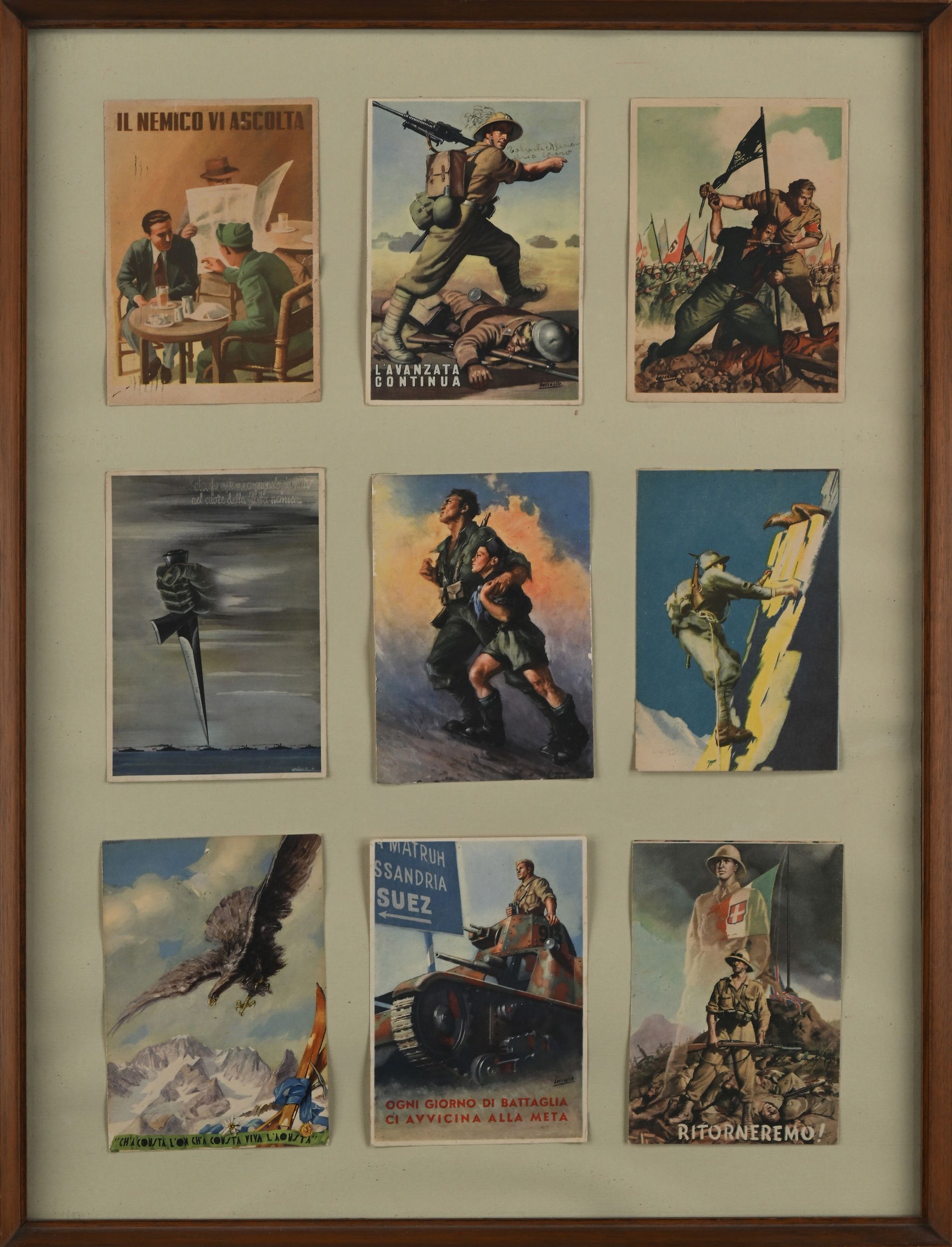 2 quadri con cartoline di propaganda I e II Guerra mondiale