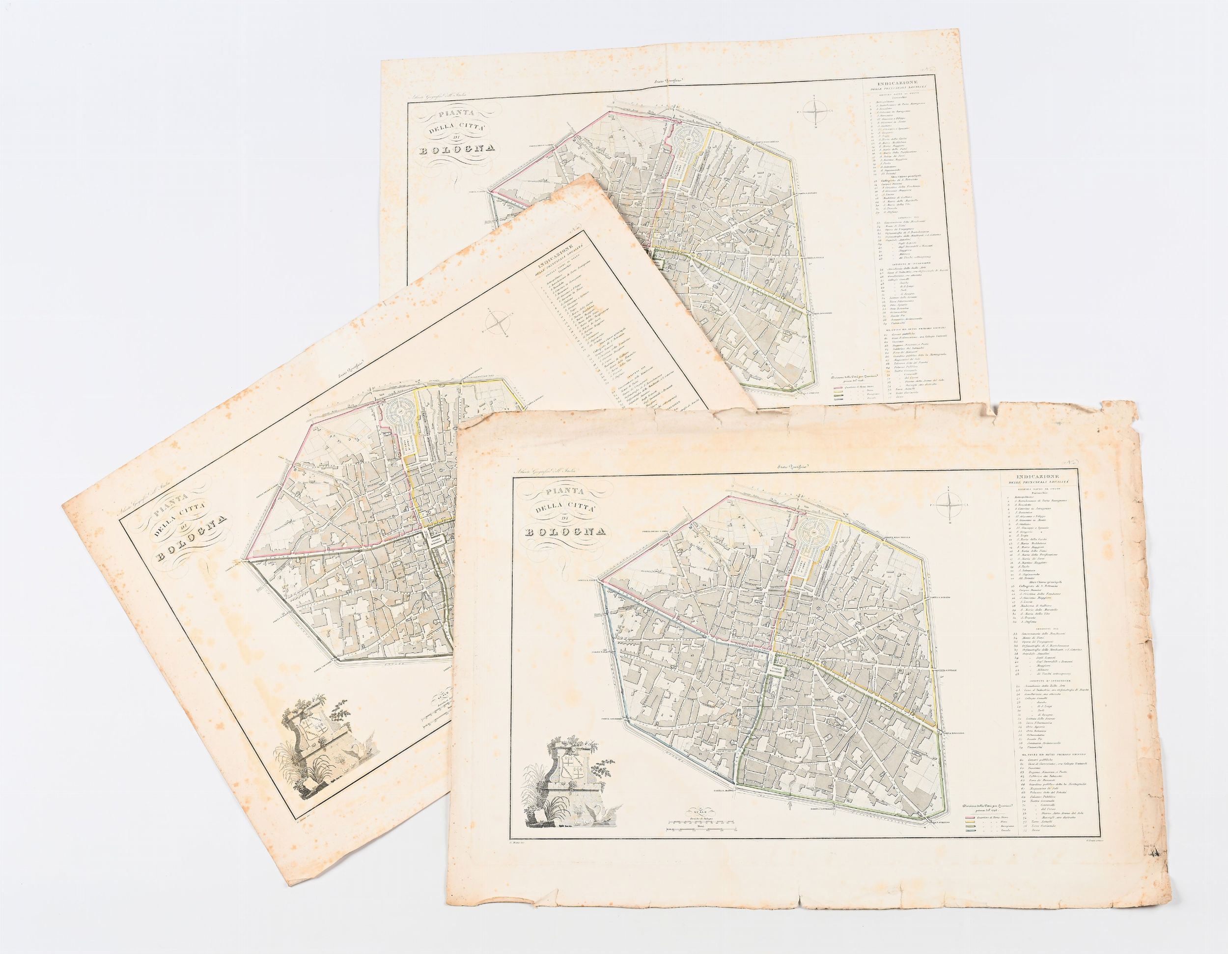 incisione acquerellata, cm 45x60; 50x65 Firenze 1844 Tratte dall'Atlante Geografico degli Stati Italiani delineato sopra le migliori e più moderne mappe, stampato in 2 volumi a Firenze nel 1844. il primo volume contiene 52 carte dell'Italia superiore mentre il secondo contiene 77 carte dell'Italia inferiore stampate assieme ai tre volumi dell'Atlante illustrativo per arricchire la monumentale opera la Corografia fisica, storico e statistica dell'Italia e delle sue Isole. Le incisioni dei volumi sono opera di Vittorio Angeli, Giacinto Maina, Piero Manzoni e Giuseppe Pozzi (Difetti e leggeri strappi).