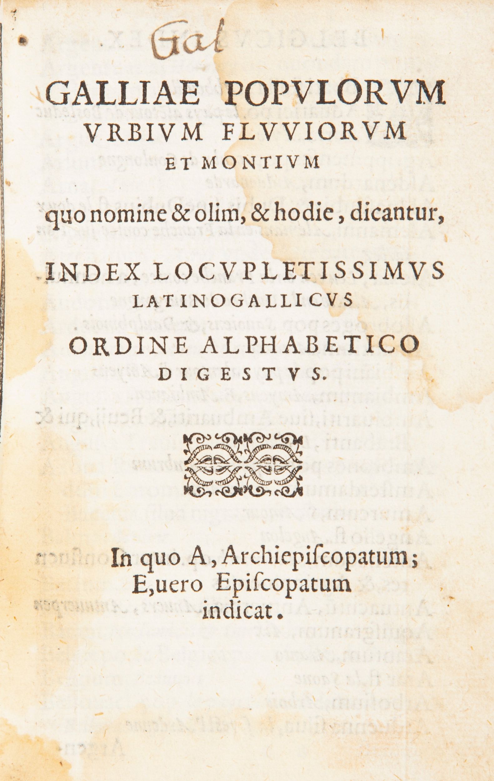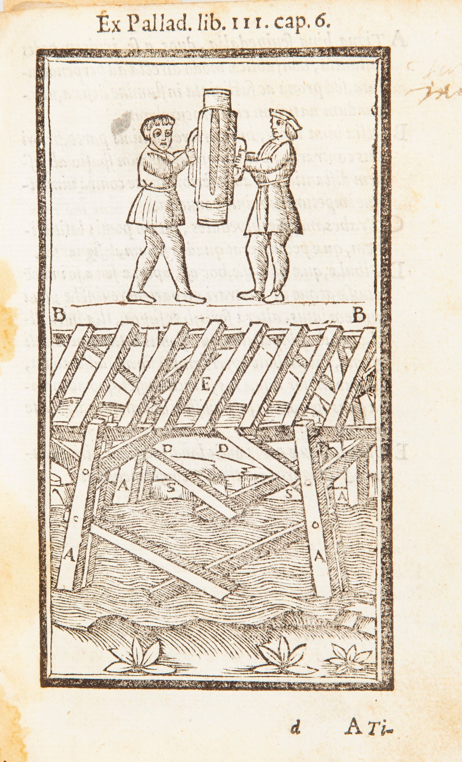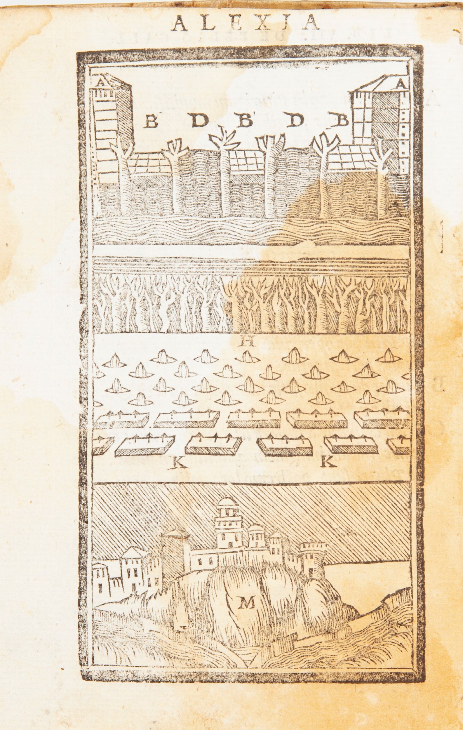 Apud Floravantem a Prato, Venezia 1584 In 8°. Illustrato con le 2 piante della Hispania (lacerazioni, strappi e mancanze) e della Gallia (strappo senza mancanze) ed 8 figure a xilografia (anche a piena pagina). Edizione basata sulla celeberrima del 1513 e sulla successiva Aldina del 1575, il pregio di queste edizioni sta nelle incisioni che illustrano fauna, fortificazioni, sbarramenti, sistemi di difesa e ponti. Aloni, gore e macchie anche sul frontespizio. Esemplare parzialmente slegato. Scompleto, mancante dell'ultima parte dell'Indice che si interrompe con Q4. Legatura in piena pergamena coeva con titolo manoscritto al dorso (sono presenti numerose scritte antiche sia sui piatti che internamente, scritte presenti anche sulle carte bianche e su altre carte).