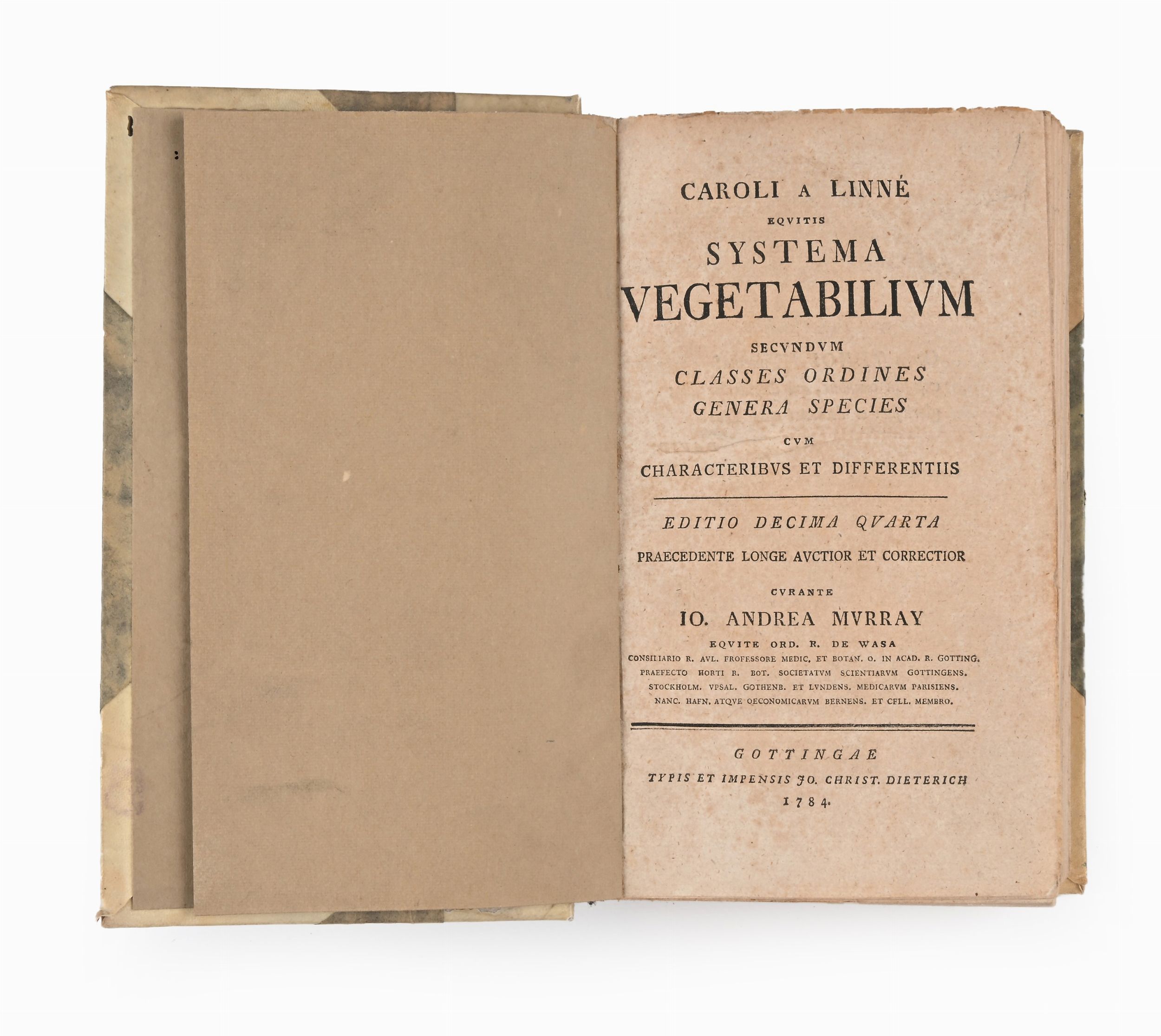 J.C. Dieterich, Gottinga 1784 In 8o L'opera fu il punto di partenza della moderna botanica e zoologia sistematica. L'autore fece un viaggio di ricerca in Lapponia nel 1732, si stabilì come medico a Stoccolma nel 1738 e in seguito divenne professore di medicina e botanica; fu il tassonomista per eccellenza, il padre delle scienze naturali moderne, il principe dei botanici. Il sistema di nomenclatura binomiale da lui perfezionato è la pietra angolare di una comunità internazionale di scienziati, nuovamente in grado di riferirsi a una specie utilizzando un linguaggio standard. Il suo Systema Naturæ (1735) fu il primo a esporre la sua Weltanschauung scientifica e sotto la sua supervisione ebbe 12 edizioni, riflettendo le nuove scoperte. Dopo la sua morte il Systema diverge, Johan Anders Murray ha estratto la parte relativa solo alle piante (vegetabilia) in quella che è stata la 'tredicesima' edizione. Legatura novecentesca in mezza pergamena con angoli.