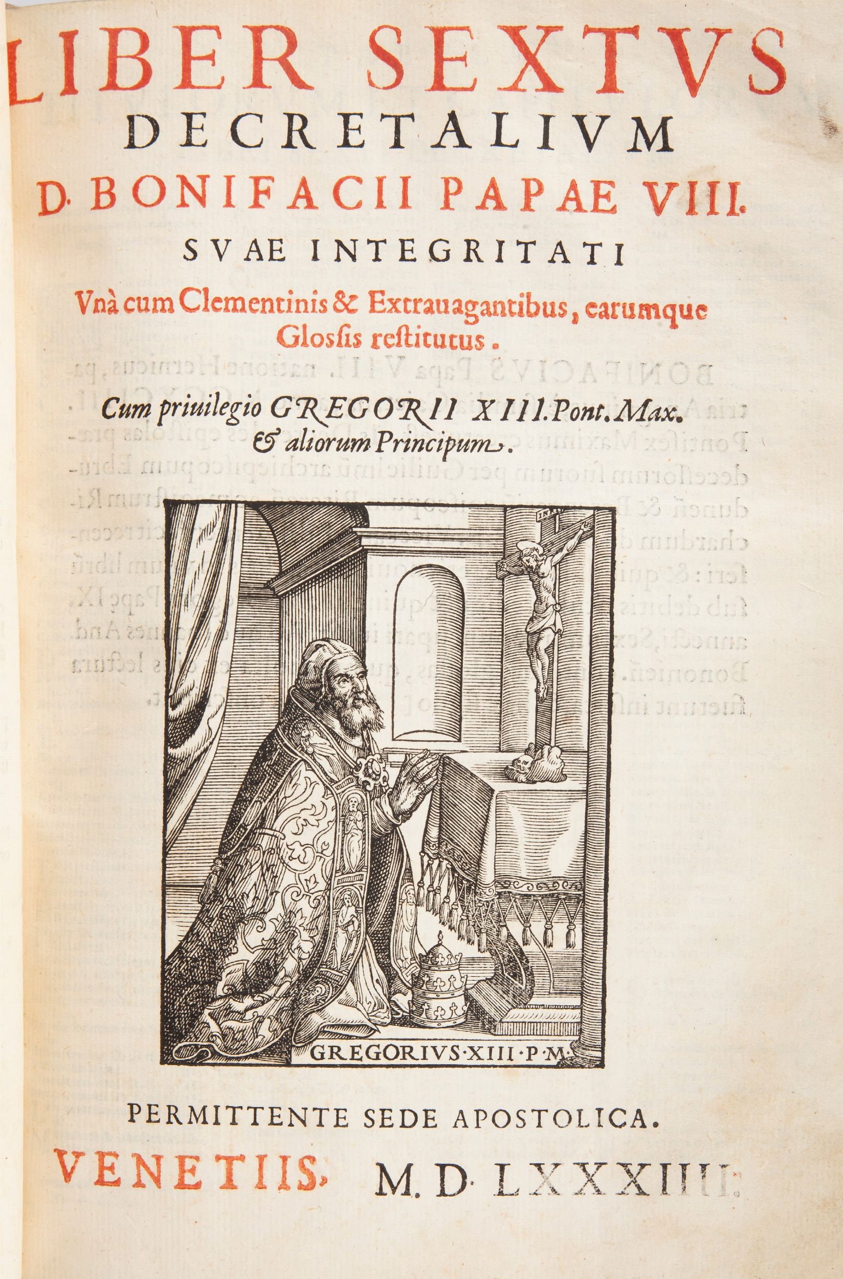 cm 27,5 x 20 Apud Magnam Societatem, Venezia 1584 In 4° grande. 4 opere di diritto canonico raccolte in 2 Volumi. Le edizioni in quarto sia del Corpus Iuris Civilis che del Corpus Iuris Canonici costituivano una lacuna nel mercato. Alla fine del XVI secolo a Venezia vedono la luce delle edizioni del Corpus molto maneggevoli e facili da usare. Questa edizione, che rappresenta un capolavoro sia in termini di stampa che di legatura, adotta la versione testuale ufficiale della Chiesa cattolica ad exemplarium Romanum. Ogni opera con proprio f rontespizio a due colori con xilografia, xilografie a piena pagina (tra le quali l' Arbor affinitatis, l'Arbor consanguinitatis e l'Arbor seu figura declarativa tituli de jure patronatus) nel testo su 2 colonne numerate. Legature in piena pergamena coeva con 4 nervi e titoli manoscritti al dorso. Tagli di colore blu. Qualche strappo e piccole mancanze.