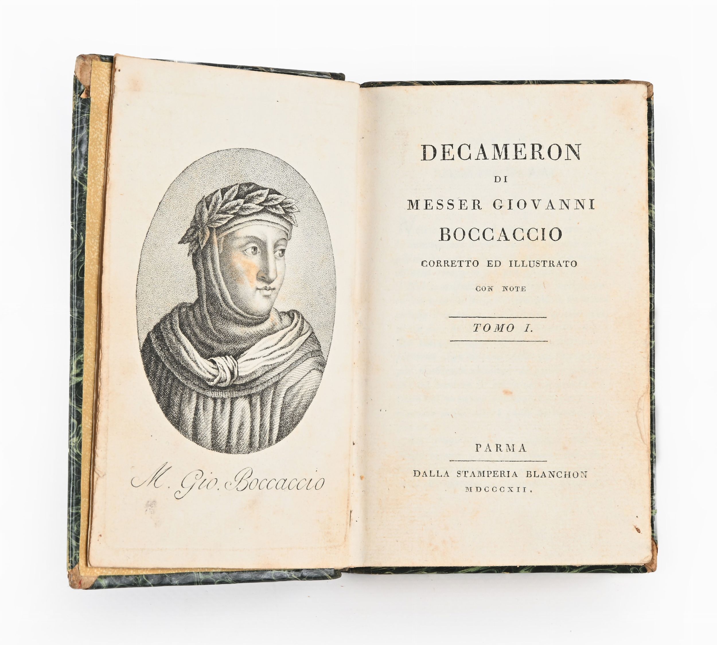 Blanchon, Parma 1812-14 8 volumi. Gradevole legatura in mezza pelle con tassello rosso e titolo in oro ai dorsi. Ritratto del Boccaccio all'antiporta del primo volume. Bell'esemplare.