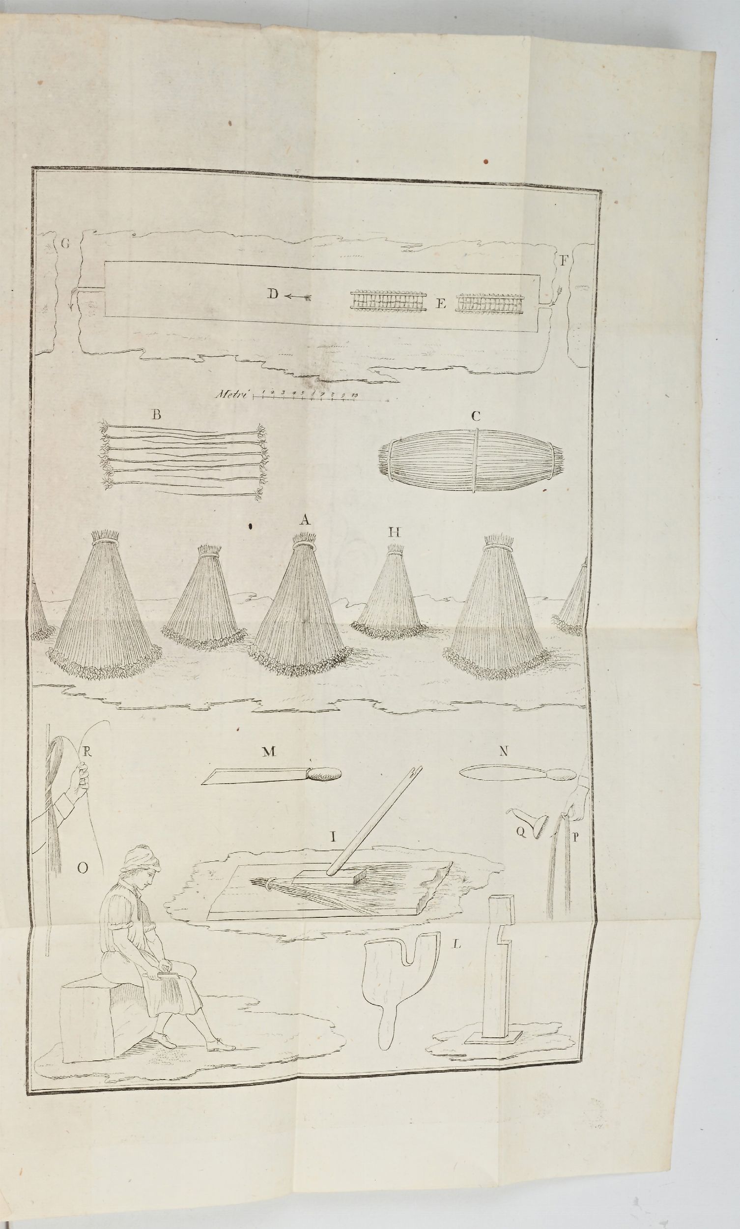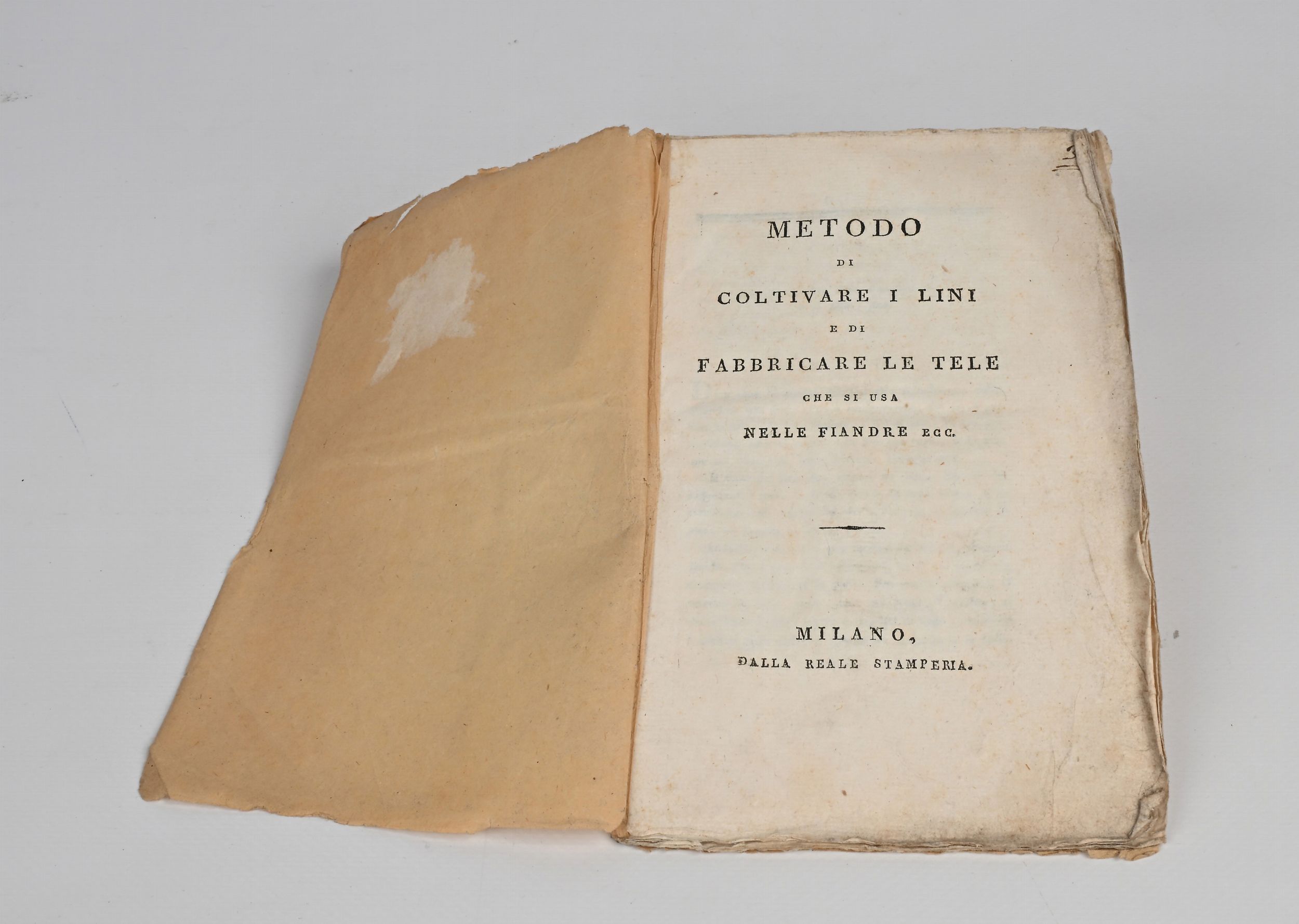 cm 18,5x12 Stamperia Reale, Milano (1808) In 12° Con tavola incisa più volte ripiegata in fine. Opuscolo stampato in numerose edizioni su iniziativa del Governo Napoleonico (Camere di Commercio dipartimentali) che riprende sostanzialmente l'articolo pubblicato nello stesso anno Morosi sul Giornale della Società d'incoraggiamento delle scienze e delle arti stabilita in Milano. L'autore era stato incaricato di occuparsi della lavorazione del lino nel suo viaggio nell'Europa centro-settentrionale durante il 1807-1807 dove aveva appreso le tecniche utilizzate nelle Fiandre. Legatura in velina coeva.