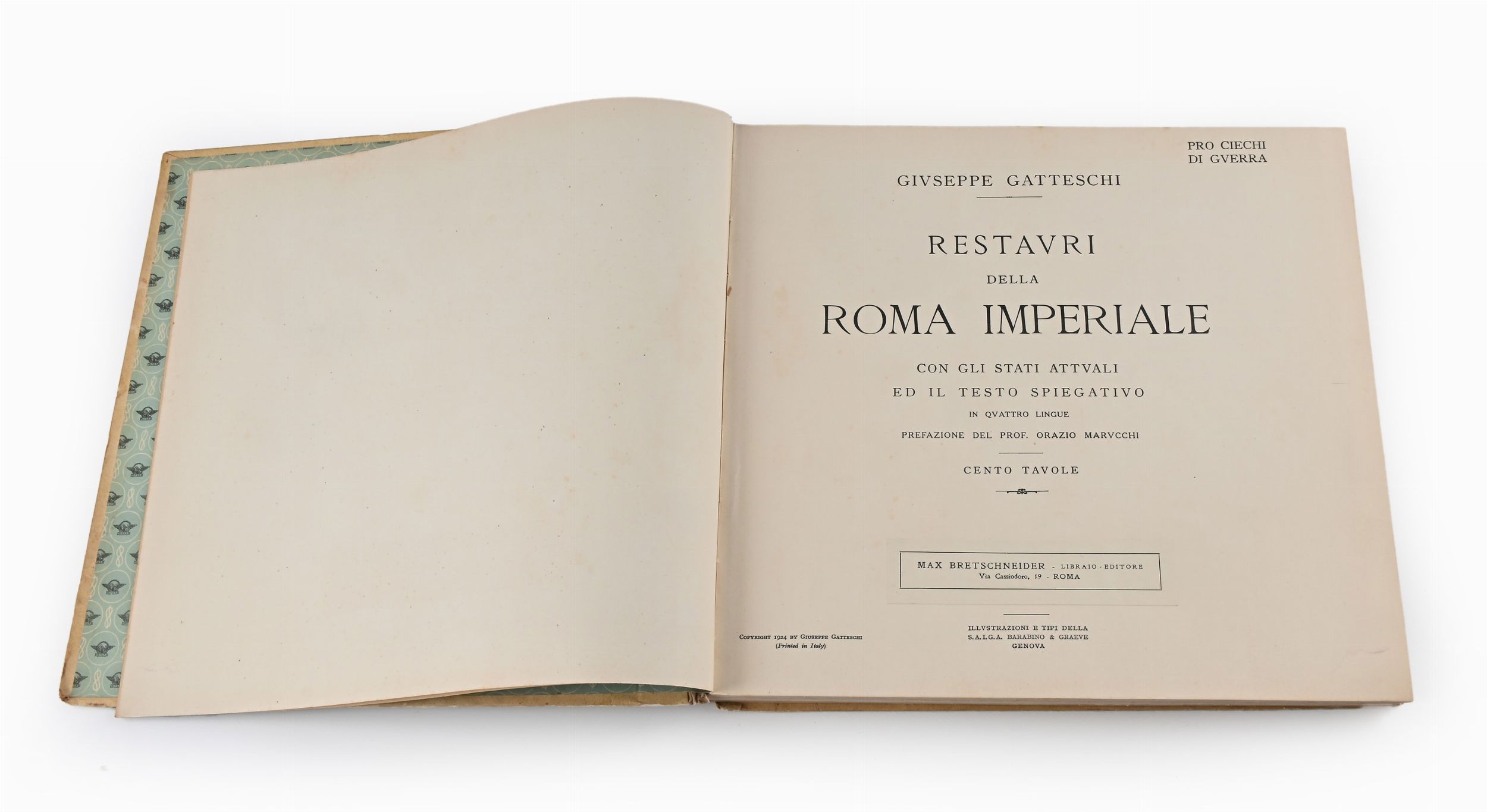 cm 34x36 Max Bretschneider, Roma 1924 100 tavole fotografiche di cui due grandi vedute ripiegate all'inizio, con prefazione del prof. Orazio Marucchi. Testo in italiano, francese, inglese e tedesco. Edizione a cura del Comitato di azione patriottica fra il personale postale-telegrafico-telefonico Pro ciechi di guerra. Legatura in cartonato editoriale con rilievi a secco.
