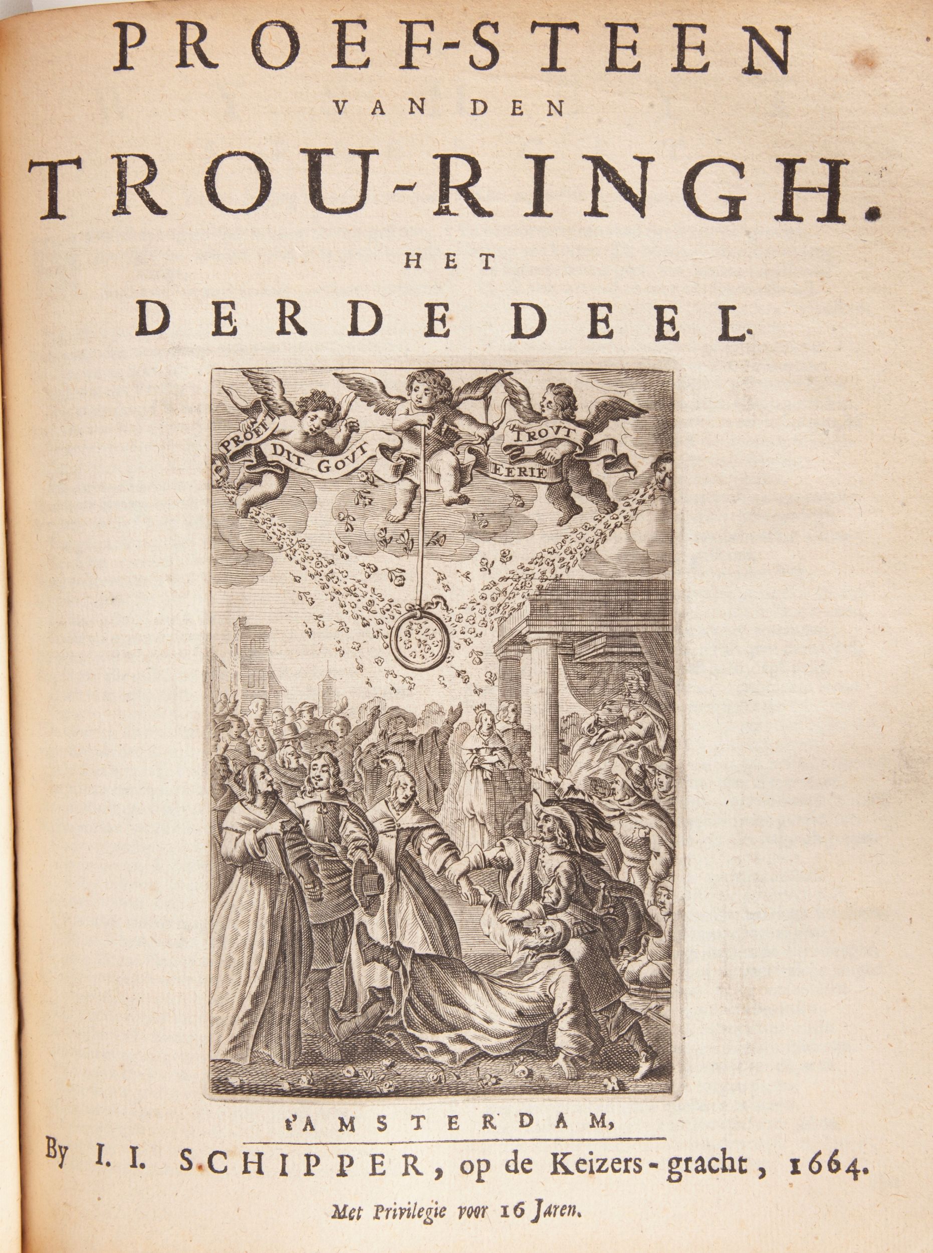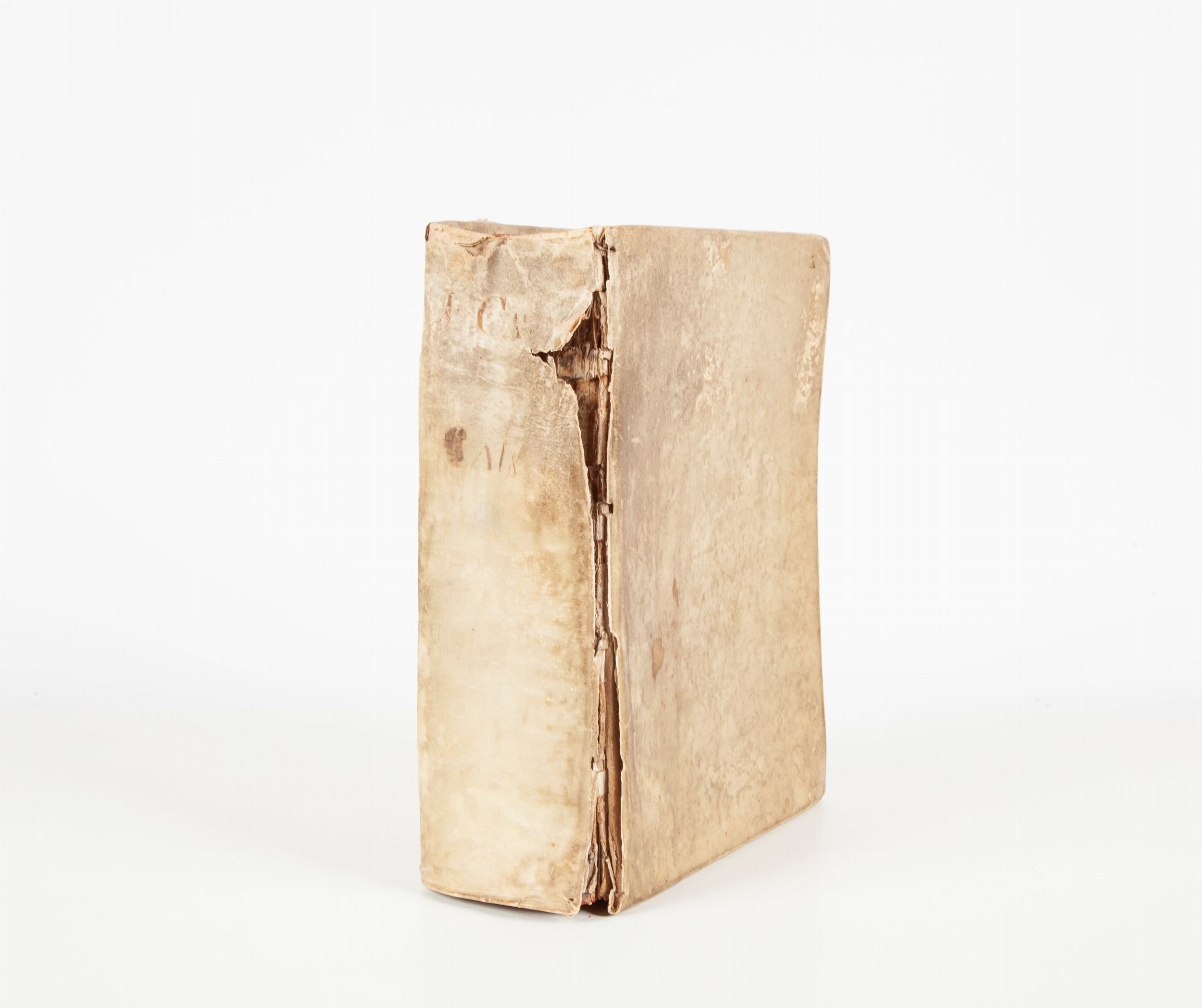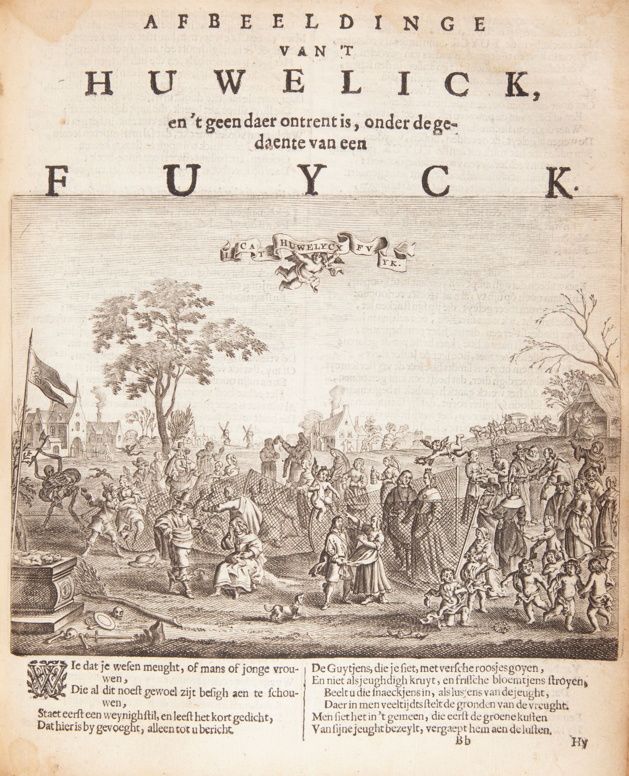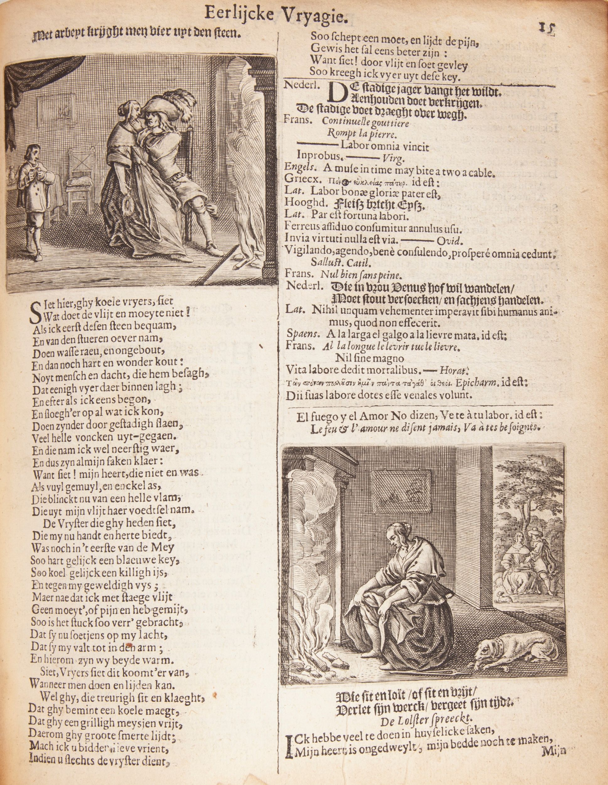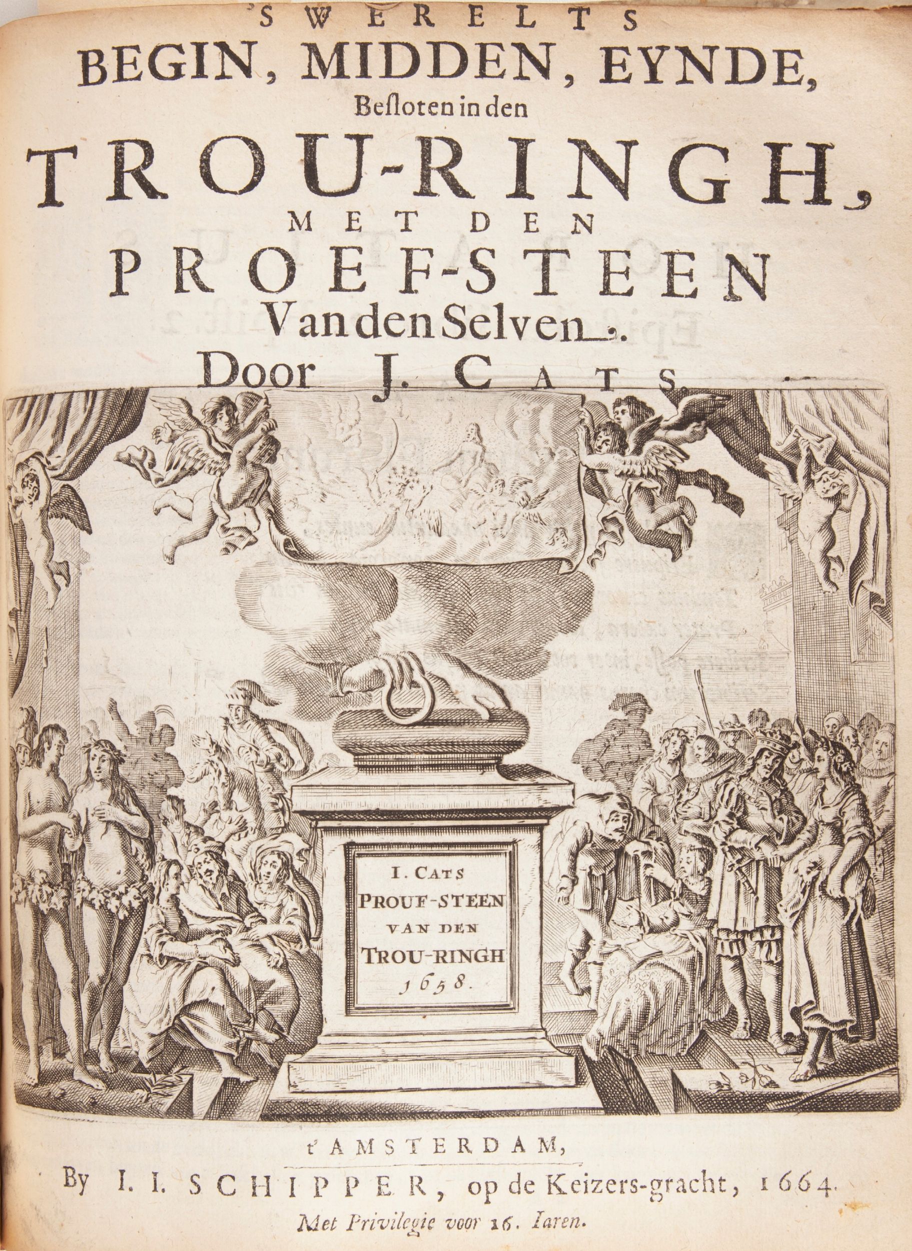 Jan Jacobsz Schipper, Amsterdam 1665 In 4°. Edizione riccamente illustrata di tutte le opere pubblicate di Jacob Cats (1577-1660), uno dei più grandi poeti ed umoristi dell'Età dell'oro olandese ed uno dei suoi più grandi statisti. Sebbene non abbia pubblicato nulla fino all'età di quarant'anni è stato molto prolifico per il resto della sua lunga vita. Ha scritto per un vasto pubblico e molte delle sue opere sono state illustrate con emblematiche lastre di rame dei più grandi artisti olandesi, in particolare Adriaen van de Venne, autore di molte incisioni della presente edizione. Il libro include Cats's Proteus, of Sinne- en minnebeelden (1618), Houwelyck (1625) Spiegel (1631) e molti altri. Opere come queste gli valsero l'appellativo di 'padre Gatti', per il carattere didattico e pedagogico dei suoi testi. Frontespizio figurato col ritratto dell'autore con strappi. Alcuni strappi ai margini esterni di alcune pagine , che non interessano se non marginalmente il testo o le illustrazioni, macchie occasionali e segni marginali. Esemplare leggermente rifilato nella parte superiore. Piena pergamena coeva con titolo manoscritto al dorso (difetti).