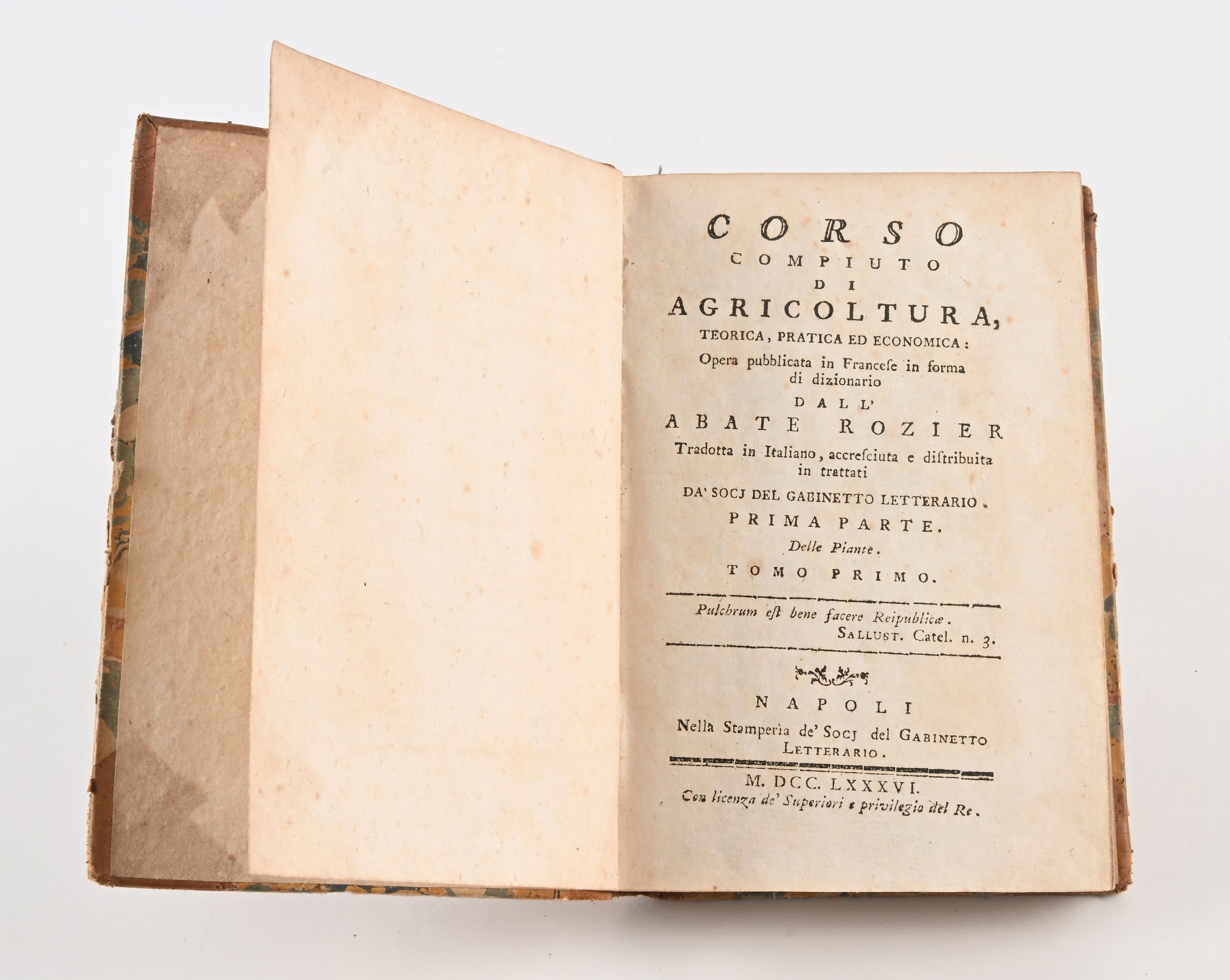 cm 19x13 In 8°. Prima edizione italiana di uno dei più imponenti repertori di agricoltura e di economia rurale e domestica dati alle stampe alla fine del XVIII secolo, opera del celebre botanico e professore di medicina francese, direttore dell'Orto botanico di Lione, che ha cambiato profondamente non solo i metodi di coltivazione dell'epoca ma anche le abitudini culinarie. Curiose le ricette su come fare il vino (Porto, Moscatello, Vermuth ed Aleatico) in appendice all'ultimo volume. Mancante del secondo volume della seconda parte dell'economia degli animali. Legatura in mezza pelle con angoli in pelle, titoli su tasselli e fregi in oro ai dorsi.