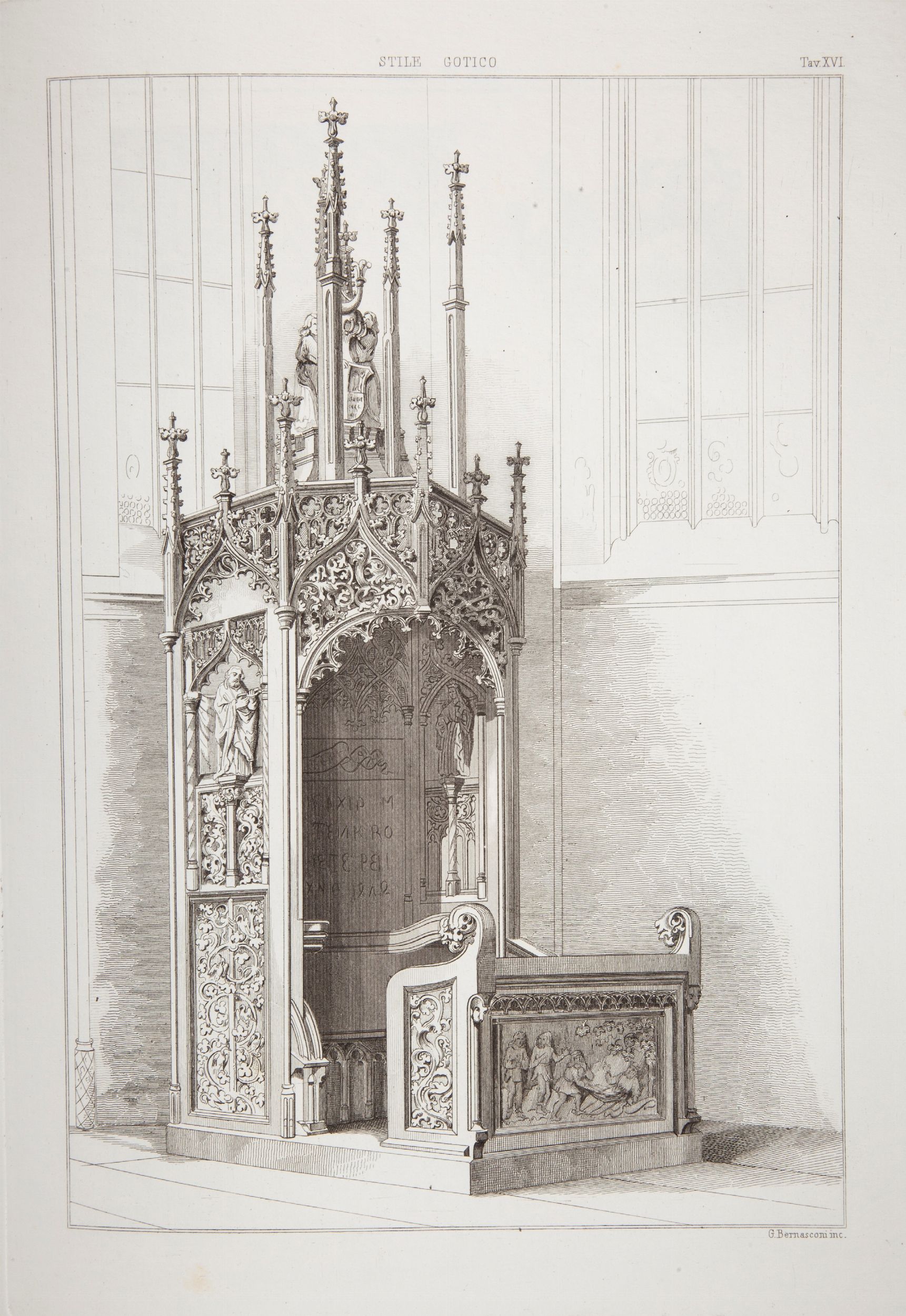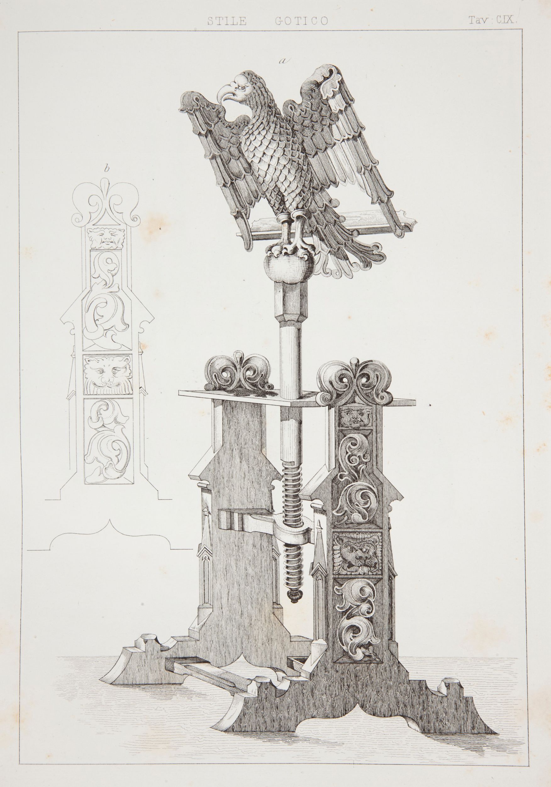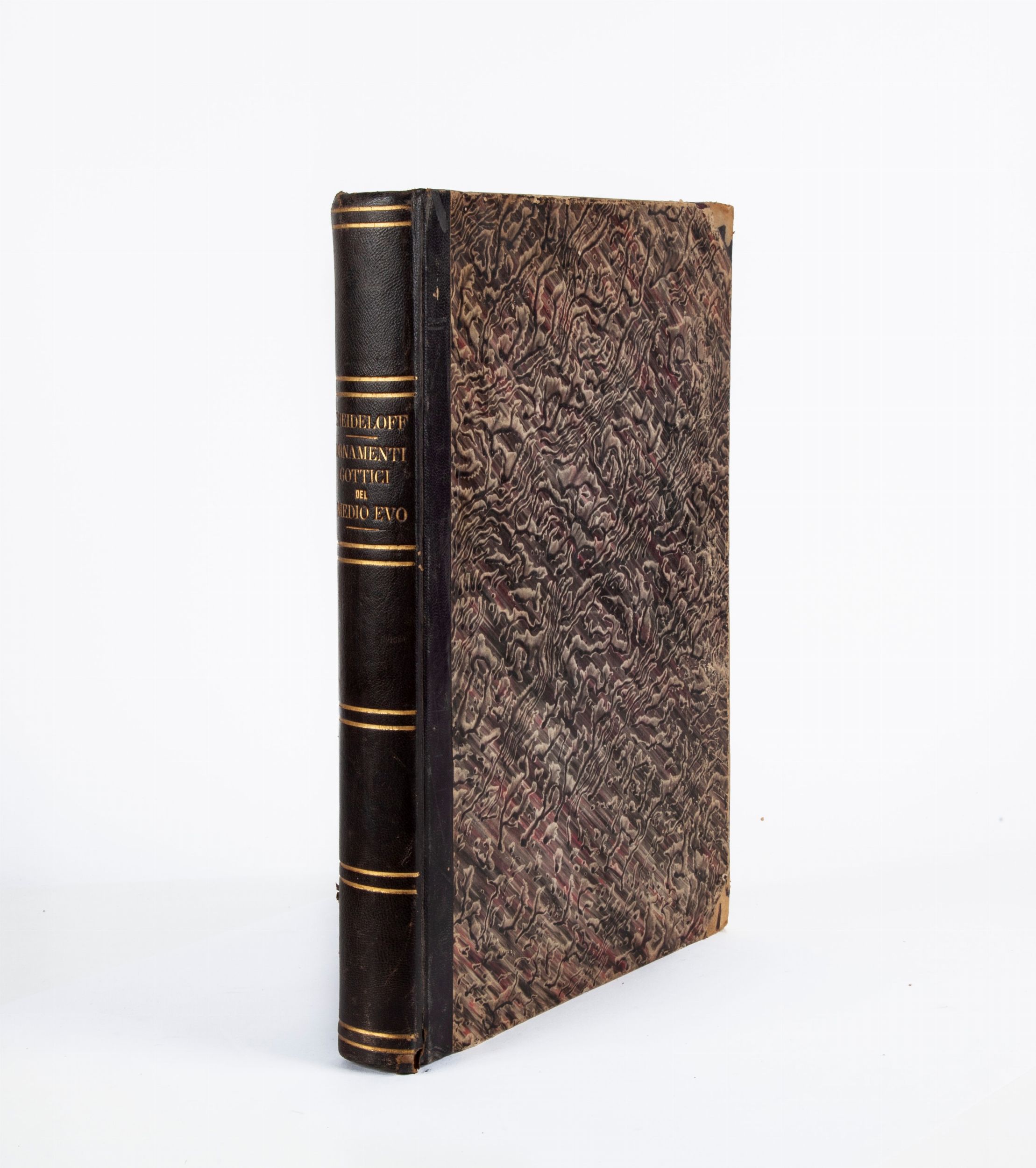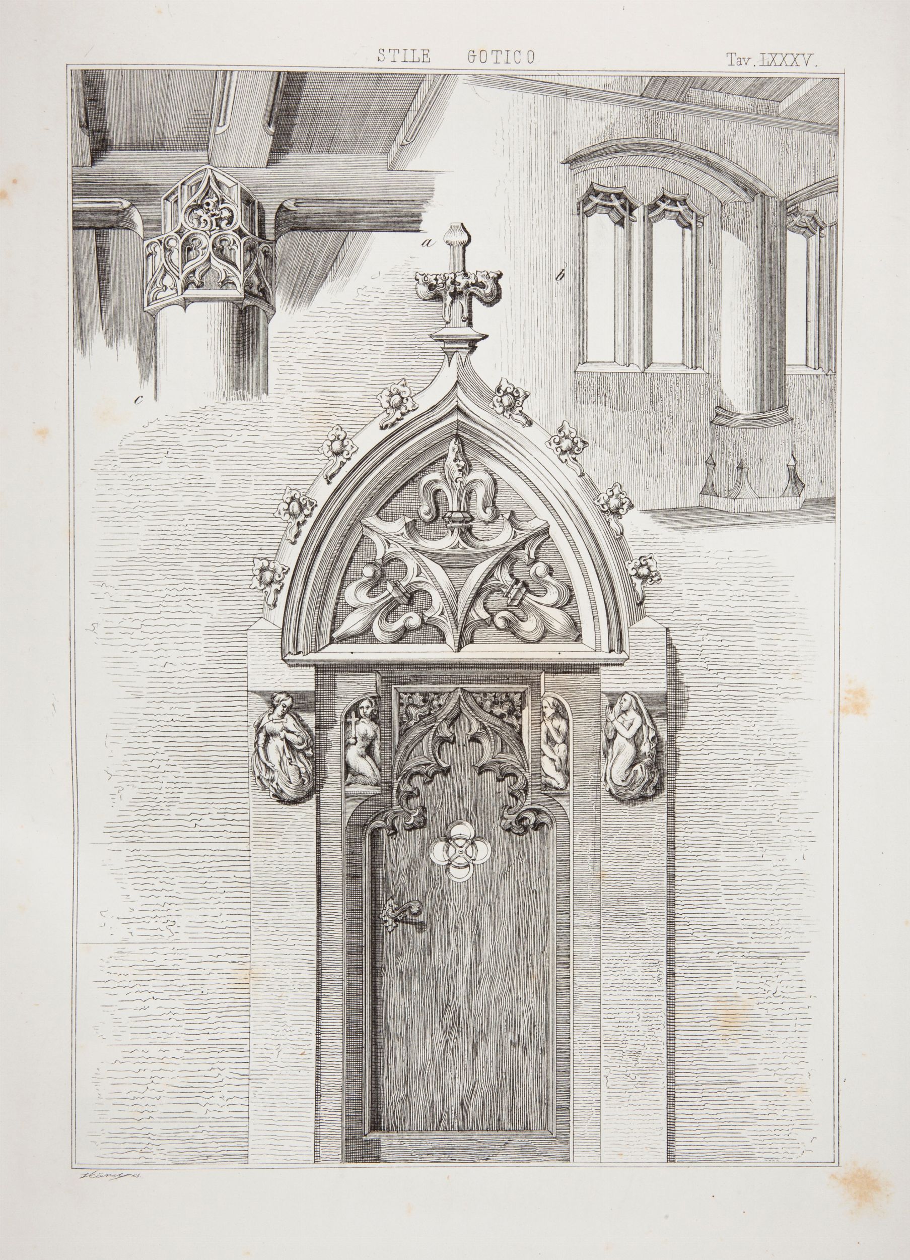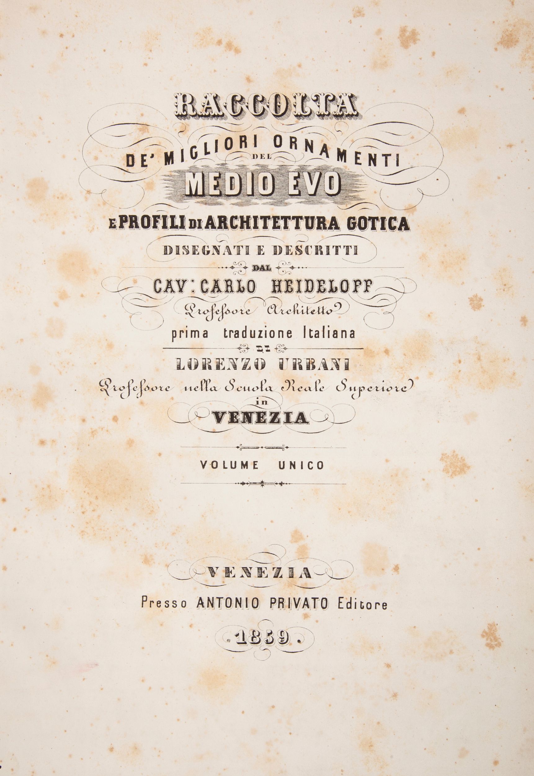 cm 35x25,5 Venezia 1859 Frontespizio inciso, pp. 58 di testo + 133 tavole fuori testo incise in litografia, di questo affascinante repertorio iconografico dedicato all'ornamento medievale. Legatura coeva in mezza pelle con titolo in oro al dorso.