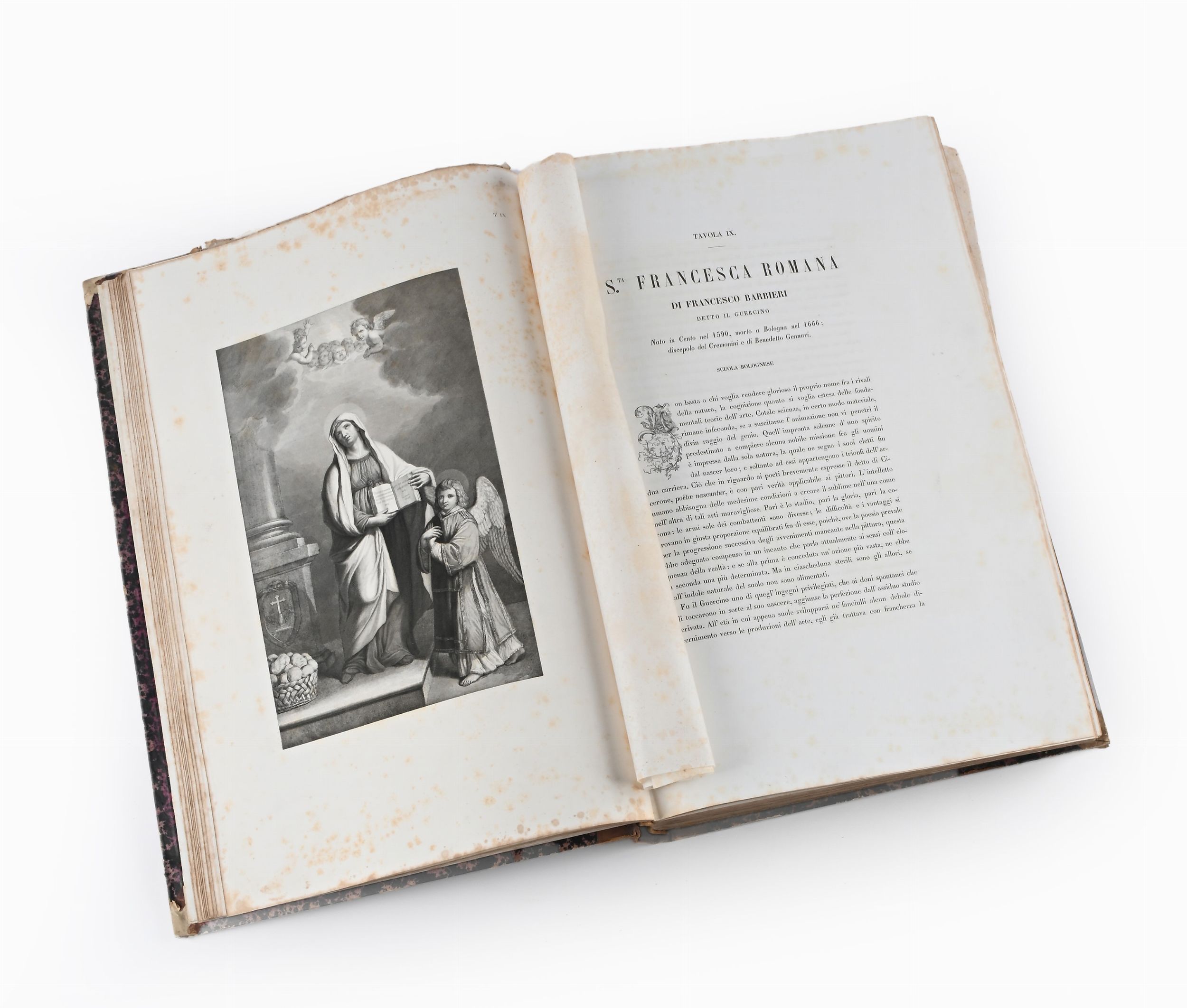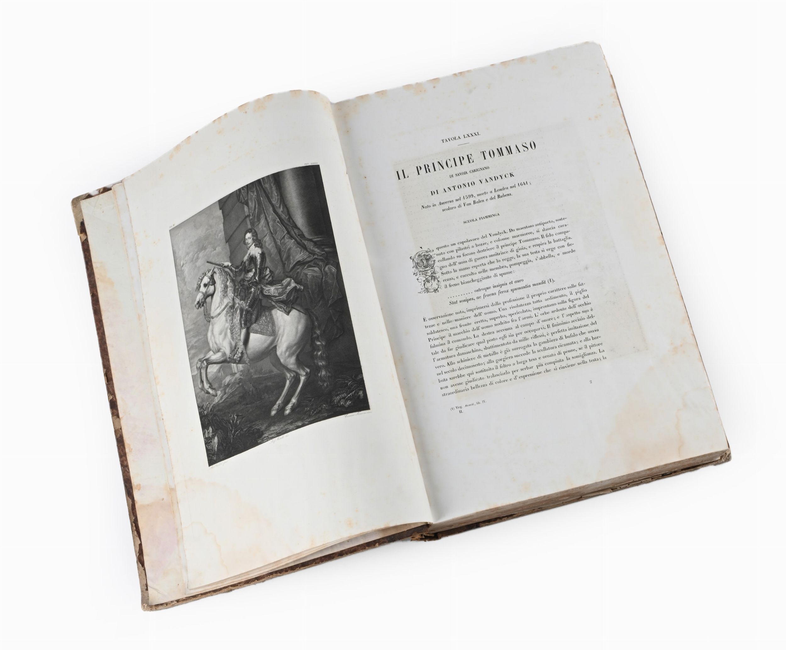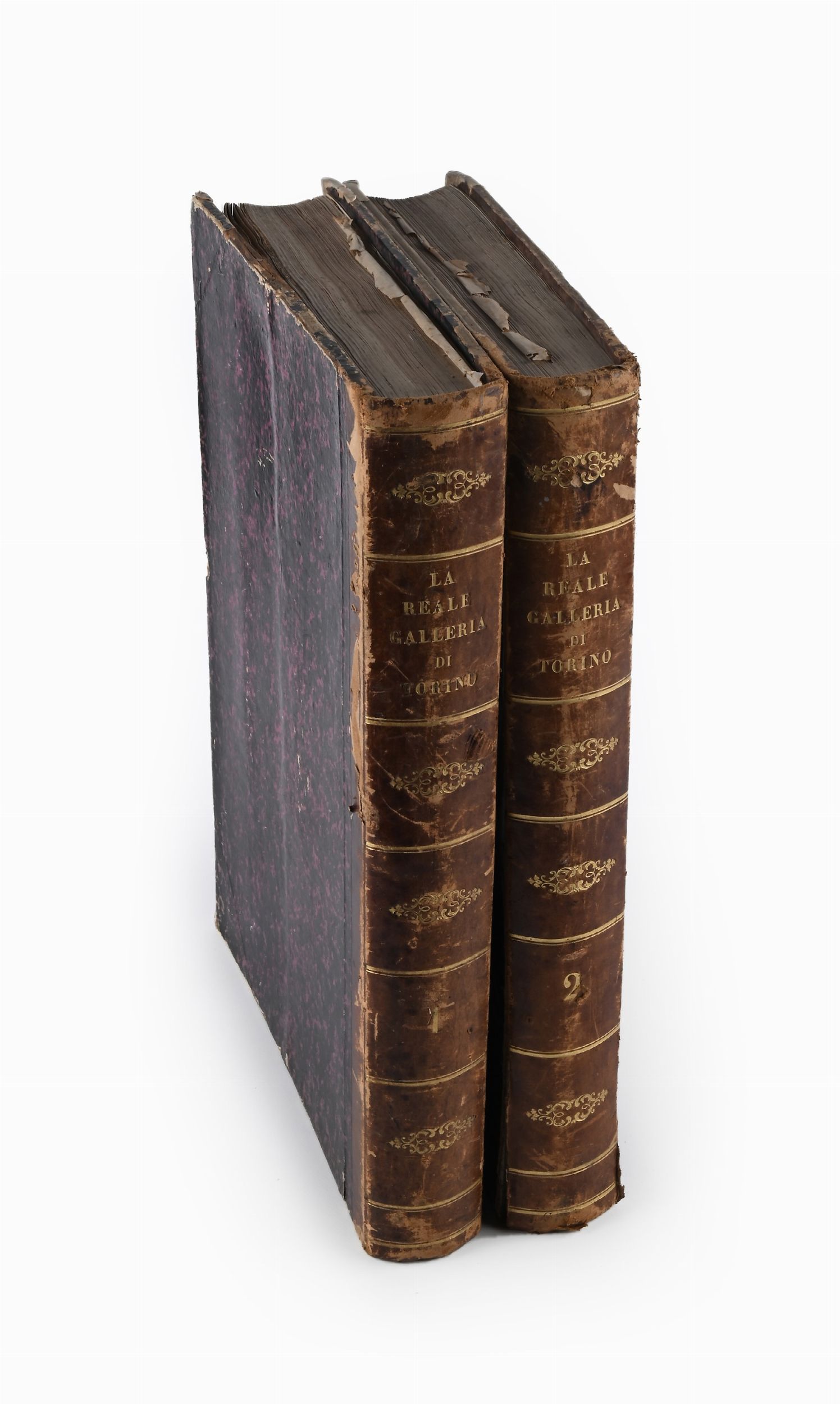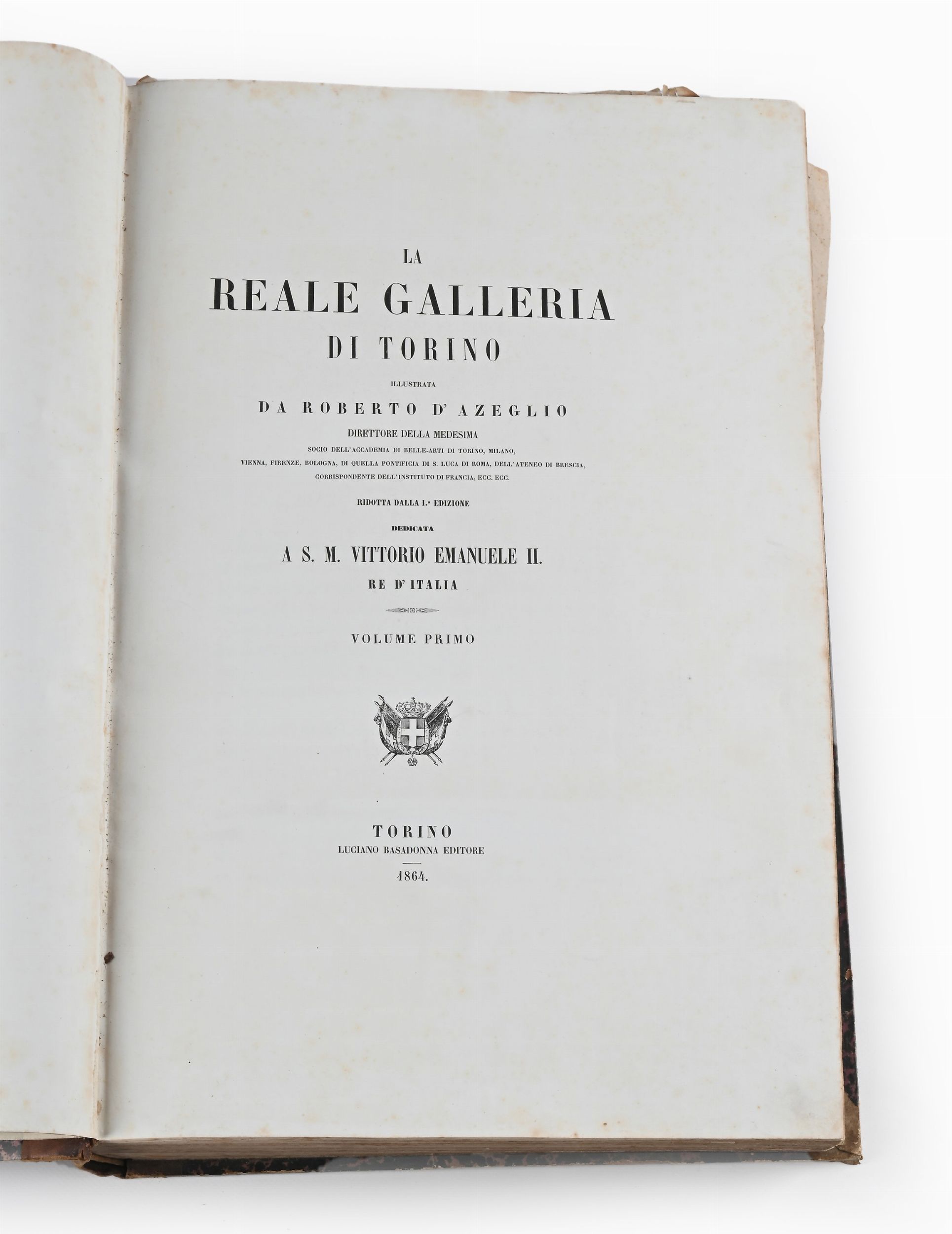 Luciano Basadonna, Torino 1864 In folio grande. Nel primo volume Ritratto di Vittorio Emanuele II ed 80 tavole; nel secondo tavole numerate da 81 a 164. Complessivamente 165 tavole tutte con protezioni in carta velina. Seconda edizione (la prima del 1836) del primo catalogo illustrante la 'Regia Galleria' di Palazzo Madama, oggi conosciuta come Galleria Sabauda, ​​inaugurata ed aperta al pubblico il 2 ottobre 1832 per volontà di Carlo Alberto e diventata una delle pinacoteche più importanti d'Italia, che raccoglieva le collezioni di Palazzo Reale e Palazzo Carignano a Torino e Palazzo Durazzo a Genova (acquistate nel 1824). Testo di D'Azeglio, curatore e fondatore del museo, nonché autore delle descrizioni dei dipinti. Legatura coeva in mezza pelle marrone con titolo e fregi in oro al dorso. Lievi difetti e mancanze alla legatura, internamente numerose fioriture e gore.