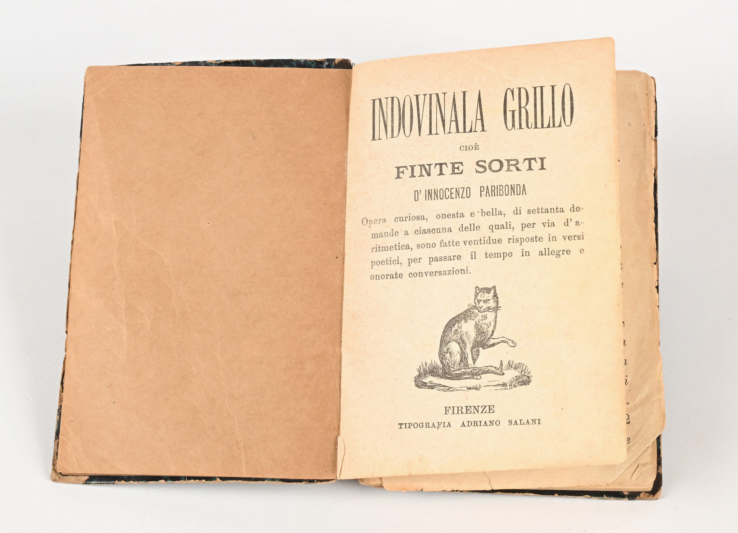 cm 15,5x10,5 Francesco Rocca, Palermo 1846 In 16° Interessante elenco dei medicamenti omeopatici dell'epoca. Legatura coeva in percallina. Insieme: Indovinala Grillo cioè finte sorti d'Innocenzo Paribonda. Salani, Firenze anni '30. Legatura in cartonato d'epoca cm 15x10,5