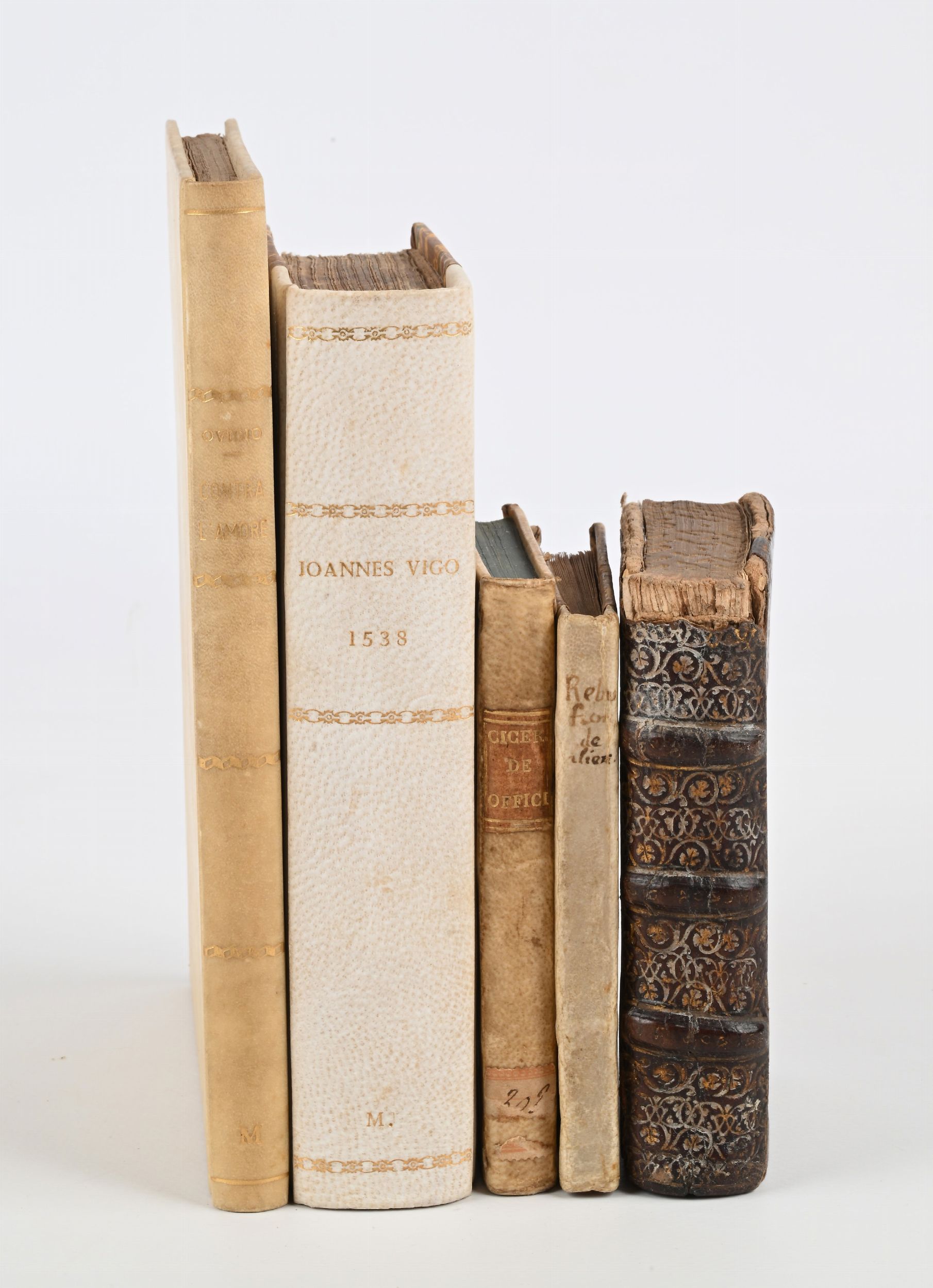 - De rimedi contra l'amore ridotti in ottava rima da M. Angelo Ingegneri gli due libri di Ovidio. Pietro Rosso, Avignone 1576. In 4°. Cm. 19,5x14. Legatura in piena pergamena con titolo in oro al dorso. - De Officiis, M.T.Ciceronis Libri tres. Item, De Amicitia, De Senectute: Paradoxa: & Somnio Scipionis. Antonio Vincentino, Lione 1560. In 16°. Cm. 12x7,5. Legatura in piena pergamena settecentesca con titolo in oro su tassello in pelle al dorso. - Pierre Rebuffi, Compendium alienationum rerum ecclesiae, in forensi iudicio. Arnoldo e Carlo Angeliers, Parigi 1541. In 16°. Cm. 11,5x8,5. Legatura sette-ottocentesca in mezza pergamena con titolo manoscritto al dorso. - Aurelii Prudentii Clementis viri Consularis, rerum divinarum, religionis Christianae, iuris item civilis & militaris peritia excellentis opera. De Tournes, Lione 1553. In 16°. Cm. 12,5x8. Lavori di tarlo alle prime sette carte con perdite di testo, frontespizio restaurato. Legatura coeva in pelle con 3 nervi. - Joannes de Vigo Secunda pars practice. 1538. In 4°. Cm. 17,5x12. Legatura in mezza pergamena novecentesca con titolo in oro al dorso. Scompleto, solo 2a parte. Mancanza di carte e restauri.
