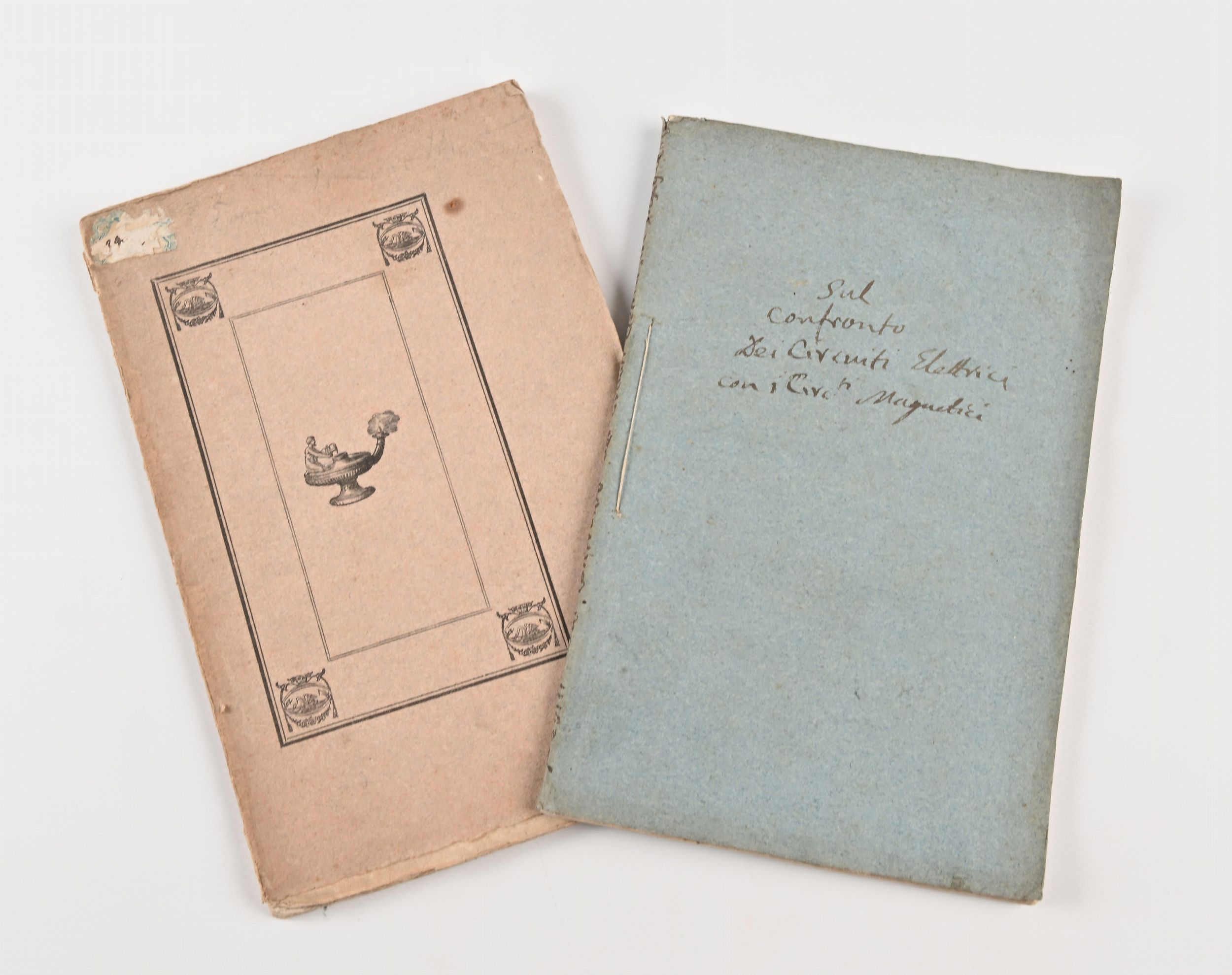 cm 22,5x14,5 Fratelli Nistri, Pisa 1839 In 8° Tavola incisa ripiegata in fine. Puccinotti viene considerato il primo medico clinico italiano, avversato dall'ambiente medico ufficiale del tempo. Amico di Leopardi le cui pagine dello Zibaldone a carattere medico sembrano dovute proprio alla lettura di Puccinotti. Condusse ricerche sull'elettrofisiologia con Pacinotti. Esemplare intonso con legatura in brossura editoriale coeva. 2) Leopoldo Nobili - Sul confronto dei circuiti elettrici coi circuiti magnetici e sul calore intestino della terra. Eredi Soliani, Modena 1838. Operetta postuma di uno dei maggiori fisici italiani dell'800, inventore lucchese realizzò il galvanometro basato su aghi astatici, strumento fondamentale nella storia dell'elettromagnetismo, realizzò la pila termoelettrica con Melloni e realizzò importanti esperimenti sull'induzione elettromagnetica scoperta da Michael Faraday. Legatura in brossura editoriale con titolo manoscritto al piatto.