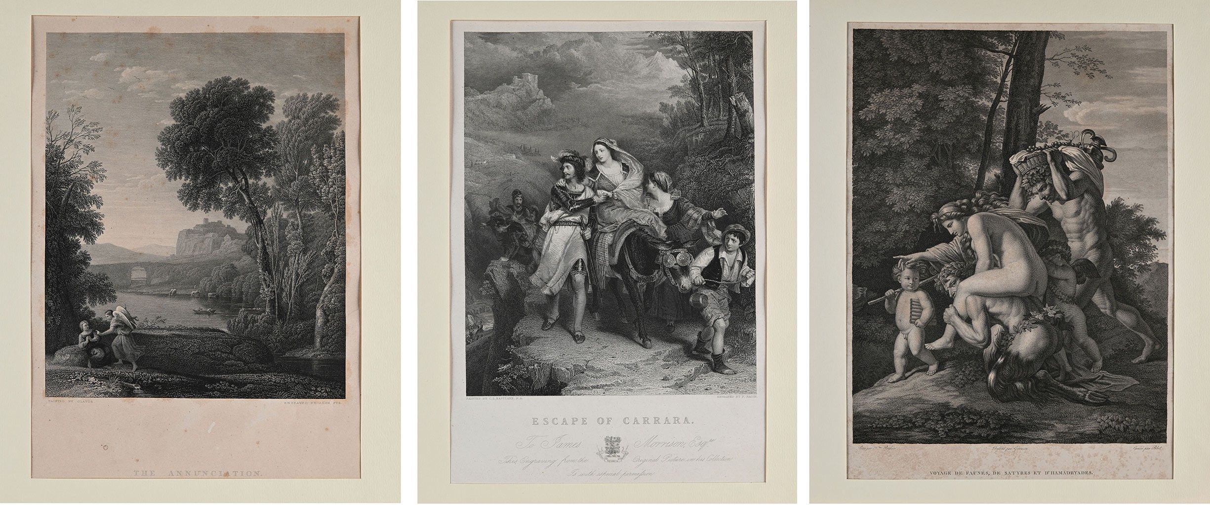post 1800 - ante 1815 Viaggio di fauni, satiri e amadriadi da un'invenzione di Poussin. Blot incisore parigino, allievo di A. De Saint-Aubin, autore di opere di riproduzione, fra le quali la più nota é Le Verrou da Fragonard. - Claude Lorrain, The Annunciation, incisione in acciaio di John Pye, stampato da Mc Queen cm 35x25. Dall'opera presente della National Gallery. - Charles Lock Eastlake R.A., Escape of Carrara, Inciso da Francis Bacon cm 36x25. Dall'opera la Fuga di Francesco Novello Carrara dal duca di Milano, dipinta dal maestro del Romanticismo inglese Eastlake, episodio del 1389 che raffigura l'ultimo signore di Padova che fugge da Gian Galeazzo Visconti, tratto da una Storia delle repubbliche italiane nel Medioevo di Simondo de Sismondi . Entro passepartout moderno