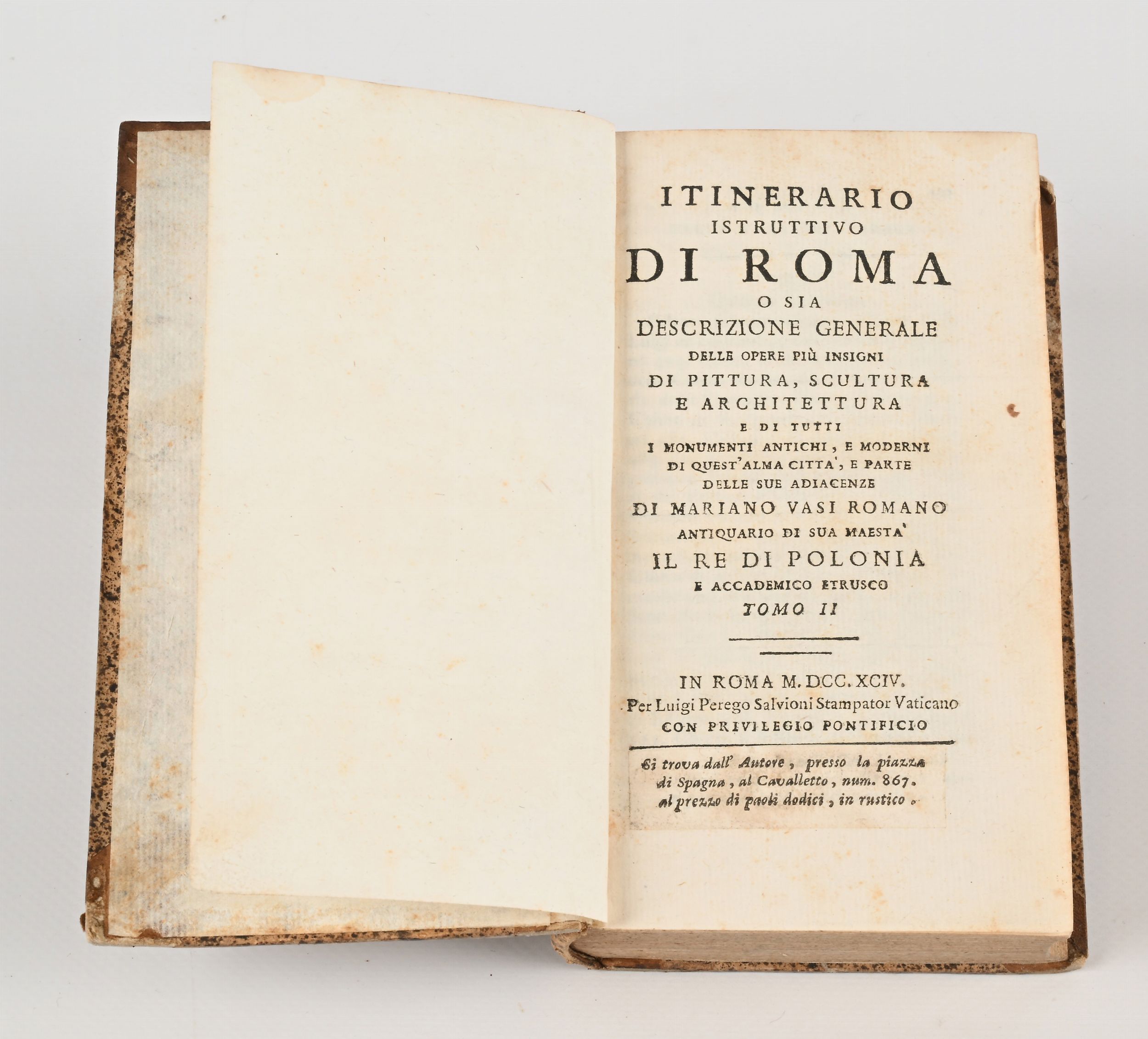 cm 17x10,5 Luigi Perego Salvioni, Roma 1794 In 8° Una tra le più celebri guide turistiche di Roma del tempo, illustrata con un ritratto di Pio VI fuori testo, 2 cartine ripiegate di Roma antica e moderna, e numerose incisioni di monumenti e chiese di Roma e vedute di alcune località limitrofe ad opera di Mariano Vasi. Legature coeve in mezza pelle con angoli in pelle e titoli in oro su tasselli ai dorsi