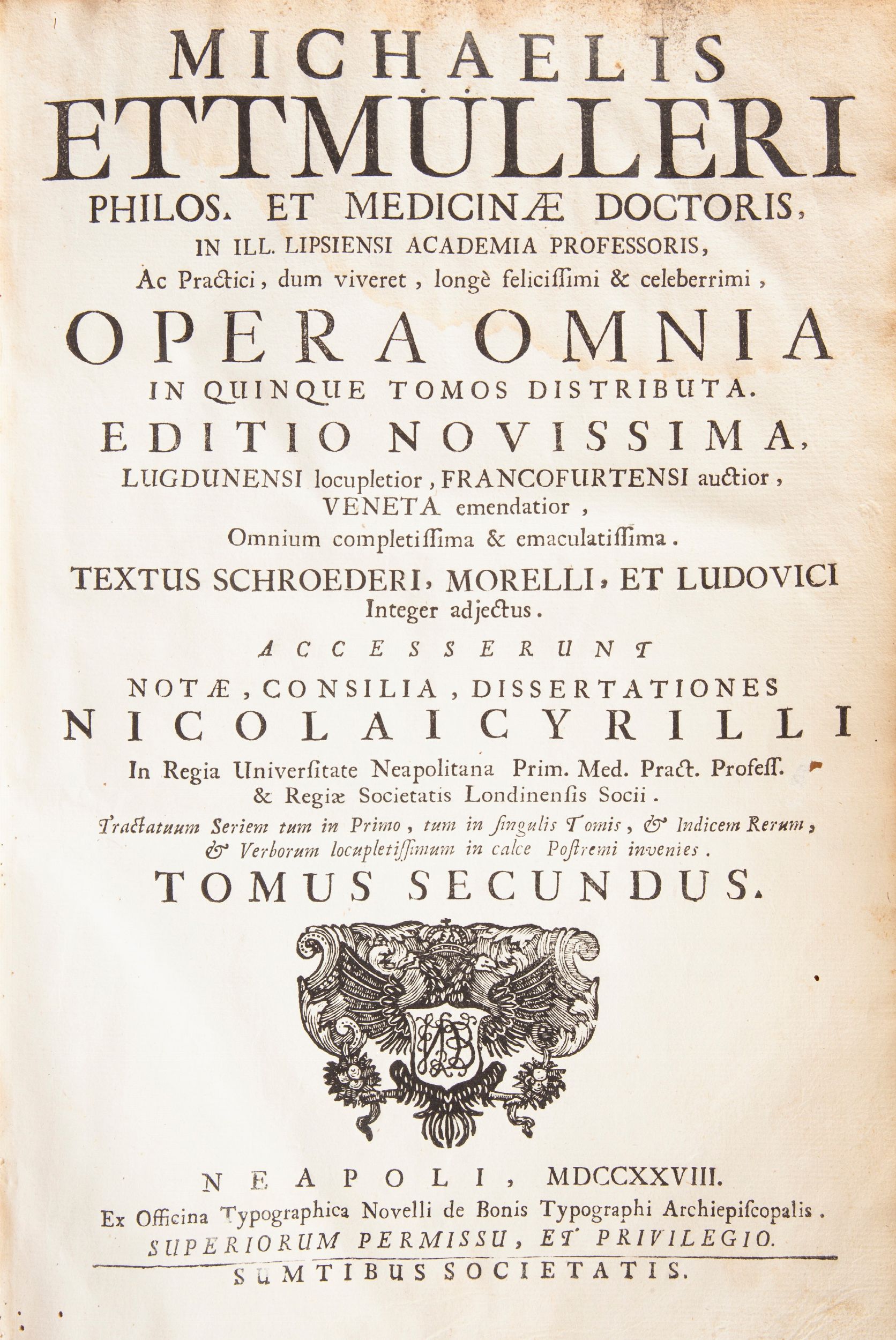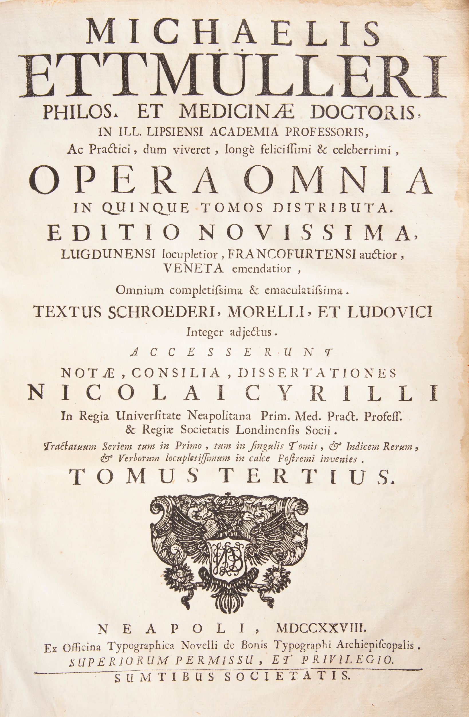 cm 36x24,5 Novelli De Bonis, Napoli 1728 In folio. 5 Volumi. Edizione napoletana dell'opera del medico e professore di chirurgia ed anatomia tedesco Michael Ettmuller con i commenti e le note di Niccolò Cirillo, esemplata sulla prima di Lione e sulle successive di Francoforte e della prima italiana stampata a Venezia. In fine al primo volume è presente la tavola a piena pagina. Legature in piena pergamena coeva con titoli manoscritti ai dorsi. Lavori di tarlo.