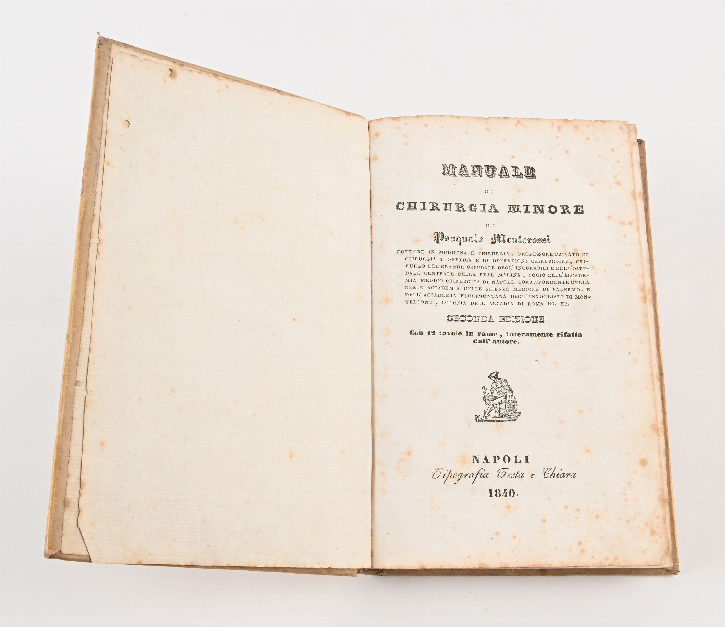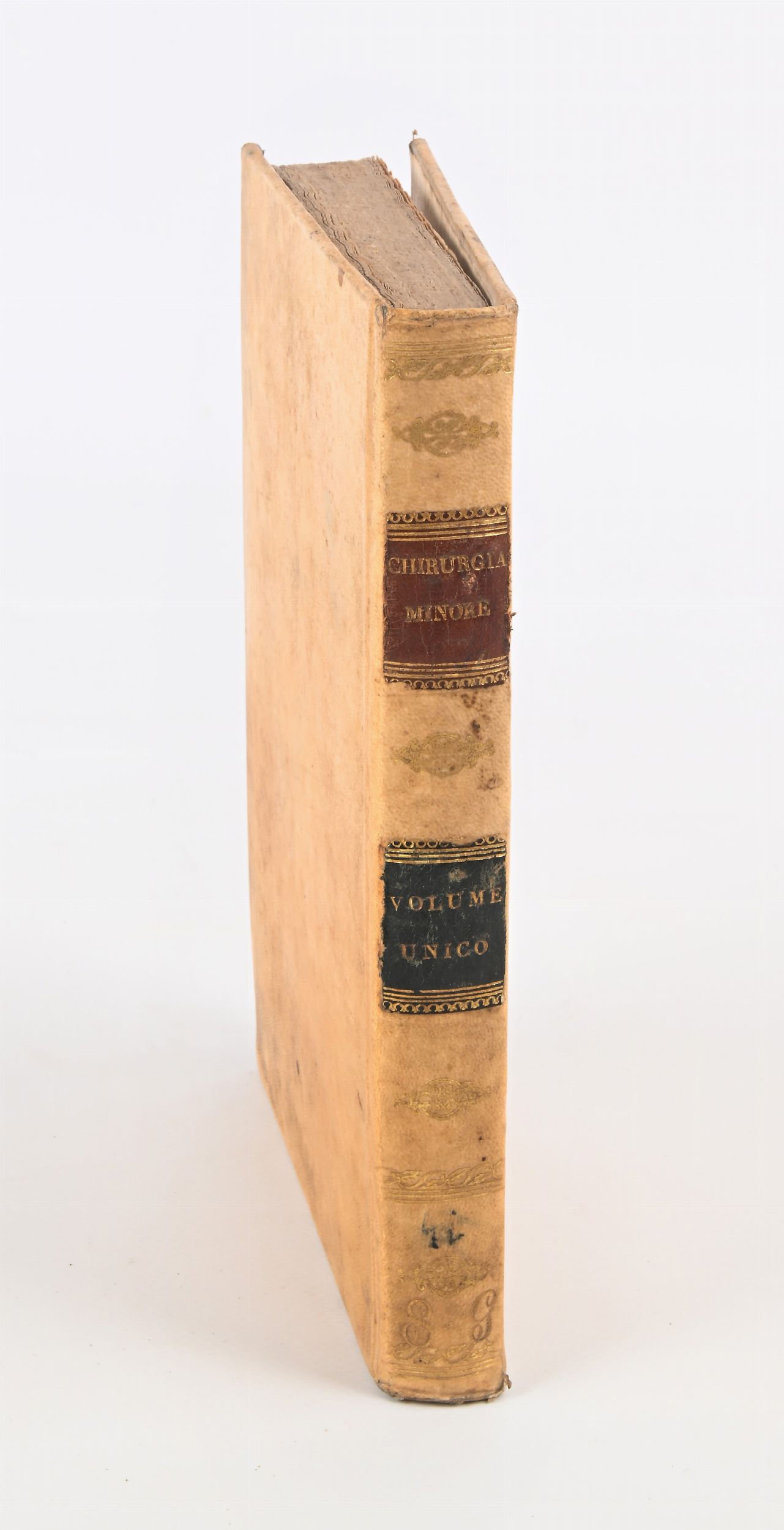 Testa e Chiara, Napoli 1840 In 8°. Seconda edizione illustrata con 12 incisioni più volte ripiegate che segue la prima del 1834 (illustrata da sole 6 tavole). L'opera tratta del salasso e delle varie tecniche per praticarlo (flebotomia, con precetti sul taglio della vena, salasso del braccio, della giugulare, della mano, del piede, mediante applicazione delle mignatte, con i metodi di raccolta e conservazione delle mignatte). Segue la trattazione delle punture e dell'ago-puntura, dell'utilizzo delle coppe, dei vescicatori, del cauterio, dell'applicazione della moxa, dell'inoculazione del vaiolo, della perforazione del lobo dell'orecchio, dell'estrazione dei denti… L'autore, nato nel 1805 in Calabria, divenne medico e poi chirurgo dell'Ospedale della Real Marina e dell'Ospedale degl'Incurabili. Legatura in piena pergamena coeva con tasselli in pelle al dorso e fregi a secco.