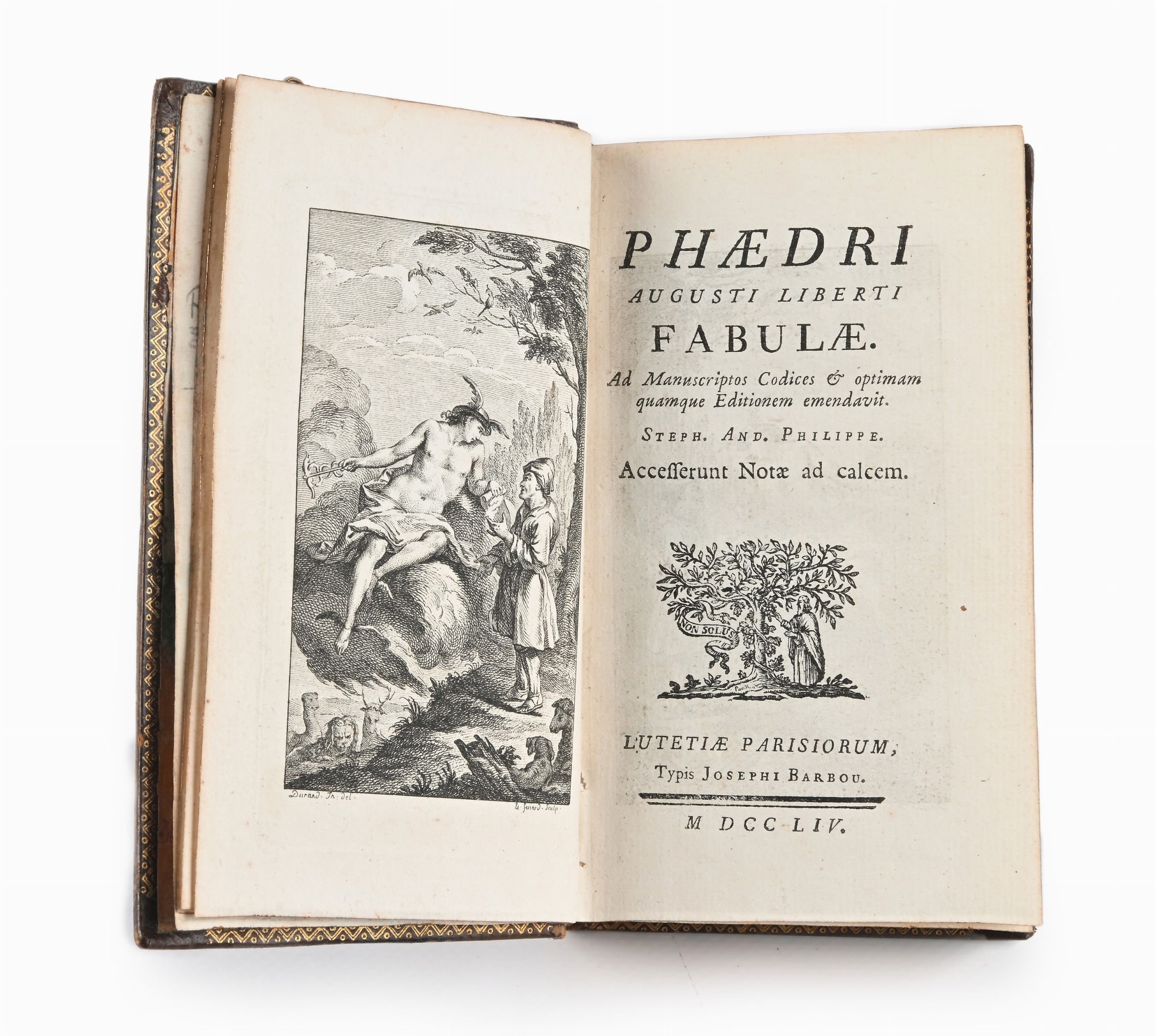Parigi 1754 Bella legatura in tutta pelle a 5 nervi con titolo e decorazioni in oro al dorso e stemmi a 4 angoli, sia del piatto che del dorso. Bella incisione in antiporta, testatine e capilettera. Copia molto fresca. Tagli in oro.