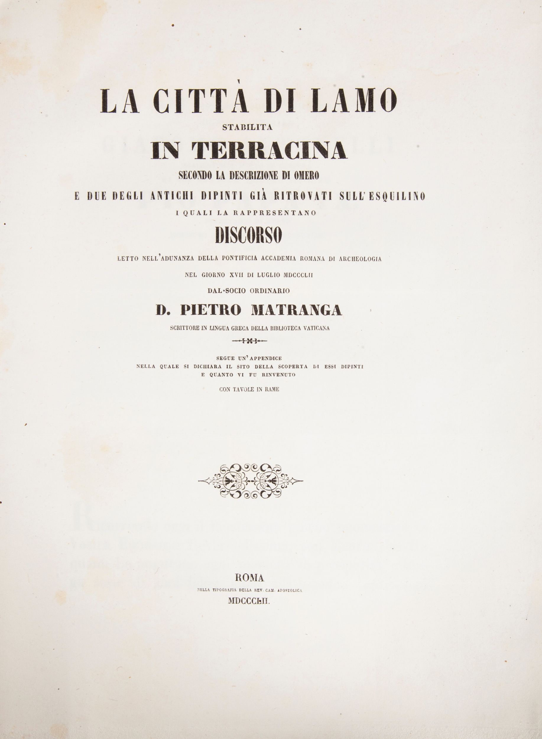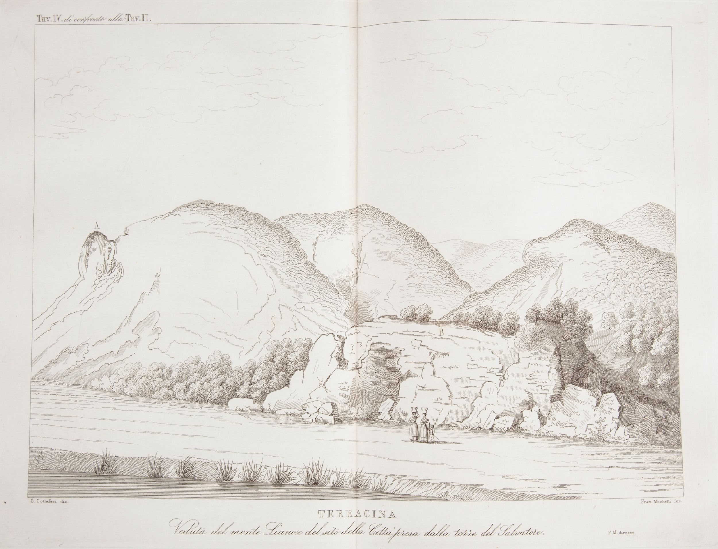cm 33x25 Tipografia Rev. Camera Apostolica, Roma 1852 11 Tavole doppie fuori testo disegnate da GIACONIA e COTTAFAVI, incise da Francesco MOCHETTI; tra le quali 2 vedute con il Pisco Montano, il monte Liano di Terracina; una bella veduta della Porta di Teodorico scoperta nel 1852 nel giardino Venditti, dell'Ing. MOLLARI incisa dal CICCONETTI; le altre tavole con dettagli di reperti e scavi in via Graziosa e di alcune lapidi di Terracina. Legatura in brossura di un altro volume. Intonso.