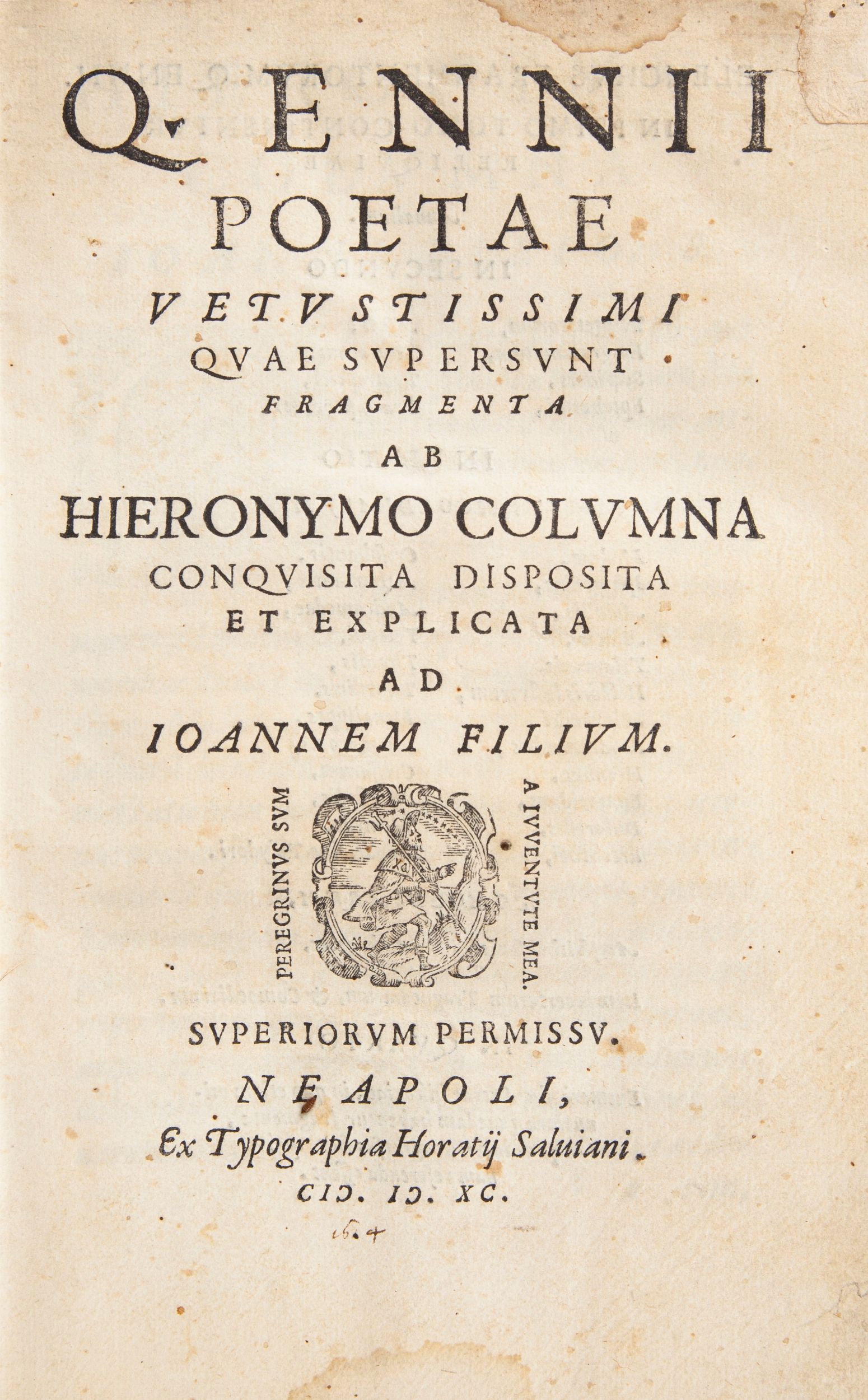 Orazio Salviani, Napoli 1590 Edizione originale completa, divisa in quattro libri, tra cui gli annali, le commedie, le tragedie, Evemero o storia sacra e una biografia del poeta latino. Opera dell'erudito Girolamo Colonna (Napoli 1534-1586), tenuta in grande considerazione dagli studiosi del poeta e drammaturgo latino Ennio fino a tutto l'Ottocento (una prima edizione parziale è del 1585). Pubblicata postuma dal figlio Giovanni è l'unico scritto giunto a noi del Colonna, padre del più noto linceo Fabio. Legatura coeva in piena pergamena con titolo manoscritto al dorso. Restauro al frontespizio. Parzialmente slegato.