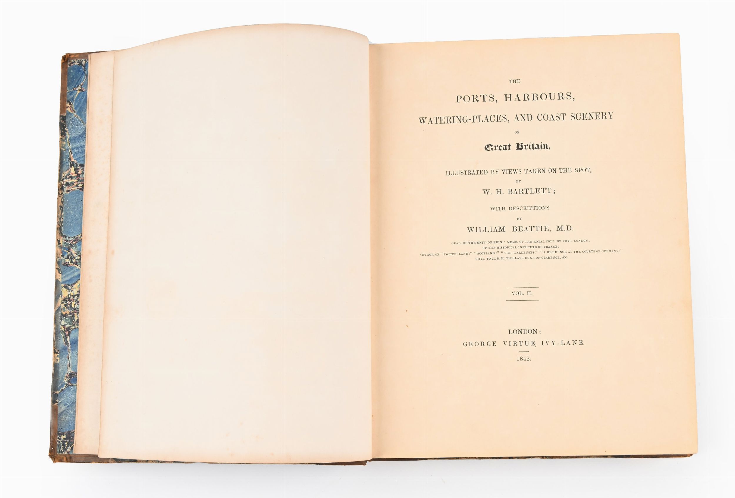 George Virtue, Londra 1842 2 volumi in 4o. illustrato con 125 splendide incisioni di porti, baie, insenature e coste del Regno Unito, a piena pagina comprese quelle dei 2 frontespizi realizzate da Harding, Cooke, Balmer e Bartlett. Legatura in mezza pelle con titoli su tasselli in oro al dorso, angoli in pelle, tagli marmorizzati.