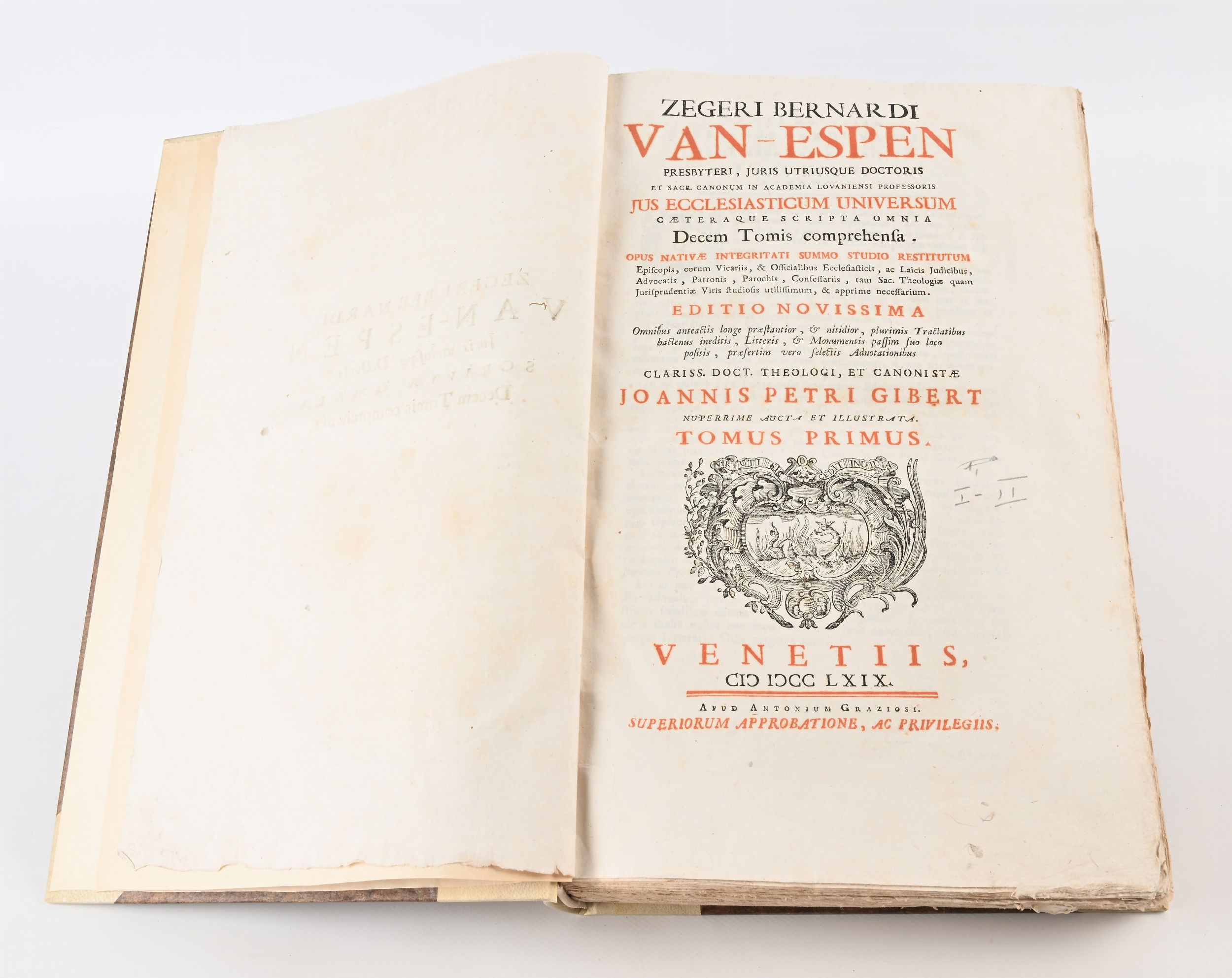 cm 41x25 Antonio Graziosi, Venezia 1769 In Folio. X tomi in 5 voll. Sigerus Bernardus Espenius fu giureconsulto e canonista belga, professore a Lovanio e importante rappresentante del movimento giansenista. La sua difesa dei diritti dei re in materia ecclesiastica e le sue posizioni gli valsero l'accusa di giansenismo e lo costrinsero a lasciare la cattedra di Lovanio per quella di Leida. Le sue teorie sul regalismo provocarono la messa all'Indice della sua opera. Appoggiando un'ordinazione episcopale presso il vescovato di Utrecht venne considerato scismatico. Legature novecentesche in mezza pergamena con angoli in pergamena e titoli su tasselli ai dorsi