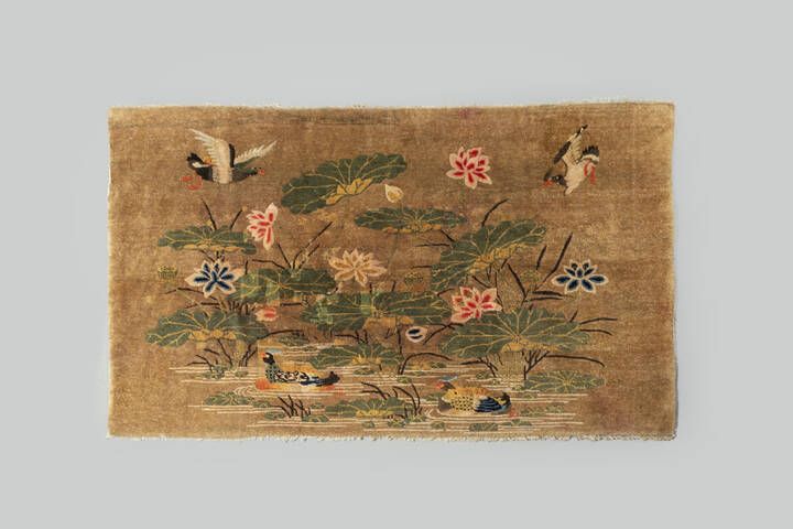 Arazzo in lana decorato con uccelli su argine di lago Tibet inizi XX Sec. 202x120 [..]