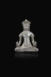 Buddha in bronzo patinato seduto nella posizione del loto Cambogia XIX Sec. 19x14 cm
