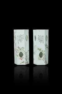 Coppia di porta cappelli in porcellana Famiglia Rosa dipinti con decori paesaggistici e iscrizioni Cina Repubblica [..]