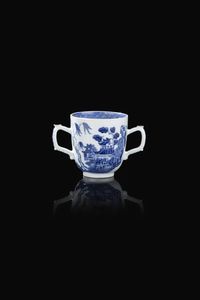 Tazzina in porcellana bianca e blu con manici decorata con paesaggio Cina dinastia Qing XVIII-XIX Sec. 7 5x11 [..]