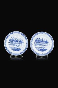Coppia di piatti in porcellana bianca e blu decorati con villaggio sul fiume Cina dinastia Quing XVIII Sec. [..]