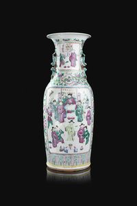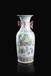 Vaso in porcellana Famiglia Rosa decorato con personaggi entro riserve Cina Repubblica XX Sec. 60x24cm