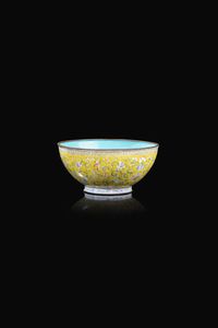 Ciotola in smalto decorata a motivi floreali e pipistrelli su sfondo giallo Cina [..]