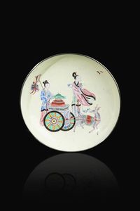 Piatto in smalto Famiglia Rosa finemente decorato con personaggi e carrozza su [..]